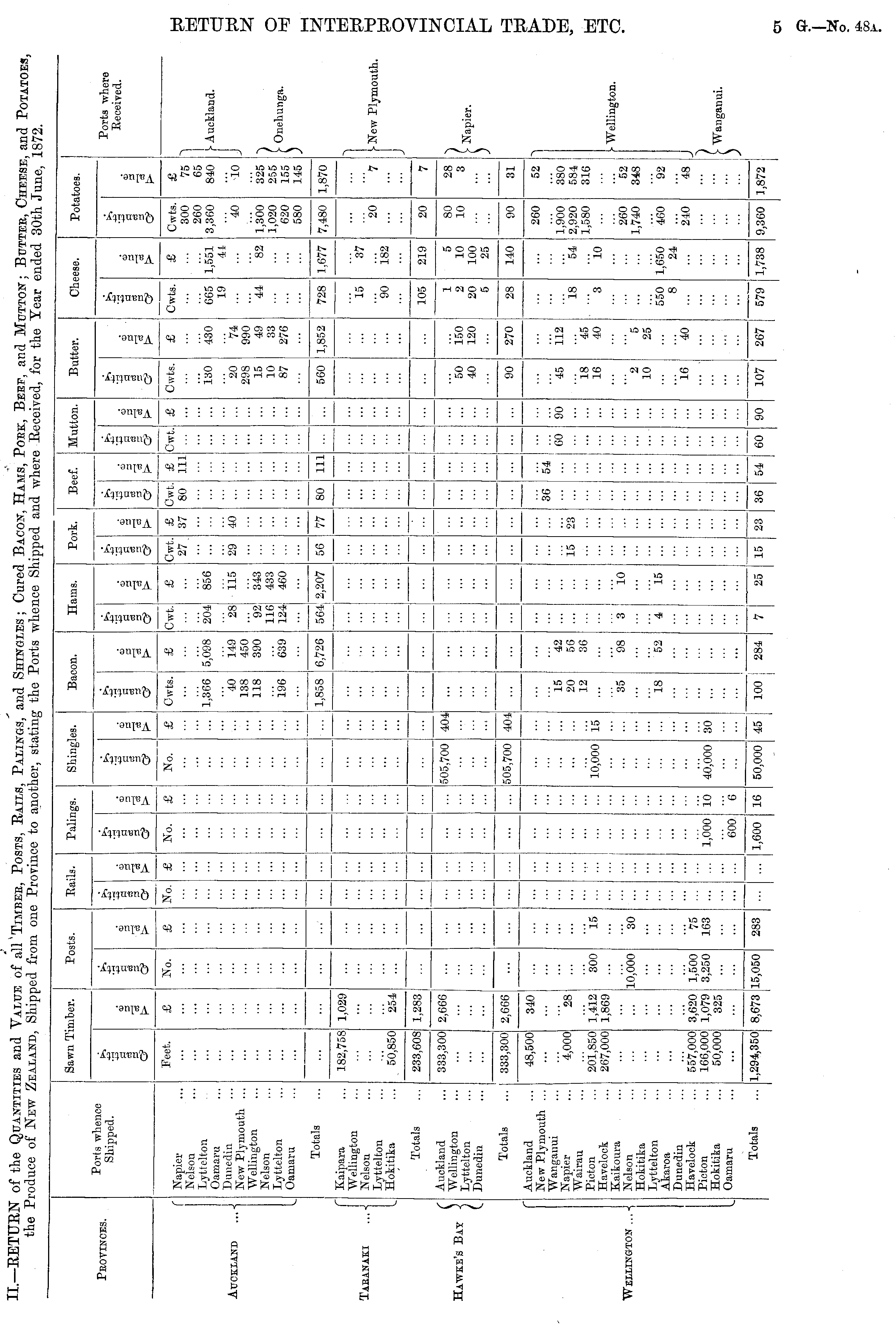 II.—RETURN of the QUANTITIES and VALUE of all TIMBER, POSTS, RAILS, PALINGS, and SHINGLES ; Cured BACON, HAMS, PORK, BEEF, and MUTTON ; BUTTER, CHEESE, and POTATOES the Produce of NEW ZEALAND, Shipped from one Province to another, stating the Ports whence Shipped and where Received, for the Tear ended 30th June, 1872.