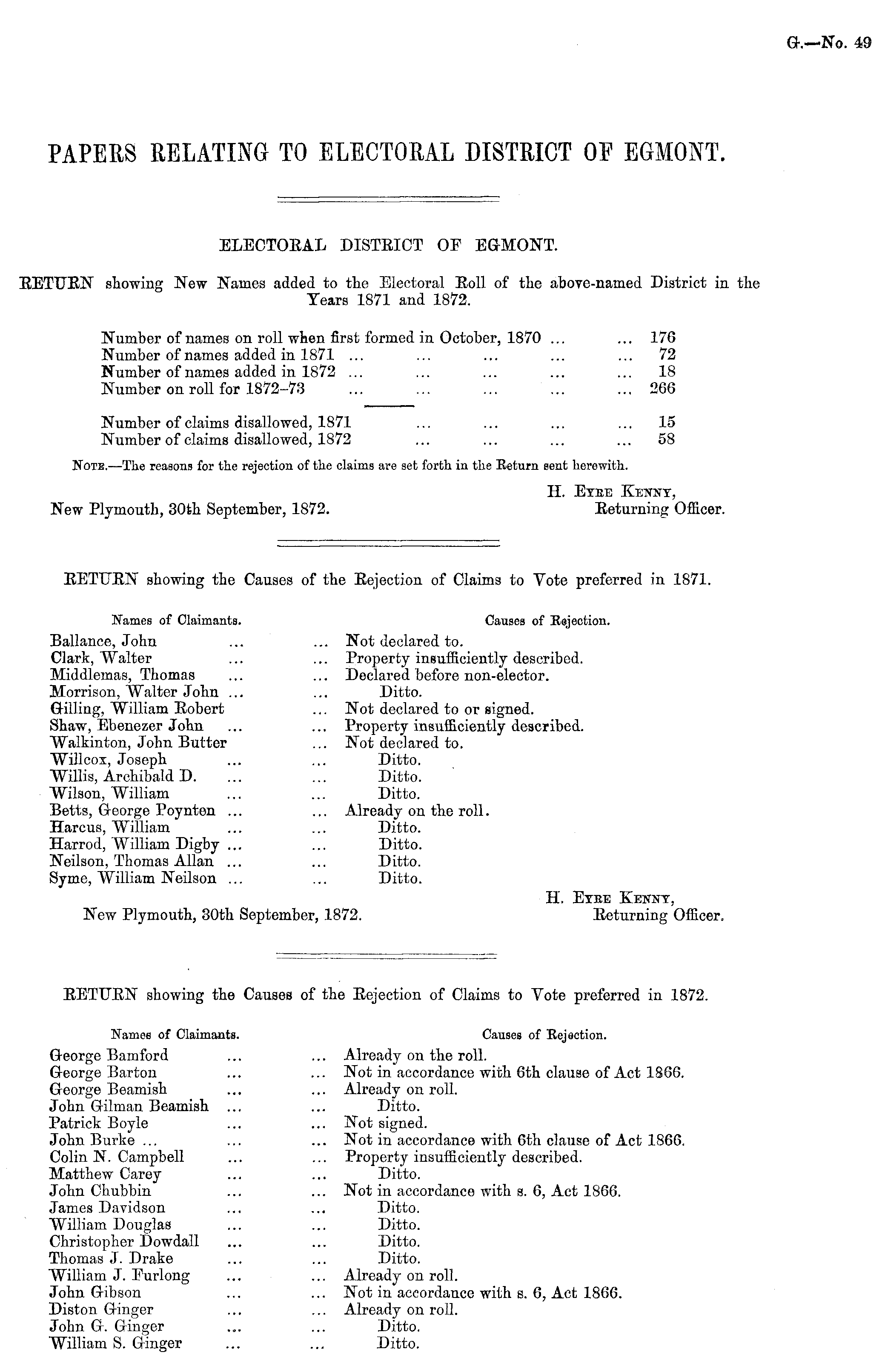 RETURN showing the Causes of the Rejection of Claims to Vote preferred in 1871. Names of Claimants. Causes of Rejection. Ballance, John ... ... Not declared to. Clark, Walter ... ... Property insufficiently described. Middlemas, Thomas ... ... Declared before non-elector. Morrison, Walter John ... ... Ditto. Gilling, William Robert ... Not declared to or signed. Shaw, Ebenezer John ... ... Property insufficiently described. Walkinton, John Butter ... Not declared to. Willcox, Joseph ... ... Ditto. Willis, Archibald D. ... ... Ditto. Wilson, William ... ... Ditto. Betts, George Poynten ... ... Already on the roll. Harcus, William ... ... Ditto. Harrod, William Digby ... ... Ditto. Neilson, Thomas Allan ... ... Ditto. Syme, William Neilson ... ... Ditto. H. Eyre Kenny, New Plymouth, 30th September, 1872. Returning Officer.