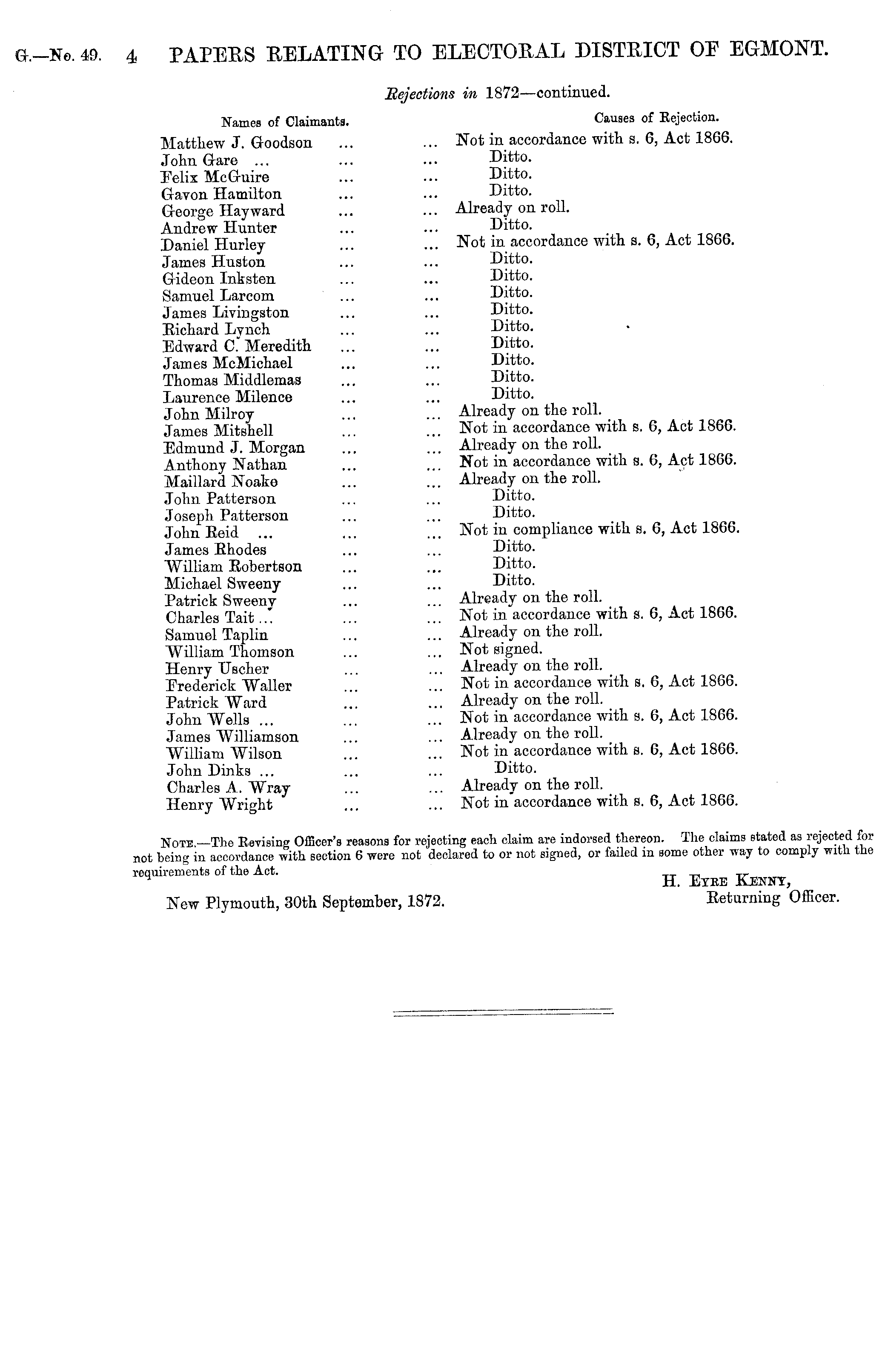 Rejections in 1872 —continued. Names of Claimants. Causes of Rejection. Matthew J. Goodson ... ... Not in accordance with s. 6, Act 1866. JohnGare ... ... ... Ditto. EelixMcGuire ... ... Ditto. Gavon Hamilton ... ... Ditto. George Hay ward ... ... Already on roll. Andrew Hunter ... ... Ditto. _,„_,_, Daniel Hurley ... ... Not in accordance with s. 6, Act 1866. James Huston ... ... Ditto. Gideon Inksten ... ... Ditto. Samuel Larcom ... ... Ditto. James Livingston ... ... Ditto. Richard Lynch ... ... Ditto. Edward C." Meredith ... ... Ditto. James McMichael ... ... Ditto. Thomas Middlemas ... ... Ditto. Laurence Milence ... ... Ditto. JohnMilroy ... ... Already on the roll. James Mitshell ... ... Not in accordance with s. 6, Act 1866. Edmund J. Morgan ... ... Already on the roll. Anthony Nathan ... ... Not in accordance with s. 6, Act 1866. Maillard Noake ... ... Already on the roll. John Patterson ... ... Ditto. Joseph Patterson ... ... Ditto. John Reid ... ... ... Not in compliance with s. 6, Act 1866. James Rhodes ... ... Ditto. William Robertson ... ... Ditto. Michael Sweeny ... ... Ditto. Patrick Sweeny ... ... Already on the roll. _ Charles Tait... ... ... Not in accordance with s. 6, Act 1866. Samuel Taplin ... ... Already on the roll. William Thomson ... ... Not signed. Henry Uscher ... ... Already on the roll. _ Frederick Waller ... ... Not in accordance with s. 6, Act 1866. Patrick Ward ... ... Already on the roll. John Wells ... ... ... Not in accordance with s. 6, Act 1866. James Williamson ... ... Already on the roll. _ William Wilson ... ... Not in accordance with s. 6, Act 1866. John Dinks ... ... ... Ditto. Charles A. Wray ... ... Already on the roll. . Henry Wright ... ... Not in accordance with s. 6, Act 1866. Note —The Revising Officer's reasons for rejecting each claim are indorsed thereon. The claims stated as rejected for not being in accordance with section 6 were not declared to or not signed, or failed in some other way to comply with the requirements of the Act. R New Plymouth, 30th September, 1872. Returning Officer.