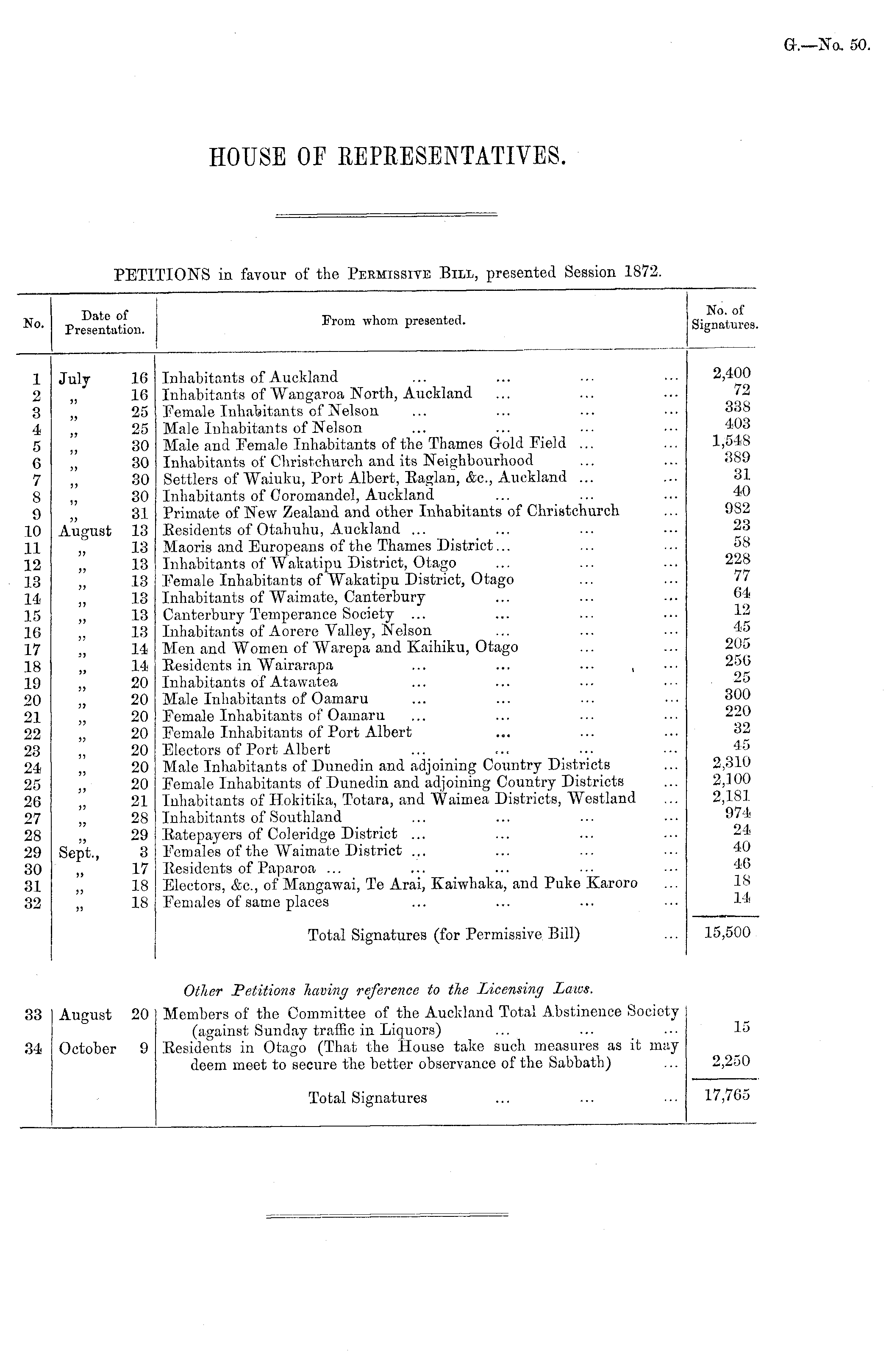 o. Date of Presentation. From whom presented. No. of Signature! 1 2 3 4 5 6 7 8 9 L0 LI 12 L3 L4 L5 L6 17 L8 L9 JO 21 22 23 24 25 2G 27 28 29 50 51 )2 July )! >> ,, ,, ,J )> )> August >> >> ?j >) ,, J5 5J 3» 3> ,> >> >> 3, )3 J> )? >> !, Sept., jj !> 16 16 25 25 30 30 30 30 31 13 13 13 13 13 13 13 14 14 20 20 20 20 20 20 20 21 28 29 3 17 18 IS Inhabitants of Auckland Inhabitants of Wangaroa North, Auckland Female Inhabitants of Nelson Male Inhabitants of Nelson Male and Eemale Inhabitants of the Thames Gold Eield ... Inhabitants of Christchurch and its Neighbourhood Settlers of Waiuku, Port Albert, Raglan, &c, Auckland ... Inhabitants of Coromandel, Auckland Primate of New Zealand and other Inhabitants of Christchurch Residents of Otahuhu, Auckland ... Maoris and Europeans of the Thames District... Inhabitants of Wakatipu District, Otago Eemale Inhabitants of Wakatipu District, Otago Inhabitants of Waimate, Canterbury Canterbury Temperance Society ... Inhabitants of Aorere Valley, Nelson Men and Women of Warepa and Kaihiku, Otago Residents in Wairarapa ... ... ... , Inhabitants of Atawatea Male Inhabitants of Oamaru Eemale Inhabitants of Oamaru Eemale Inhabitants of Port Albert Electors of Port Albert Male Inhabitants of Dunedin and adjoining Country Districts Eemale Inhabitants of Dunedin and adjoining Country Districts Inhabitants of Hokitika, Totara, and Waimea Districts, Westland Inhabitants of Southland Ratepayers of Coleridge District ... Ecmales of the Waimate District ... Residents of Paparoa ... Electors, &e., of Mangawai, Te Arai, Kaiwhaka, and Puke Karoro Eemales of same places 2,400 72 338 403 1,548 389 31 40 982 23 58 228 77 64 12 45 205 256 25 300 220 32 45 2,310 2,100 2,181 974 24 40 46 18 14 Total Signatures (for Permissive Bill) 15,500 33 August 20 Other Petitions having reference to the Licensing Laivs. Members of the Committee of the Auckland Total Abstinence Society (against Sunday traffic in Liquors) Residents in Otago (That the House take such measures as it may deem meet to secure the better observance of the Sabbath) 15 34 October 9 2,250 Total Signatures 17,765