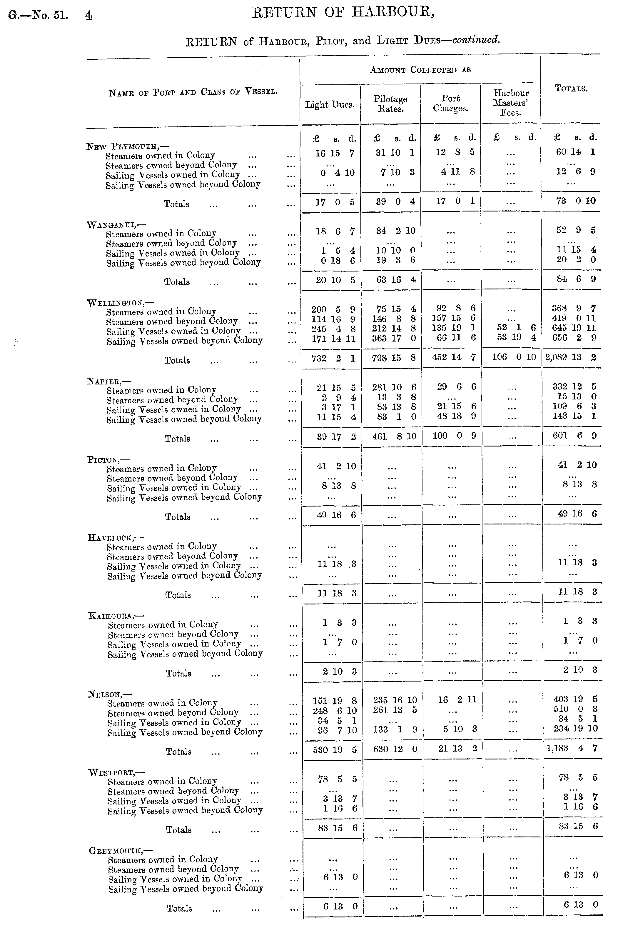 RETURN of Haeboue, Pilot, and Light Dues— continued. Amount G (ELECTED AS Name of Poet and Class o_ Vessel. Totals. Light Dues. Pilotage Rates. Port Charges. Harbour Masters' Fees. £ s. d. £ s. d. £ s. d. £ s. d. £ s. d. New Plymouth,— Steamers owned in Colony Steamers owned beyond Colony ... Sailing Vessels owned in Colony ... Sailing Vessels owned beyond Colony 16 15 7 0 4 10 31 10 1 7 10 3 12 8 5 4.il 8 60 14 1 12"'G 9 Totals 17 0 5 39 0 4 17 0 1 73 0 10 Wanganui,— Steamers owned in Colony Steamers owned beyond Colony ... Sailing Vessels owned in Colony ... Sailing Vessels owned beyond Colony ! 18 6 7 1 5 4 0 18 6 34 2 10 10 10 0 19 3 6 52 9 5 11 15 4 20 2 0 Totals 20 10 5 63 16 4 84 6 9 Wellington,— Steamers owned in Colony Steamers owned beyond Colony ... Sailing Vessels owned in Colony ... Sailing Vessels owned beyond Colony 200 5 9 114 16 9 245 4 8 171 14 11 75 15 4 146 8 8 212 14 8 363 17 0 92 8 6 157 15 6 135 19 1 66 11 6 52"l 6 53 19 4 368 9 7 419 0 11 645 19 11 656 2 9 Totals 732 2 1 798 15 8 452 14 7 106 0 10 2,089 13 2 Napier,— Steamers owned in Colony Steamers owned beyond Colony ... Sailing Vessels owned in Colony .., Sailing Vessels owned beyond Colony 21 15 5 2 9 4 3 17 1 11 15 4 281 10 6 13 3 8 83 13 8 83 1 0 29 6 6 21 15 6 48 18 9 332 12 5 15 13 0 109 6 3 143 15 1 Totals 39 17 2 461 8 10 100 0 9 601 6 9 PlCTON, — Steamers owned in Colony Steamers owned beyond Colony ... Sailing Vessels owned in Colony ... Sailing Vessels owned beyond Colony 41 2 10 8 13 8 41 2 10 813 8 Totals 49 16 6 49 16 6 Hatelock, — Steamers owned in Colony Steamers owned beyond Colony ... Sailing Vessels owned in Colony ... Sailing Vessels owned beyond Colony ll"l8 3 11 18 3 Totals 11 18 3 11 18 3 Kaikouea, — Steamers owned in Colony Steamers owned beyond Colony ... Sailing Vessels owned in Colony ... Sailing Vessels owned beyond Colony 13 3 1 ' 7 0 13 3 17 0 Totals 2 10 3 2 10 3 Nelson, — Steamers owned in Colony Steamers owned beyond Colony ... Sailing Vessels owned in Colony ... Sailing Vessels owned beyond Colony 151 19 8 248 6 10 34 5 1 96 7 10 235 16 10 261 13 5 16 2 11 403 19 5 510 0 3 34 5 1 234 19 10 133 1 9 5 10 3 Totals 530 19 5 630 12 0 21 13 2 1,183 4 7 Westpoet,— Steamers owned in Colony Steamers owned beyond Colony ... Sailing Vessels owned in Colony ... Sailing Vessels owned beyond Colony 78 5 5 3 13 7 1 16 6 78 5 5 313 7 1 16 6 Totals 83 15 6 83 15 6 Geeymouth,— Steamers owned in Colony Steamers owned beyond Colony Sailing Vessels owned in Colony ... Sailing Vessels owned beyond Colony 6 13 0 613 0 6 13 0 Totals 6 13 0