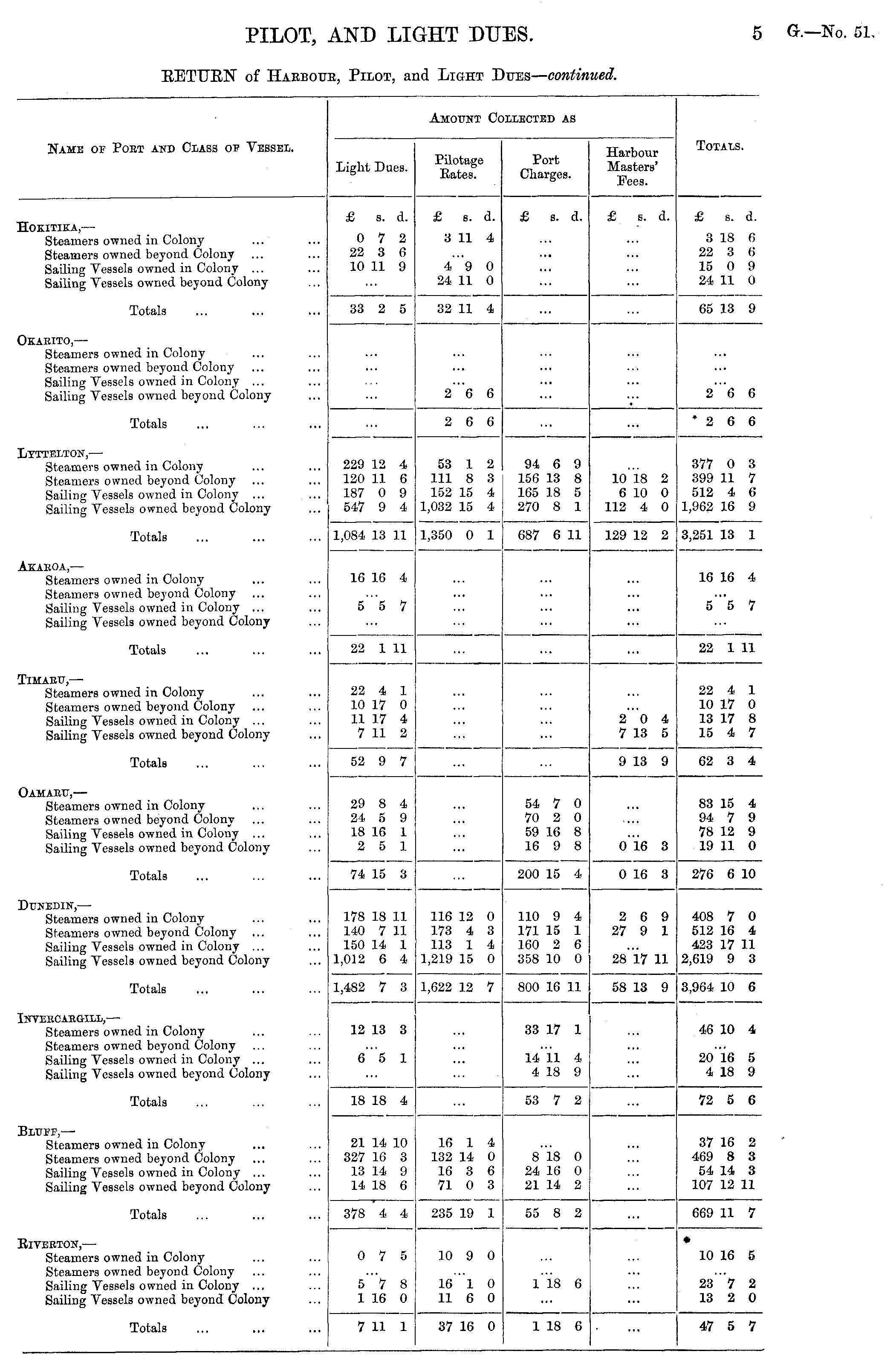 RETURN of Haebou: :, Pilot, and Light Dues— continued. Amount G (ELECTED AS Name oe Poet and Class oe Vessel. Totals. Light Dues. Pilotage Rates. Port Charges. Harbour Masters' Fees. £ s. d. £ s. d. £ s. d. £ s. d. £ s. d. HOKITIKA, — Steamers owned in Colony Steamers owned beyond Colony Sailing Vessels owned in Colony ... Sailing Vessels owned beyond Colony 0 7 2 22 3 6 10 11 9 3 11 4 4 "9 0 24 11 0 3 18 6 22 3 6 15 0 9 24 11 0 Totals 65 13 9 33 2 5 32 11 4 Okaeito, — Steamers owned in Colony Steamers owned beyond Colony Sailing Vessels owned in Colony ... Sailing Vessels owned beyond Colony 2'e e 2 6 6 Totals 2 6 6 '266 Lyttelton,— Steamers owned in Colony Steamers owned beyond Colony Sailing Vessels owned in Colony ... Sailing Vessels owned beyond Colony 229 12 4 120 11 6 187 0 9 547 9 4 53 1 2 111 8 3 152 15 4 1,032 15 4 94 6 9 156 13 8 165 18 5 270 8 1 10 18 2 6 10 0 112 4 0 377 0 3 399 11 7 512 4 6 1,962 16 9 Totals 1,084 13 11 1,350 0 1 687 6 11 129 12 2 3,251 13 1 Aeaeoa, — Steamers owned in Colony Steamers owned beyond Colony Sailing Vessels owned in Colony ... Sailing Vessels owned beyond Colony 16 16 4 5'"5 7 16 16 4 5'"5 7 Totals 22 1 11 22 1 11 Timaru, — Steamers owned in Colony Steamers owned beyond Colony Sailing Vessels owned in Colony ... Sailing Vessels owned beyond Colony 22 4 1 10 17 0 11 17 4 7 11 2 2 0 4 7 13 5 22 4 1 10 17 0 13 17 8 15 4 7 Totals 52 9 7 9 13 9 62 3 4 Oamaeu, — Steamers owned in Colony Steamers owned beyond Colony Sailing Vessels owned in Colony ... Sailing Vessels owned beyond Colony 29 8 4 24 5 9 18 16 1 2 5 1 54 7 0 70 2 0 59 16 8 16 9 8 83 15 4 94 7 9 78 12 9 19 11 0 0 16 3 Totals 74 15 3 200 15 4 0 16 3 276 6 10 Dunedin, — Steamers owned in Colony Steamers owned beyond Colony Sailing Vessels owned in Colony ... Sailing Vessels owned beyond Colony 178 18 11 140 7 11 150 14 1 1,012 6 4 116 12 0 173 4 3 113 1 4 1,219 15 0 110 9 4 171 15 1 160 2 6 358 10 0 2 6 9 27 9 1 408 7 0 512 16 4 423 17 11 2,619 9 3 28 17 11 Totals 1,482 7 3 1,622 12 7 800 16 11 58 13 9 3,964 10 6 INVERCAEGILL, — Steamers owned in Colony Steamers owned beyond Colony Sailing Vessels owned in Colony ... Sailing Vessels owned beyond Colony 12 13 3 6 5 1 33 17 1 14 11 4 4 18 9 46 10 4 20 16 5 4 18 9 Totals 53 7 2 72 5 6 18 18 4 Bluef, — Steamers owned in Colony Steamers owned beyond Colony Sailing Vessels owned in Colony ... Sailing Vessels owned beyond Colony 21 14 10 327 16 3 13 14 9 14 18 6 16 1 4 132 14 0 16 3 6 71 0 3 8 18 0 24 16 0 21 14 2 37 16 2 469 8 3 54 14 3 107 12 11 Totals 378 4 4 235 19 1 55 8 2 669 11 7 RlVERTON, — Steamers owned in Colony Steamers owned beyond Colony Sailing Vessels owned in Colony ... Sailing Vessels owned beyond Colony 0 7 5 5 7 8 1 16 0 10 9 0 16 "l 0 11 6 0 1 18 6 10 16 5 23 '7 2 13 2 0 Totals 7 11 1 37 16 0 1 18 6 47 5 7