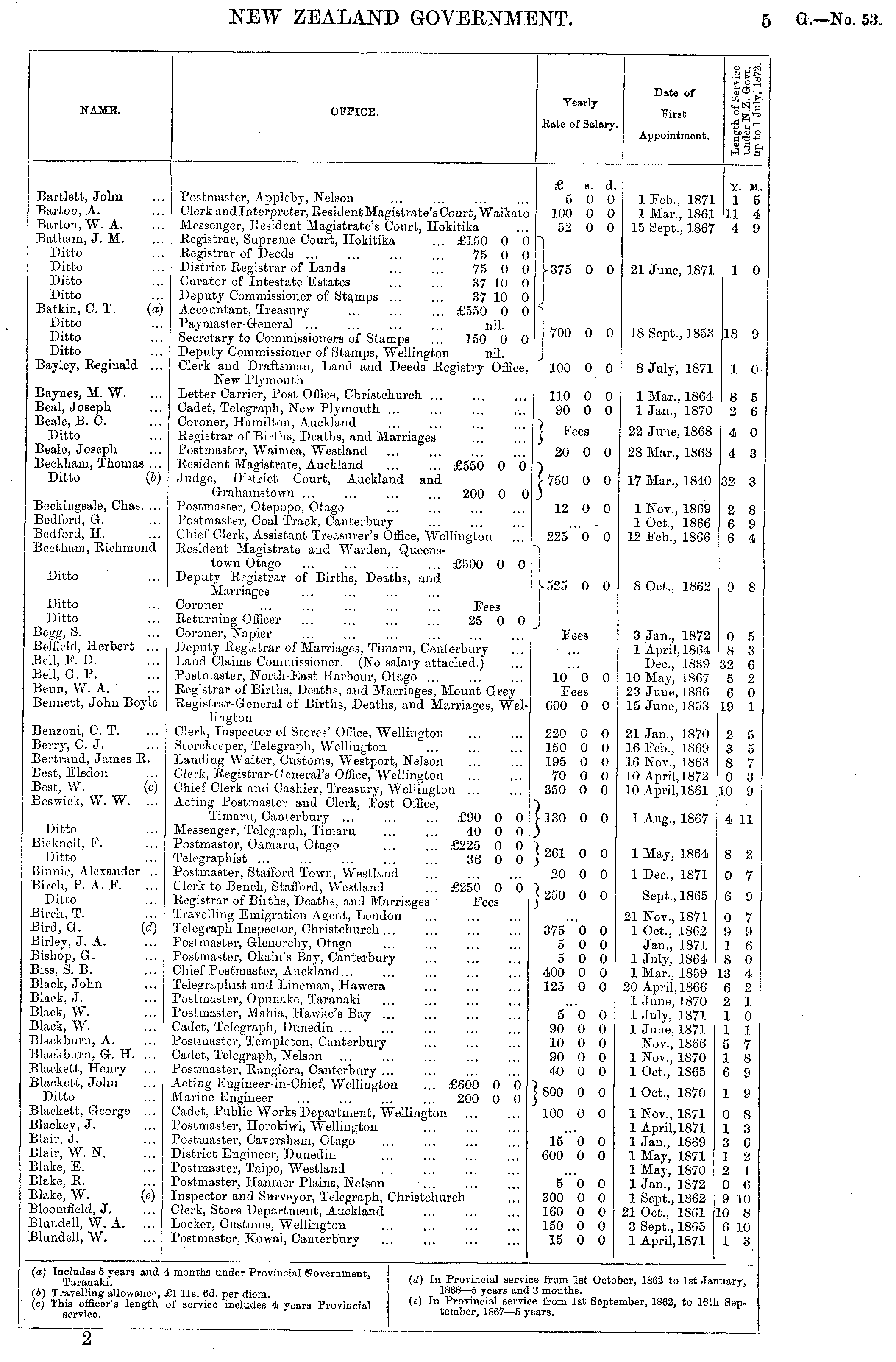 NAMB. OFFICE. Yearly Date of First So . 4.659 be a. O A 3 j? Kate of Salary. Appointment. Bartlett, John Barton, A. Barton, W. A. Batham, J. M. Ditto Ditto Ditto Ditto Batkin, C. T. (a) Ditto Ditto Ditto Bayley, Reginald ... Postmaster, Appleby, Nelson Clerk and Interpreter, Resident Magistrate's Court, Waikato Messenger, Resident Magistrate's Court, Hokitika Registrar, Supreme Court, Hokitika ... £150 0 0 Registrar of Deeds ... ... ... ... 75 0 0 District Registrar of Lands ... ... 75 0 0 Curator of Intestate Estates ... ... 37 10 0 Deputy Commissioner of Stamps ... ... 37 10 0 Accountant, Treasury ... ... ... £550 0 0 Paymaster-General ... ... ... ... nil. Secretary to Commissioners of Stamps ... 150 0 0 Deputy Commissioner of Stamps, Wellington nil. Clerk and Draftsman, Land and Deeds Registry Office, New Plymouth Letter Carrier, Post Office, Christchurch ... Cadet, Telegraph, New Plymouth ... Coroner, Hamilton, Auckland Registrar of Births, Deaths, and Marriages Postmaster, Waimea, Westland Resident Magistrate, Auckland ... ... £550 0 0 Judge, District Court, Auckland and Grahamstown ... ... ... ... 200 0 0 Postmaster, Otepopo, Otago Postmaster, Coal Track, Canterbury Chief Clerk, Assistant Treasurer's Office, Wellington Resident Magistrate and Warden, Queenstown Otago £500 0 0 Deputy Registrar of Births, Deaths, and Marriages Coroner ... ... ... ... ... Fees Returning Officer ... ... ... ... 25 0 0 Coroner, Napier Deputy Registrar of Marriages, Timaru, Canterbury Land Claims Commissioner. (No salary attached.) Postmaster, North-East Harbour, Otago ... Registrar of Births, Deaths, and Marriages, Mount Grey Registrar-General of Births, Deaths, and Marriages, Wellington Clerk, Inspector of Stores'Office, Wellington Storekeeper, Telegraph, Wellington Landing Waiter, Customs, Westport, Nelson Clerk, Registrar-General's Office, Wellington Chief Clerk aud Cashier, Treasury, Wellington ... Acting Postmaster and Clerk, Post Office, Timaru, Canterbury ... ... ... £90 0 0 Messenger, Telegraph, Timaru 40 0 0 Postmaster, Oamaru, Otago ... ... £225 0 0 Telegraphist 36 0 0 Postmaster, Stafford Town, Westland Clerk to Bench, Stafford, Westland ... £250 0 0 Registrar of Births, Deaths, and Marriages ' Fees Travelling Emigration Agent, London Telegraph Inspector, Christchurch ... Postmaster, Glcnorchy, Otago Postmaster, Okain's Bay, Canterbury Chief Postmaster, Auckland... Telegraphist and Lineman, Hawera Postmaster, Opunake, Taranaki Postmaster, Mahin, Hawke's Bay ... Cadet, Telegraph, Dunedin ... Postmaster, Templeton, Canterbury Cadet, Telegraph, Nelson Postmaster, Rangiora, Canterbury ... Acting Engineer-in-Chief, Wellington ... £600 0 0 Marine Engineer ... ... ... ... 200 0 0 Cadet, Public Works Department, Wellington Postmaster, Horokiwi, Wellington Postmaster, Caversham, Otago District Engineer, Dunedin Postmaster, Taipo, Westland Postmaster, Hanmer Plains, Nelson Inspector and Surveyor, Telegraph, Christchurch Clerk, Store Department, Auckland Locker, Customs, Wellington Postmaster, Kowai, Canterbury £ s. d. 5 0 0 100 0 0 52 0 0 1 Feb., 1871 1 Mar., 1861 15 Sept., 1867 y. it. 1 5 11 4 4 9 1 J-375 0 0 I 21 June, 1871 1 0 J 18 Sept., 1853 700 0 0 18 9 J 8 July, 1871 100 0 0 1 0 Baynes, M. W. Beal, Joseph Beale, B. C. Ditto Beale, Joseph Beckham, Thomas ... Ditto (o) 110 0 0 90 0 0 I Fees 1 Mar., 1864 1 Jan., 1870 22 June, 1868 8 5 2 6 4 0 20 0 0 28 Mar., 1868 4 3 1 750 0 0 17 Mar., 1840 32 3 Beckingsale, Chas. ... Bedford, G. Bedford, H. Beetham, Richmond 12 0 0 225 "o 0 1 Nov., 1869 1 Oct., 1866 12 Feb., 1866 2 8 6 9 6 4 Ditto 1525 0 0 8 Oct., 1862 9 8 Ditto Ditto Begg, S. Belfield, Herbert ... Bell, F. D. Bell, G. P. Benn, W. A. Bennett, John Boyle J Fees 3 Jan., 1872 1 April, 1864 Dec, 1839 10 May, 1867 23 June, 1860 15 June, 1853 0 5 8 3 32 6 5 2 6 0 19 1 10 o o Fees 600 0 0 Benzoni, C. T. Berry, C. J. Bertrand, James R. Best, Elsdon Best, W. (c) Beswick, W. W. ... 220 0 0 150 0 0 195 0 0 70 0 0 350 0 0 21 Jan., 1870 16 Feb., 1869 16 Nov., 1863 10 April, 1872 10 April, 1861 2 5 3 5 8 7 0 3 10 9 Ditto Bicknell, F. Ditto Binnie, Alexander ... Birch, P. A. F. Ditto Birch, T. Bird, G. (</) Birley, J. A. Bishop, G. Biss, S. B. Black, John Black, J. Black, W. Black, W. Blackburn, A. Blackburn, G. H. ... Blackett, Henry Blackett, John Ditto Blackett, George ... Blackey, J. Blair, J. Blair, W.N. Blake, E. Blake, R. Blake, W. (e) Bloomfleld, J. Blundell. W. A. ... Blundell, W. I 130 0 0 | 261 0 0 1 Aug., 1867 4 11 1 May, 1864 8 2 20 0 0 1 Dec, 1871 0 7 | 250 0 0 Sept., 1865 21 Nov., 1871 1 Oct., 1862 Jan., 1871 1 July, 1864 1 Mar., 1859 20 April, 1866 1 June, 1870 1 July, 1871 1 June, 1871 Nov., 1866 1 Nov., 1870 1 Oct., 1865 G 9 375 0 0 5 0 0 5 0 0 400 0 0 125 0 0 0 7 9 9 1 6 8 0 13 4 0 2 2 1 1 0 1 1 5 7 1 8 6 9 5 0 0 90 0 0 10 0 0 90 0 0 40 0 0 ] 800 0 0 1 Oct., 1870 1 9 100 0 0 15 0 0 600 0 0 5 0 0 300 0 0 160 0 0 150 0 0 15 0 0 1 Nov., 1871 1 April, 1871 1 Jan., 1869 1 May, 1871 1 May, 1870 1 Jan., 1872 1 Sept., 1862 21 Oct., 1861 : 3 Sept., 1865 1 April, 1871 0 8 1 3 3 6 1 2 2 1 0 6 9 10 10 8 6 10 1 3 (a) Includes 6 years and 4 months under Provincial Sovernment, Taranaki. (&) Travelling allowance, £1 Us. 6d. per diem. (a) This officer's length of service includes dt years Provinciai service. (d) In Provincial servi 1868—5 years and (e) In Provincial servii tember, 1867—5 y ice from 1st Octc i 3 months. ce from 1st Septi years. iber, 1862 to 1st Jai ember, 1862, to let] mary, i Sep-