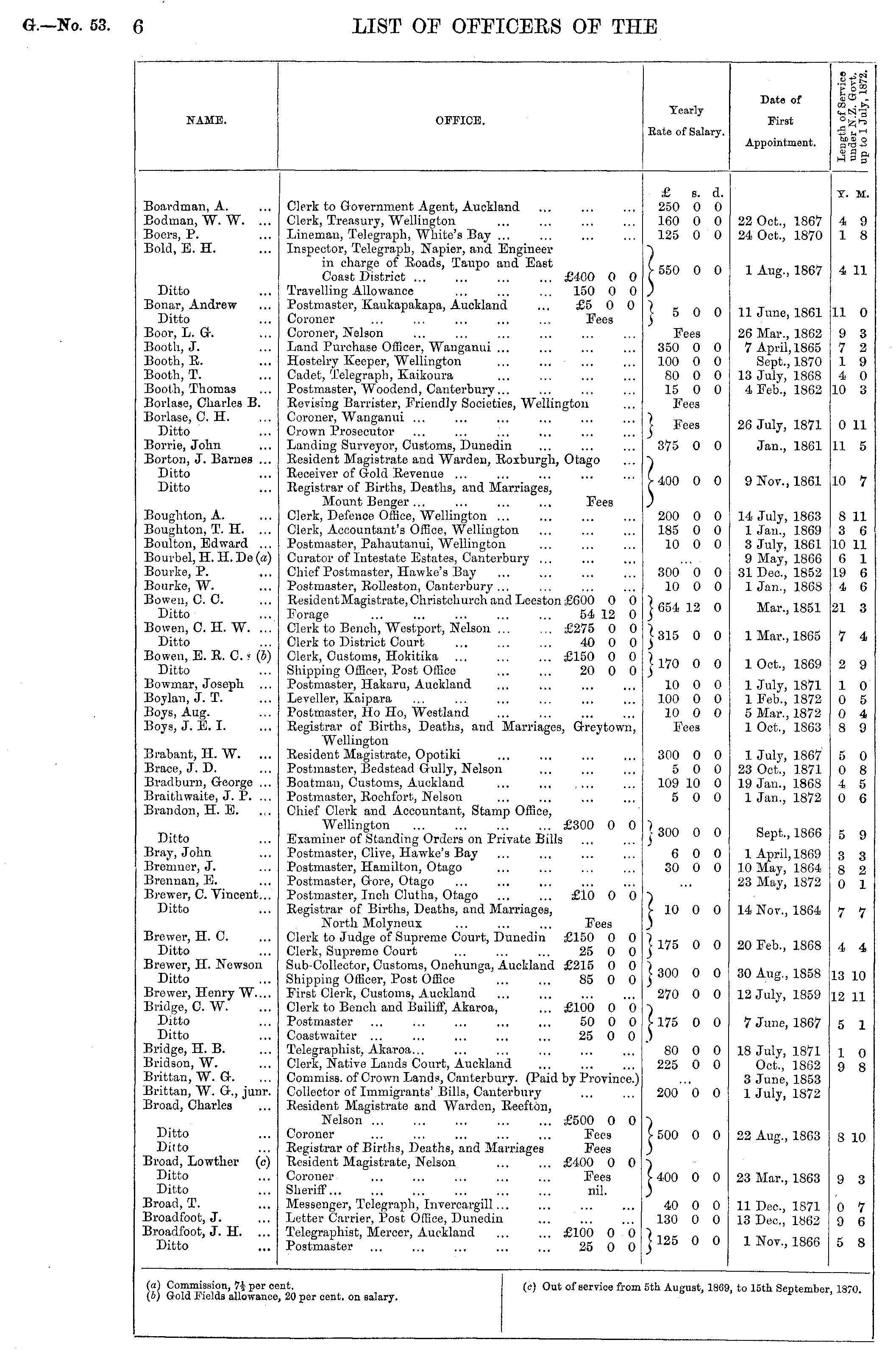 NAME. OFFICE. Tearly Date of First fets . CO .±? (SO 0> O i$ 3 g1 Rate of Salary. Appointment. Boardman, A. Bodman, W. W. ... Boers, P. Bold, E. H. Clerk to Government Agent, Auckland Clerk, Treasury, Wellington Lineman, Telegraph, White's Bay ... Inspector, Telegraph, Napier, and Engineer in charge of Roads, Taupo and East Coast District £400 0 0 Travelling Allowance ... ... ... 150 0 0 Postmaster, Kaukapakapa, Auckland ... £5 0 0 Coroner ... ... ... ... ... Fees Coroner, Nelson Land Purchase Officer, Wanganui ... Hostelry Keeper, Wellington Cadet, Telegraph, Kaikoura Postmaster, Woodend, Canterbury... Revising Barrister, Friendly Societies, Wellington Coroner, Wanganui ... Crown Prosecutor Landing Surveyor, Customs, Dunedin Resident Magistrate and Warden, Roxburgh, Otago Receiver of Gold Revenue ... Registrar of Births, Deaths, and Marriages, Mount Benger... ... ... ... Fees Clerk, Defence Office, Wellington ... Clerk, Accountant's Office, Wellington Postmaster, Pahautanui, Wellington Curator of Intestate Estates, Canterbury ... Chief Postmaster, Hawke's Bay Postmaster, Rolleston, Canterbury ... ResidentMagistrate, Christchurch and Leeston £600 0 0 Forage 54 12 0 Clerk to Bench, Westport, Nelson £275 0 0 Clerk to District Court 40 0 0 Clerk, Customs, Hokitika £150 0 0 Shipping Officer, Post Office 20 0 0 Postmaster, Hakaru, Auckland Leveller, Kaipara Postmaster, Ho Ho, Westland Registrar of Births, Deaths, and Marriages, Greytown, Wellington Resident Magistrate, Opotiki Postmaster, Bedstead Gully, Nelson Boatman, Customs, Auckland Postmaster, Rochfort, Nelson Chief Clerk and Accountant, Stamp Office, Wellington £300 0 0 Examiner of Standing Orders on Private Bills Postmaster, Clive, Hawke's Bay Postmaster, Hamilton, Otago Postmaster, Gore, Otago Postmaster, Inch Clutha, Otago £10 0 0 Registrar of Births, Deaths, and Marriages, North Molyneux ... ... ... Fees Clerk to Judge of Supreme Court, Dunedin £150 0 0 Clerk, Supreme Court 25 0 0 Sub-Collector, Customs, Onehunga, Auckland £215 0 0 Shipping Officer, Post Office 85 0 0 First Clerk, Customs, Auckland Clerk to Bench and Bailiff, Akaroa, ... £100 0 0 Postmaster 50 0 0 Coastwaiter ... ... ... ... ... 25 0 0 Telegraphist, Akaroa... Clerk, Native Lands Court, Auckland Commiss. of Crown Lands, Canterbury. (Paid by Province.) Collector of Immigrants' Bills, Canterbury Resident Magistrate and Warden, Reefton, Nelson £500 0 0 Coroner ... ... ... ... ... Fees Registrar of Births, Deaths, and Marriages Fees Resident Magistrate, Nelson £400 0 0 Coroner ... ... ... ... ... Fees Sheriff... ... ... ... ... ... nil. Messenger, Telegraph, Invereargill... Letter Carrier, Post Office, Dunedin Telegraphist, Mercer, Auckland £100 0 0 Postmaster 25 0 0 £ s. d. 250 0 0 160 0 0 125 0 0 T. M. 4 9 1 8 22 Oct., 1867 24 Oct., 1870 Ditto Bonar, Andrew Ditto Boor, L. G. Booth, J. Boot] i, R. Booth, T. Booth, Thomas Borlase, Charles B. Borlase, C. H. Ditto Borrie, John Borton, J. Barnes ... Ditto Ditto f 550 0 0 | 5 0 0 1 Aug., 1867 4 11 11 June, 1861 11 0 Fees 350 0 0 100 0 0 80 0 0 15 0 0 Fees 26 Mar., 1862 7 April, 1865 Sept., 1870 13 July, 1868 4 Feb., 1862 9 3 7 2 1 9 4 0 10 3 > Fees 375 0 0 26 July, 1871 0 11 Jan., 1861 11 5 > 400 0 0 9 Nov., 1861 10 7 Boughton, A. Boughton, T. H. ... Boulton, Edward ... Boui-bel,H.II.De(a) Bourke, P. Bourke, W. Bowen, CO. Ditto Bowen, C. H. W. ... Ditto Bowen, E. R. C. (4) Ditto Bowmar, Joseph ... Boylan, J. T. Boys, Aug. Boys, J. E.I. 200 0 0 185 0 0 10 0 0 14 July, 1863 1 Jan., 1869 3 July, 1861 9 May, 1866 31 Dec, 1852 1 Jan., 1868 8 11 3 6 10 11 6 1 19 6 4 G 300 0 0 10 0 0 ] 654 12 0 1 315 0 0 | 170 0 0 Mar., 1851 1 Mar., 1865 21 3 7 4 1 Oct., 1869 2 9 10 0 0 100 0 0 10 0 0 Fees 1 July, 1871 1 Feb., 1872 5 Mar., 1872 1 Oct., 1863 1 0 0 5 0 4 8 9 Brabant, H. W. ... Brace, J. D. Bradburn, George ... Braithwaite, J. P. ... Brandon, HE. 300 0 0 5 0 0 109 10 0 5 0 0 1 July, 1867 23 Oct., 1871 19 Jan., 1868 1 Jan., 1872 5 0 0 8 4 5 0 6 Ditto Bray, John Bremner, J. Brennan, E. Brewer, C. Vincent... Ditto ] 300 0 0 Sept., 1866 5 9 6 0 0 30 0 0 1 April, 1869 10 May, 1864 23 May, 1872 3 3 8 2 0 1 Brewer, H. C. Ditto Brewer, H. Newson Ditto Brewer, Henry W.... Bridge, C. W. Ditto Ditto Bridge, H. B. Bridson, W. Brittan, W. G. Brittan, W. G., junr. Broad, Charles I 10 0 0 ] 175 0 0 | 300 0 0 14 Nov., 1864 20 Feb., 1868 7 7 4 4 30 Aug., 1858 13 10 270 0 0 12 July, 1859 12 11 1 175 0 0 7 June, 1867 5 1 80 0 0 225 0 0 200 0 0 18 July, 1871 Oct., 1862 3 June, 1853 1 July, 1872 1 0 9 8 Ditto Ditto Broad, Lowther (c) Ditto Ditto Broad, T. Broadfoot, J. Broadfoot, J. H. Ditto I 500 0 0 1 400 0 0 22 Aug., 1863 8 10 23 Mar., 1863 9 3 40 0 0 130 0 0 11 Dec, 1871 13 Dec, 1862 0 7 9 6 ] 125 0 0 1 Nov., 1866 5 8 (a) Commission, 7% per ci (S) Gold Fields allowance ent. i, 20 per cent, on satary. (c) Out of service from 5th August, 186! ), to 15th September, 1870.