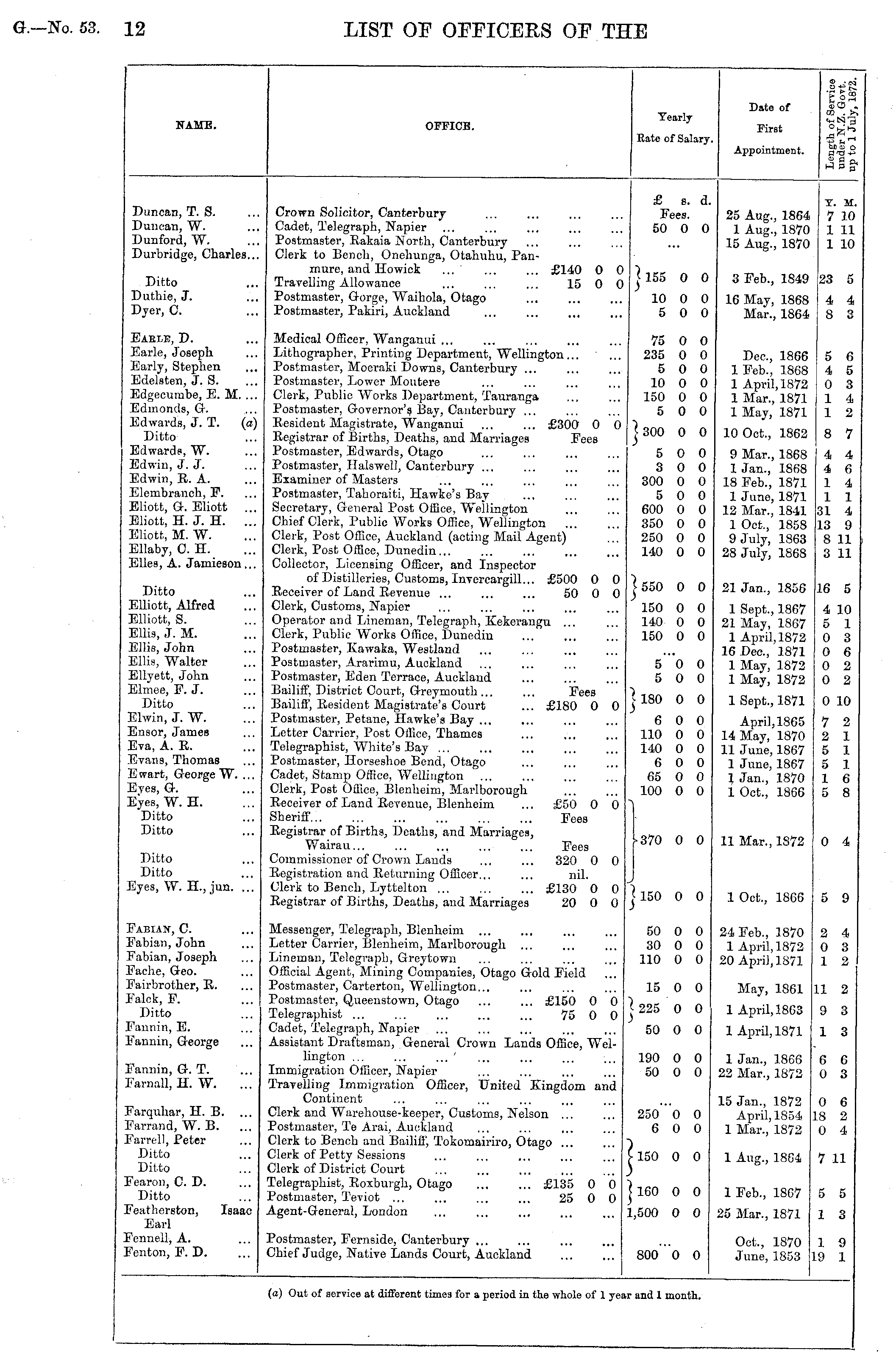 NAME. OFFICE. Yearly Data of First Hi so . GO . >-> f In S'-SS >3 § gRate of Salary. Appointment. Duncan, T. S. Duncan, W. Dunford, W. Durbridge, Charles... Crown Solicitor, Canterbury Cadet, Telegraph, Napier Postmaster, Rakaia North, Canterbury Clerk to Bench, Onehunga, Otahuhu, Panmure, and Howick ... ... ... £140 0 0 Travelling Allowance ... ... ... 15 0 0 Postmaster, Gorge, Waihola, Otago Postmaster, Pakiri, Auckland £ s. d. Fees. 50 0 0 25 Aug., 1864 1 Aug., 1870 15 Aug., 1870 T. M. 7 10 1 11 1 10 Ditto Duthie, J. Dyer, C. ] 155 0 0 3 Feb., 1849 23 5 10 0 0 5 0 0 16 May, 1868 Mar., 1864 4 4 8 3 Eable, D. Earlo, Joseph Early, Stephen Edelsten, J. S. Edgecumbe, E. M. ... Edmonds, Cr. Edwards, J. T. (a) Ditto Edwards, W. Edwin, J. J. Edwin, R. A. Elembranch, F. Eliott, G-. Eliott ... Eliott, H. J. H. ... Eliott, M. W. Ellaby, C. H. Elles, A. Jamieson... Medical Officer, Wanganui ... Lithographer, Printing Department, Wellington... ■ ... Postmaster, Moeraki Downs, Canterbury ... Postmaster, Lower Moutere Clerk, Public Works Department, Tauranga Postmaster, Governor's Bay, Canterbury ... Resident Magistrate, Wanganui £300 0 0 Registrar of Births, Deaths, and Marriages Fees Postmaster, Edwards, Otago Postmaster, llalswell, Canterbury ... Examiner of Masters Postmaster, Tahoraiti, Hawke's Bay Secretary, General Post Office, Wellington Chief Clerk, Public Works Office, Wellington Clerk, Post Office, Auckland (acting Mail Agent) Clerk, Post Office, Dunedin... Collector, Licensing Officer, and Inspector of Distilleries, Customs, Invereargill... £500 0 0 Receiver of Land Revenue ... ... ... 50 0 0 Clerk, Customs, Napier Operator and Lineman, Telegraph, Kekerangu ... Clerk, Public Works Office, Dunedin Postmaster, Ivawaka, Westland Postmaster, Ararimu, Auckland Postmaster, Eden Terrace, Auckland Bailiff', District Court, Greymouth ... ... Fees Bailiff, Resident Magistrate's Court ... £180 0 0 Postmaster, Petane, Hawke's Bay ... Letter Carrier, Post Office, Thames Telegraphist, White's Bay ... Postmaster, Horseshoe Bend, Otago Cadet, Stamp Office, Wellington Clerk, Post Office, Blenheim, Marlborough Receiver of Land Revenue, Blenheim ... £50 0 0 Sheriff Pees Registrar of Births, Deaths, and Marriages, Wairau... ... ... ... ... Eees Commissioner of Crown Lands ... ... 320 0 0 Registration and Returning Officer... ... nil. Clerk to Bench, Lyttelton £130 0 0 Registrar of Births, Deaths, and Marriages 20 0 0 75 0 0 235 0 0 5 0 0 10 0 0 150 0 0 5 0 0 1 300 0 0 5 0 0 3 0 0 300 0 0 5 0 0 600 0 0 350 0 0 250 0 0 140 0 0 Dec, 1866 1 Feb., 1868 1 April, 1872 1 Mar., 1871 1 May, 1871 10 Oct., 1862 9 Mar., 1868 1 Jan., 1868 18 Feb., 1871 1 June, 1871 12 Mar., 1841 1 Oct., 1858 9 July, 1863 28 July, 1868 5 6 4 5 0 3 1 4 1 2 8 7 4 4 4 6 1 4 1 1 31 4 13 9 8 11 3 11 Ditto Elliott, Alfred Elliott, S. Ellis, J. M. Ellis, John Ellis, Walter Ellyett, John Elmee, F. J. Ditto Elwin, J. W. Ensor, James Eva, A. R. Evans, Thomas Ewart, G-eorgeW. ... Eyes, St. E>es, W. H. "Ditto Ditto ] 550 0 0 21 Jan., 1856 16 5 150 0 0 140 0 0 150 0 0 1 Sept., 1867 21 May, 1867 1 April, 1872 16 Dec, 1871 1 May, 1872 1 May, 1872 4 10 5 1 0 3 0 6 0 2 0 2 5"'o 0 5 0 0 ] 180 0 0 1 Sept., 1871 0 10 6 0 0 110 0 0 140 0 0 6 0 0 65 0 0 100 0 0 April, 1865 14 May, 1870 11 June, 1867 1 June, 1867 1 Jan., 1870 1 Oct., 1866 7 2 2 1 5 1 5 1 1 6 5 8 Ditto Ditto Eyes, W. H, jun. ... 1 f-370 0 0 J150 0 0 11 Mar., 1872 0 4 1 Oct., 1866 5 9 Fabiak, C. Fabian, John Fabian, Joseph Fache, G-eo. Fairbrother, R. Falck, F. Ditto Fannin, E. Fannin, George Messenger, Telegraph, Blenheim ... Letter Carrier, Blenheim, Marlborough ... Lineman, Telegraph, Greytown Official Agent, Mining Companies, Otago Gold Field Postmaster, Carterton, Wellington,.. Postmaster, Queeustown, Otago ... ... £150 0 0 Telegraphist ... ... ... ... ... 75 0 0 Cadet, Telegraph, Napier Assistant Draftsman, General Crown Lands Office, Wellington ... ... ... ' Immigration Officer, Napier Travelling Immigration Officer, United Kingdom and Continent Clerk and Warehouse-keeper, Customs, Nelson Postmaster, Te Arai, Auckland Clerk to Bench and Bailiff, Tokomairiro, Otago Clerk of Petty Sessions Clerk of District Court Telegraphist, Roxburgh, Otago £135 0 0 Postmaster, Teviot ... ... ... ... 25 0 0 Agent-General, London 50 0 0 30 0 0 110 0 0 15 0 0 24 Feb., 1870 1 April, 1872 20 April, 1871 May, 1861 2 4 0 3 1 2 11 2 | 225 0 0 1 April, 1863 9 3 50 0 0 1 April, 1871 1 3 Fannin, G. T. Farnall, H. W. 190 0 0 50 0 0 1 Jan., 1866 22 Mar., 1872 6 6 0 3 Earquhar, H. B. Farrand, W. B. ... Farrell, Peter Ditto Ditto Fearon, CD. Ditto Featherston, Isaac Earl Fennell, A. Fenton, F. D. 250 0 0 6 0 0 15 Jan., 1872 April, 1854 1 Mar., 1872 0 6 18 2 0 4 1 150 0 0 j 160 0 0 1,500 0 0 1 Aug., 1864 1 Feb., 1867 7 11 5 5 25 Mar., 1871 1 3 Postmaster, Fernside, Canterbury ... Chief Judge, Native Lands Court, Auckland 800 0 0 Oct., 1870 June, 1853 1 9 19 1 (a) Out of service at different times for a period in the whole of 1 yes tr and 1 month.