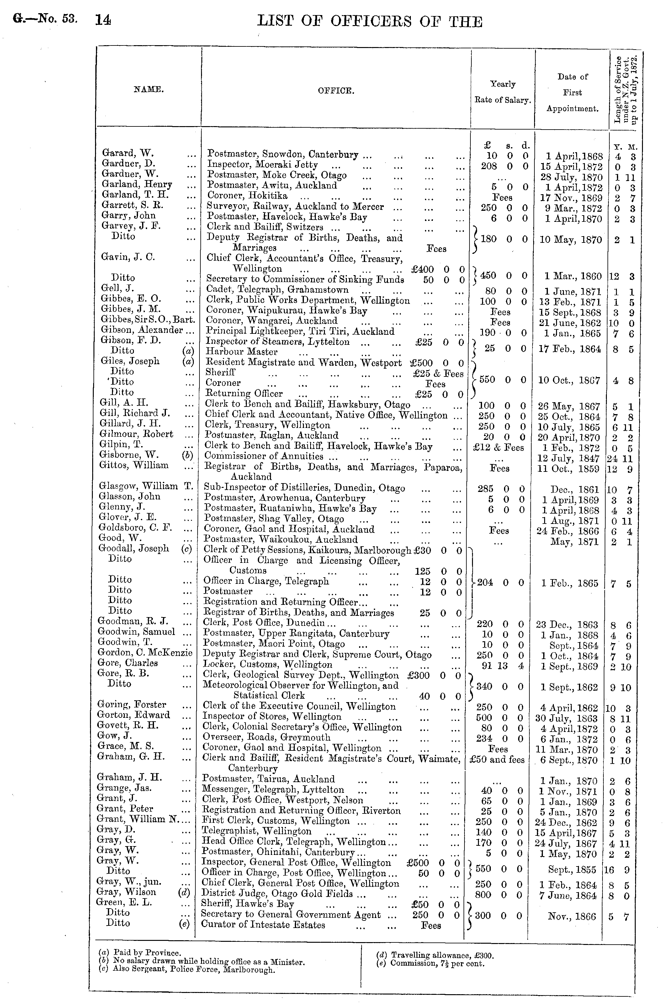 NAME. OFFICE. Yearly Date of First I-eg 3§ gRate of Salary. Appointment. Garard, AY. Gardner, D. Gardner, W. Garland, Henry Garland, T. H. Garrett, S. R. Garry, John Garvey, J. E. Ditto Postmaster, Snowdon, Canterbury ... Inspector, Moeraki Jetty Postmaster, Moke Creek, Otago Postmaster, Awitu, Auckland Coroner, Hokitika Surveyor, Railway, Auckland to Mercer ... Postmaster, Havelock, Hawke's Bay Clerk and Bailiff, Switzers ... Deputy Registrar of Births, Deaths, and Marriages ... ... ... ... Fees Chief Clerk, Accountant's Office, Treasury, Wellington £400 0 0 Secretary to Commissioner of Sinking Funds 50 0 0 Cadet, Telegraph, Grahamstown ... Clerk, Public Works Department, Wellington Coroner, Waipukurau, Hawke's Bay Coroner, Wangarei, Auckland Principal Lightkeeper, Tiri Tiri, Auckland Inspector of Steamers, Lyttelton £25 0 0 Harbour Master Resident Magistrate and Warden, Westport £500 0 0 Sheriff £25 & Fees Coroner ... ... ... ... ... Fees Returning Officer £25 0 0 Clerk to Bench and Bailiff, Hawksbury, Otago Chief Clerk and Accountant, Native Office, Wellington ... Clerk, Treasury, Wellington Postmaster, Raglan, Auckland Clerk to Bench and Bailiff, Haveloek, Hawke's Bay Commissioner of Annuities ... Registrar of Births, Deaths, and Marriages, Paparoa, Auckland Sub-Inspector of Distilleries, Dunedin, Otago Postmaster, Arowhenua, Canterbury Postmaster, Ruataniwha, Hawke's Bay Postmaster, Shag Valley, Otago Coroner, Gaol and Hospital, Auckland Postmaster, Waikoukou, Auckland Clerk of Potty Sessions, Kaikoura, Marlborough £30 0 0 Officer in Charge and Licensing Officer, Customs 125 0 0 Officer in Charge, Telegraph 12 0 0 Postmaster ... ... ... ... ... 12 0 0 Registration and Returning Officer... Registrar of Births, Deaths, and Marriages 25 0 0 Clerk, Post Office, Dunedin... Postmaster, Upper Rangitata, Canterbury Postmaster, Maori Point, Otago Deputy Registrar and Clerk, Supreme Court, Otago Locker, Customs, Wellington Clerk, Geological Survey Dept., Wellington £300 0 0 Meteorological Observer for Wellington, and Statistical Clerk 40 0 0 Clerk of the Executive Council, Wellington Inspector of Stores, Wellington Clerk, Colonial Secretary's Office, Wellington Overseer, Roads, Greymouth Coroner, Gaol and Hospital, Wellington Clerk and Bailiff, Resident Magistrate's Court, Waimate, Canterbury Postmaster, Tairua, Auckland Messenger, Telegraph, Lyttelton Clerk, Post Office, Westport, Nelson Registration and Returning Officer, Riverton First Clerk, Customs, Wellington Telegraphist, Wellington Head Office Clerk, Telegraph, Wellington Postmaster, Ohinitahi, Canterbury... Inspector, General Post Office, Wellington £500 0 0 Officer in Charge, Post Office, Wellington... 50 0 0 Chief Clerk, General Post Office, Wellington District Judge, Otago Gold Fields Sheriff, Hawke's Bay £50 0 0 Secretary to General Government Agent ... 250 0 0 Curator of Intestate Estates Fees £ s. d. 10 0 0 208 0 0 1 April, 1868 15 April, 1872 28 July, 1870 1 April, 1872 17 Nov., 1869 9 Mar., 1872 1 April, 1870 T. it. 4 3 0 3 1 11 0 3 2 7 0 3 2 3 5 0 0 Fees 250 0 0 6 0 0 il80 0 0 10 May, 1870 2 1 Gavin, J. C. Ditto Gell, J. Gibbes, E. O. Gibbes, J. M. Gibbes, Sir S.O., Bart. Gibson, Alexander ... Gibson, F. D. Ditto (a) Giles, Joseph (a) Ditto 'Ditto Ditto Gill, A. II. Gill, Richard J. Gillard, J. H. Gilmour, Robert Gilpin, T. Gisborne, W. (b) Gittos, William j 450 0 0 1 Mar., 1860 12 3 80 0 0 100 0 0 Fees Fees 190 0 0 1 June, 1871 13 Feb., 1871 15 Sept., 1868 21 June, 1862 1 Jan., 1865 1 1 1 5 3 9 10 0 7 6 ] 25 0 0 [-550 0 0 17 Feb., 1864 10 Oct., 1807 8 5 4 8 100 0 0 250 0 0 250 0 0 20 0 0 £12 & Fees 26 May, 1867 25 Oct., 1864 10 July, 1865 20 April, 1870 1 Feb., 1872 12 July, 1847 11 Oct., 1859 5 1 7 8 6 11 2 2 0 5 24 11 12 9 Fees Glasgow, William T. Glasson, John Glenny, J. Glover, J. E. Goldsboro, C. F. Good, W. Goodall, Joseph (c) Ditto 285 0 0 5 0 0 6 0 0 Fees Dec, 1861 1 April, 1869 1 April, 1808 1 Aug., 1871 24 Feb., 1866 May, 1871 10 7 3 3 4 3 0 11 6 4 2 1 Ditto Ditto Ditto Ditto Goodman, R. J. Goodwin, Samuei ... Goodwin, T. Gordon, C. McKenzie Gore, Charles Gore, R. B. Ditto 1 I I J-204 0 0 i J 1 Feb., 1805 7 5 220 0 0 10 0 0 10 0 0 250 0 0 91 13 4 23 Dec, 1863 1 Jan., 1868 Sept., 1864 1 Oct., 1864 1 Sept., 1869 8 6 4 C 7 9 7 9 2 10 0 0 1 Sept., 1862 9 10 Goring, Forster Gorton, Edward Govott, R. H. G-ow, J. Grace, M. S. Graham, G. H. 250 0 0 500 0 0 80 0 0 234 0 0 Fees £50 and fees 4 April, 1862 30 July, 1863 4 April, 1872 6 Jan., 1872 11 Mar., 1870 6 Sept., 1870 10 3 8 11 0 3 0 6 2 3 1 10 Graham, J. H. Grange, Jas. Grant, J. Grant, Peter Grant, William N.... Gray, D. Gray, G. Gray, W. Gray, AY. Ditto Gray, W., jun. Gray, Wilson (d) Green, E. L. Ditto Ditto (e) 40 0 0 65 0 0 25 0 0 250 0 0 140 0 0 170 0 0 5 0 0 1 Jan., 1870 1 Nov., 1871 1 Jan., 1869 5 Jan., 1870 24 Dec, 1862 15 April, 1867 24 July, 1867 1 May, 1870 2 6 0 8 3 6 2 6 9 6 5 3 4 11 2 2 | 550 0 0 Sept., 1855 16 9 250 0 0 800 0 0 1 Feb., 1864 7 June, 1864 8 5 8 0 £ 300 0 0 Nov., 1866 5 7 (a) Paid by Province. (5) .No salary drawn whit (ej Also Sergeant, Police holding office as a Minister. ?orce, Marlborough. (d) Travelling allowani (e) Commission, 7-} pei :e, £300. cent.