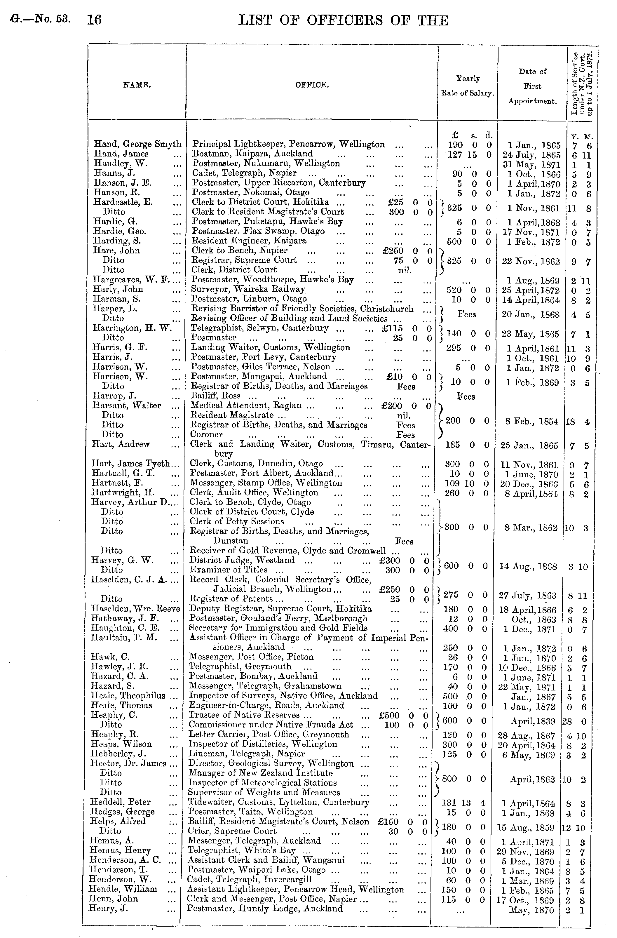 name. OFFICE. Yearly Date of First §~'K V 6 2 GO . t-, fcfl o o 3B& Rate of Salary. Appointment. Hand, George Smyth Hand, James Haudley, W. Hanna, J. Hanson, J. E. Hanson, R. Hardcastle, E. Ditto Hardie, G. Hardie, Geo. Harding, S. Hare, John Ditto Ditto Hargreaves, W. F.... Harly, John Harman, S. Harper, L. Ditto Harrington, H. W. Ditto Harris, G. F. Harris, J. Harrison, W. Harrison, W. Ditto Harrop, J. Harsant, Walter ... Ditto Ditto Ditto Hart, Andrew Principal Lightkeeper, Pencarrow, Wellington ... Boatman, Kaipara, Auckland Postmaster, Nukumaru, Wellington Cadet, Telegraph, Napier Postmaster, Upper Riccarton, Canterbury Postmaster, Nokomai, Otago Clerk to District Court, Hokitika £25 0 0 Clerk, to Resident Magistrate's Court ... 300 0 0 Postmaster, Puketapu, Hawke's Bay Postmaster, Flax Swamp, Otago Resident Engineer, Kaipara Clerk to Bench, Napier £250 0 0 Registrar, Supreme Court ... ... ... 75 0 0 Clerk, District Court ... ... ... nil. Postmaster, Woodthorpe, Hawke's Bay Surveyor, Waireka Railway Postmaster, Linburn, Otago Revising Barrister of Friendly Societies, Christchurch ... Revising Officer of Building and Land Societies ... Telegraphist, Selwyn, Canterbury ... ... £115 0 0 Postmaster 25 0 0 Landing Waiter, Customs, Wellington Postmaster, Port Levy, Canterbury Postmaster, Giles Terrace, Nelson ... Postmaster, Mangapai, Auckland ... ... £10 0 0 Registrar of Births, Deaths, and Marriages Fees Bailiff, Ross Medical Attendant, Raglan £200 0 0 Resident Magistrate ... ... ... ... nil. Registrar of Births, Deaths, and Marriages Fees Coroner ... ... ... ... ... Fees Clerk and Landing Waiter, Customs, Timaru, Canterbury Clerk, Customs, Dunedin, Otago Postmaster, Port Albert, Auckland... Messenger, Stamp Office, Wellington Clerk, Audit Office, Wellington Clerk to Bench, Clyde, Otago Clerk of District Court, Clyde Clerk of Petty Sessions Registrar of Births, Deaths, and Marriages, Dunstan ... ... ... ... Fees Receiver of Gold Revenue, Clyde and Cromwell ... District Judge, Westland £300 0 0 Examiner of Titles 300 0 0 Record Clerk, Colonial Secretary's Office, Judicial Branch, Wellington £250 0 0 Registrar of Patents... ... ... ... 25 0 0 Deputy Registrar, Supreme Court, Hokitika Postmaster, Gouland's Ferry, Marlborough Secretary for Immigration and Gold Fields Assistant Officer in Charge of Payment of Imperial Pensioners, Auckland Messenger, Post Office, Picton Telegraphist, Greymouth Postmaster, Bombay, Auckland Messenger, Telegraph, Grahamstown Inspector of Surveys, Native Office, Auckland Eugineer-in-Charge, Roads, Auckland Trustee of Native Reserves ... ... ... £500 0 0 Commissioner under Native Frauds Act ... 100 0 0 Letter Carrier, Post Office, Greymouth Inspector of Distilleries, Wellington Lineman, Telegraph, Napier Director, Geological Survey, Wellington ... Manager of New Zealand Institute Inspector of Meteorological Stations Supervisor of Weights and Measures Tidcwaiter, Customs, Lyttelton, Canterbury Postmaster, Taita, Wellington Bailiff, Resident Magistrate's Court, Nelson £150 0 0 Crier, Supreme Court ... ... ... 30 0 0 Messenger, Telegraph. Auckland ... Telegraphist, White's Buy ... Assistant Clerk and Bailiff, Wanganui Postmaster, Waipori Lake, Otago ... Cadet, Telegraph, Invereargill Assistant Lightkeeper, Pencarrow Head, Wellington Clerk and Messenger, Post Office, Napier ... Postmaster, Huntly Lodge, Auckland £ s. d. 190 0 0 127 15 0 1 Jan., 1865 24 July, 1865 31 May, 1871 1 Oct., 1866 1 April, 1870 1 Jan., 1872 Y. M. 7 6 6 11 1 1 5 9 2 3 0 6 90 0 0 5 0 0 5 0 0 [ 1 325 0 0 1 Nov., 1861 11 8 6 0 0 5 0 0 500 0 0 1 April, 1868 17 Nov., 1871 lFeb., 1872 4 3 0 7 0 5 1 325 0 0 22 Nov., 1862 9 7 520 0 0 10 0 0 1 Aug., 1869 25 April, 1872 14 April, 1864 2 11 0 2 8 2 > Fees j 140 0 0 20 Jan., 1868 4 5 23 May, 1865 7 1 295 0 0 50 0 1 April, 1861 1 Oct., 1861 1 Jan., 1872 11 3 10 9 0 6 \ 10" 0 0 1 Feb., 1869 3 5 Fees ? '- 200 0 0 8 Feb., 1854 18 4 185 0 0 25 Jan., 1865 7 5 Hart, James Tyeth... Hartnall, G. T. Hartnett, F. Hartwright, H. Harvey, Arthur D.... Ditto Ditto Ditto 300 0 0 10 0 0 109 10 0 260 0 0 11 Nov., 1861 1 June, 1870 20 Dec, 1866 8 April, 1864 9 7 2 1 5 6 8 2 1 i I 0 0 I J 1 600 0 0 8 Mar., 1862 10 3 Ditto Harvey, G. W. Ditto Haselden, C. J. A. ... 14 Aug., 18S8 3 10 Ditto Haselden, Wm. Reeve Hathaway, J. F. Haughton, C. E. ... Haultain, T. M. ... | 275 0 0 27 July, 1863 18 April, 1866 Oct., 1863 1 Dec, 1871 8 11 180 0 0 12 0 0 400 0 0 6 2 8 8 0 7 Hawk, C. Hawley, J. E. Hazard, C. A. Hazard, S. Heale, Theophilus ... Healc, Thomas Hcaphy, C. Ditto Hcaphy, R. Heaps, Wilson Hebberley, J. Hector, Dr. James ... Ditto Ditto Ditto Heddell, Peter Hedges, George Helps, Alfred Ditto Hcmus, A. Hem us, Henry Henderson, A. C. ... Henderson, T. Henderson, W. Hendlc, William ... Henn, John Henry, J. 250 0 0 26 0 0 170 0 0 6 0 0 40 0 0 500 0 0 100 0 0 1 Jan., 1872 1 Jan., 1870 10 Dec, 1866 1 June, 1871 22 May, 1871 Jan., 1867 1 Jan., 1872 0 0 2 6 5 7 1 1 1 1 5 5 0 6 | 600 0 0 April, 1839 28 0 120 0 0 300 0 0 125 0 0 28 Aug., 1867 20 April, 1864 6 May, 1869 4 10 8 2 3 2 > 800 0 0 April, 1862 10 2 131 13 4 15 0 0 1 April, 1864 1 Jan., 1868 8 3 4 6 1 180 0 0 15 Aug., 1859 12 10 40 0 0 100 0 0 100 0 0 10 0 0 60 0 0 150 0 0 115 0 0 1 April, 1871 29 Nov., 1869 5 Dec, 1870 1 Jan., 1864 1 Mar., 1869 1 Feb., 1865 17 Oct., 1869 May, 1870 1 3 2 7 1 6 8 5 3 4 7 5 2 8 2 1