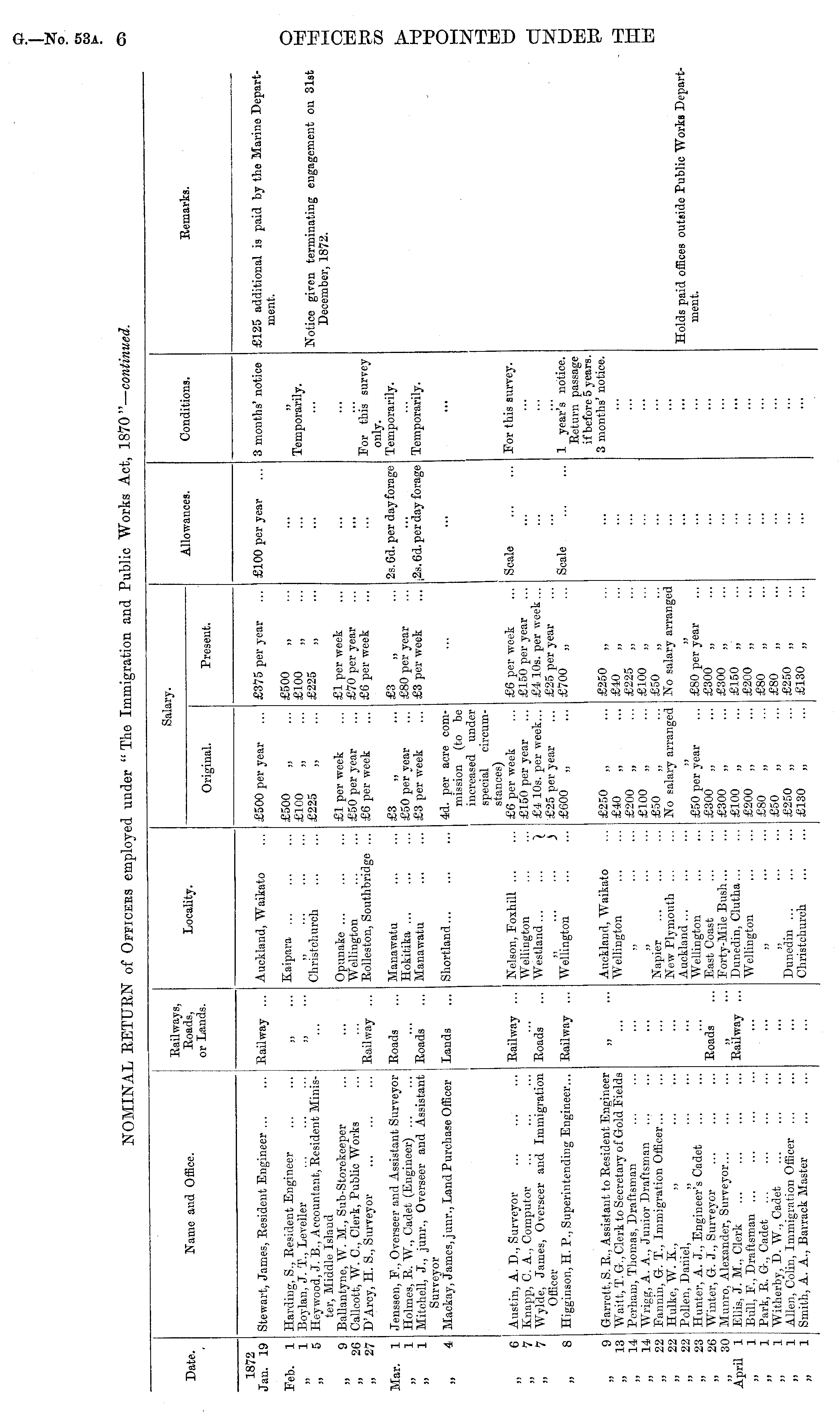 NOMINAL EETTJEN of Officers employed under " The Immigration and Pul ilic or. .ct. — continue^ Salary. Date. Name and Office. Railways, Roads, or Lands. Locality. Allowances. Conditions. Remarks. Original. Present. 1872 Jan. 19 Stewart, James, Resident Engineer ... Railway ... Auckland, Waikato £500 per year £375 per year £100 per year 3 months' notice £125 additional is paid by the Marine Department. Feb. 1 Harding, S., Resident Engineer Boylan, J. T., Leveller Hey wood, J. B., Accountant, Resident Minister, Middle Island Ballantyne, W. M., Sub-Storekeeper Callcott, W. O, Clerk, Public Works D'Arcy, H. S., Surveyor ,, ... Kaipara ... £500 „ £100 £225 £500 „ £100 £225 Temporarily. 9 „ 26 „ 27 ,, ... Christchurch Opunake ... Wellington Rolleston, Southbridge ... £1 per week £50 per year £6 per week £1 per week £70 per year £6 per week Notice given terminating engagement on 31st December, 1872. Railway ... For this survey only. Temporarily. Mar. 1 X Jenssen, F., Overseer and Assistant Surveyor Holmes, R. W., Cadet (Engineer) Mitchell, J., junr., Overseer and Assistant Surveyor Mackay, James, junr., Land Purchase Officer Roads Manawatu Hokitika ... Manawatu £3 „ £50 per year £3 per week £3 £80 per year £3 per week 2s. 6d. per day forage Roads ■2s. 6d. per day forage ... Temporarily. 4 Lands Shortland... 4d. per acre commission (to be increased under special circumstances) £6 per week £150 per year £4 10s. per week... £25 per year £600 „ Austin, A. D., Surveyor Knapp, C. A., Computor Wylde, James, Overseer and Immigration Officer Higginson, II. P., Superintending Engineer... Railway ... Nelson, Foxhill ... Wellington Westland... ... } ) Wellington £6 per week £150 per year £4 10s. per week ... £25 per year £700 „ Scale For this survey. J) J) 6 7 7 Roads I . . - 1 year's notice. Return passage if before 5 years. 3 months' notice. )» 8 Railway ... Scale 9 „ 13 „ 22 „ 22 „ 22 „ 23 „ 26 „ 30 April 1 1 1 1 1 » 1 Garrett, S. R., Assistant to Resident Engineer Waitt, T. G., Clerk to Secretary of Gold Fields Perham, Thomas, Draftsman Wrigg, A. A., Junior Draftsman Fannin, G. T., Immigration Officer... Hulke, W. K., „ Pollen, Daniel, ,, Hunter, A. J., Engineer's Cadet Winter, G. J., Surveyor Munro, Alexander, Surveyor... Ellis, J. M., Clerk Bull, F., Draftsman Park, R. G., Cadet Witherby, D. W., Cadet Allen, Colin, Immigration Officer Smith, A. A., Barrack Master ,, ... Auckland, Waikato Wellington £250 ,. £40 £200 „ £100 „ £50 No salary arranged £250 „ £40 £225 „ £100 „ £50 No salary arranged ... Roads ,, ... ... Napier New Plymouth ... Auckland ... Wellington East Coast Forty-Mile Bush Dunedin, Clutha... Wellington £50 per year £300 „ £300 „ £100 „ £200 „ £80 £50 £250 „ £130 „ £80 per year £300 „ £300 „ £150 „ £200 „ £80 £80 £250 „ £130 „ ... Holds paid offices outside Public Works Deparl ment. Railway ... Dunedin ... Christchurch ... ... ...