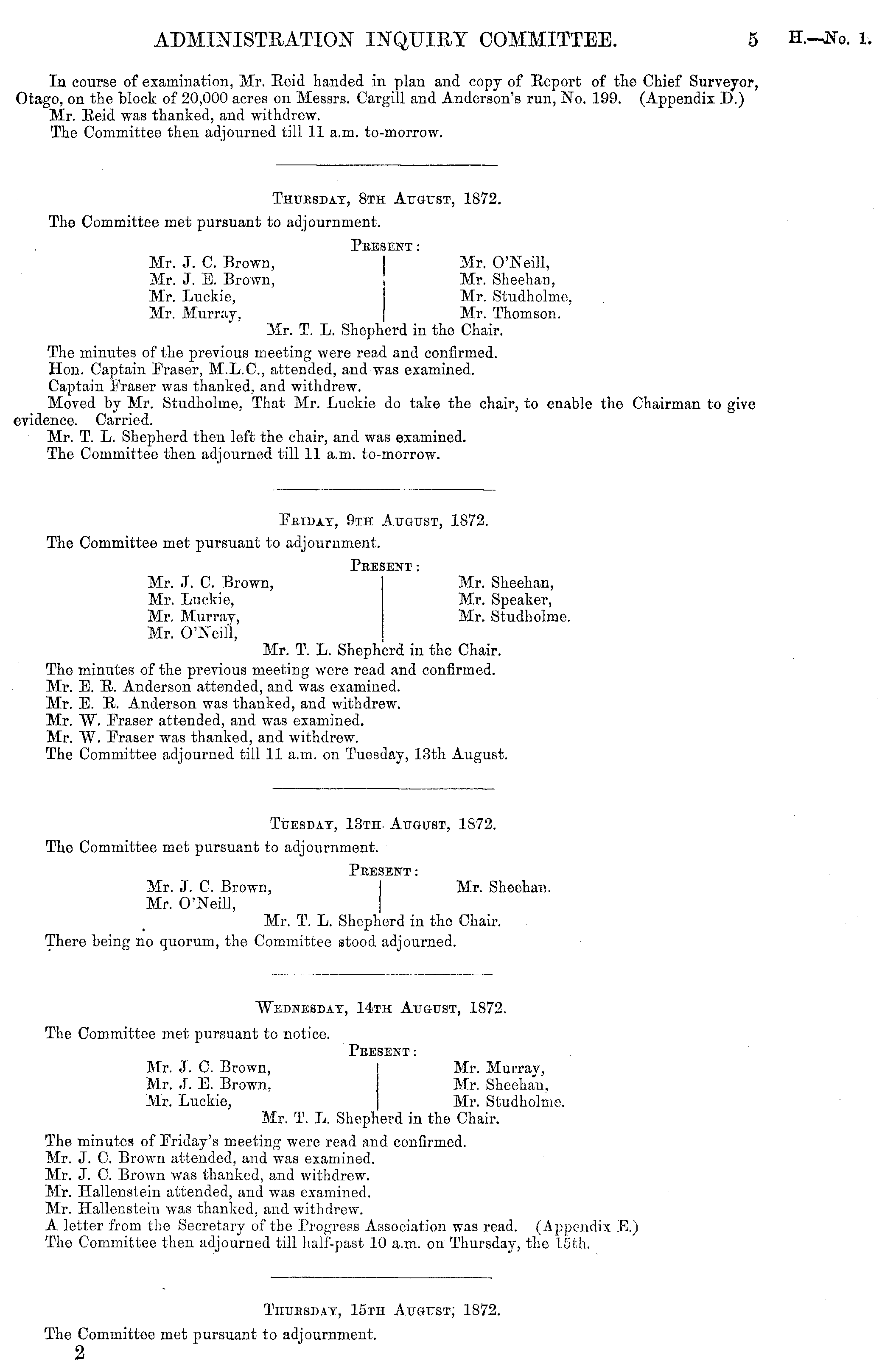 Wednesday, 14th August, 1872. The Committee met pursuant to notice. Present: Mr. J. C. Brown, Mr. Murray, Mr. J. E. Brown, Mr. Sheehan, Mr. Luckie, Mr. Studholme. Mr. T. L. Shepherd in the Chair. The minutes of Friday's meeting were read and confirmed. Mr. J. C. Brown attended, and was examined. Mr. J. C. Brown was thanked, and withdrew. Mr. Hallenstein attended, and was examined. Mr. Hallenstein was thanked, and withdrew. A letter from the Secretary of the Progress Association was read. (Appendix E.) The Committee then adjourned till half-past 10 a.m. on Thursday, the 15th.