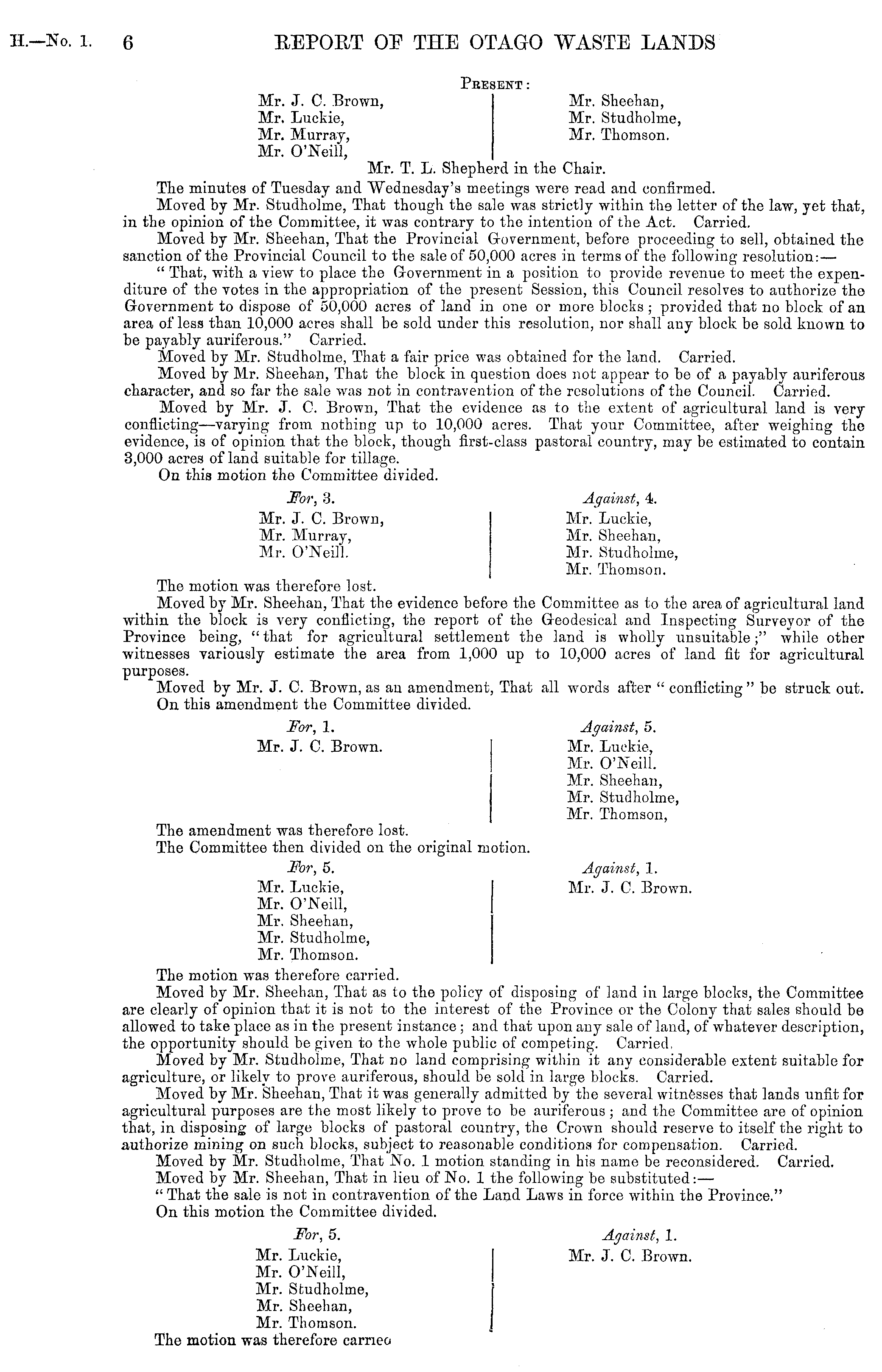 Present: Mr. J. C. Brown, Mr. Sheehan, Mr. Luckie, Mr. Studholme, Mr. Murray, Mr. Thomson. Mr. O'Neill, Mr. T. L. Shepherd in the Chair. The minutes of Tuesday and Wednesday's meetings were read and confirmed. Moved by Mr. Studholme, That though the sale was strictly within the letter of the law, yet that, in the opinion of the Committee, it was contrary to the intention of the Act. Carried. Moved by Mr. Sheehan, That the Provincial Government, before proceeding to sell, obtained the sanction of tho Provincial Council to the sale of 50,000 acres in terms of the following resolution:— " That, with a view to place the Government in a position to provide revenue to meet the expenditure of the votes in the appropriation of the present Session, this Council resolves to authorize the Government to dispose of 50,000 acres of land in one or more blocks ; provided that no block of an area of less than 10,000 acres shall be sold under this resolution, nor shall any block be sold known to be payably auriferous." Carried. Moved by Mr. Studholme, That a fair price was obtained for the land. Carried. Moved by Mr. Sheehan, That the block in question does not appear to be of a payably auriferous character, and so far the sale was not in contravention of the resolutions of the Council. Carried. Moved by Mr. J. C. Brown, That the evidence as to the extent of agricultural land is very conflicting—varying from nothing up to 10,000 acres. That your Committee, after weighing the evidence, is of opinion that the block, though first-class pastoral country, may be estimated to contain 3,000 acres of land suitable for tillage. On this motion the Committee divided. Eor, 3. Against, 4. Mr. J. C. Brown, Mr. Luckie, Mr. Murray, Mr. Sheehan, Mr. O'Neill. Mr. Studholme, Mr. Thomson. The motion was therefore lost. Moved by Mr. Sheehan, That the evidence before the Committee as to the area of agricultural land within the block is very conflicting, the report of the Geodesical and Inspecting Surveyor of the Province being, "that for agricultural settlement the land is wholly unsuitable;" while other witnesses variously estimate the area from 1,000 up to 10,000 acres of land fit for agricultural purposes. Moved by Mr. J. C. Brown, as an amendment, That all words after " conflicting " be struck out. On this amendment the Committee divided. Eor, 1. Against, 5. Mr. J. C. Brown. Mr. Luckie, Mr. O'Neill. Mr. Sheehan, Mr. Studholme, Mr. Thomson, The amendment was therefore lost. The Committee then divided on the original motion. Eor, 5. Against, 1. Mr. Luckie, Mr. J. C. Brown. Mr. O'Neill, Mr. Sheehan, Mr. Studholme, Mr. Thomson. The motion was therefore carried. Moved by Mr. Sheehan, That as to the policy of disposing of land in large blocks, the Committee are clearly of opinion that it is not to the interest of the Province or the Colony that sales should be allowed to take place as in the present instance ; and that upon any sale of land, of whatever description, the opportunity should be given to tho whole public of competing. Carried, Moved by Mr. Studholme, That no land comprising within it any considerable extent suitable for agriculture, or likely to prove auriferous, should be sold in large blocks. Carried. Moved by Mr. Sheehan, That it was generally admitted by the several witnesses that lands unfit for agricultural purposes are the most likely to prove to be auriferous ; and the Committee are of opinion that, in disposing of large blocks of pastoral country, the Crown should reserve to itself the right to authorize mining on such blocks, subject to reasonable conditions for compensation. Carried. Moved by Mr. Studholme, That No. 1 motion standing in his name be reconsidered. Carried. Moved by Mr. Sheehan, That in lieu of No. 1 the following be substituted: — " That the sale is not in contravention of the Land Laws in force within the Province." On this motion the Committee divided. For, 5. Against, 1. Mr. Luckie, Mr. J. C. Brown. Mr. O'Neill, Mr. Studholme, Mr. Sheehan, Mr. Thomson. The motion was therefore cameo