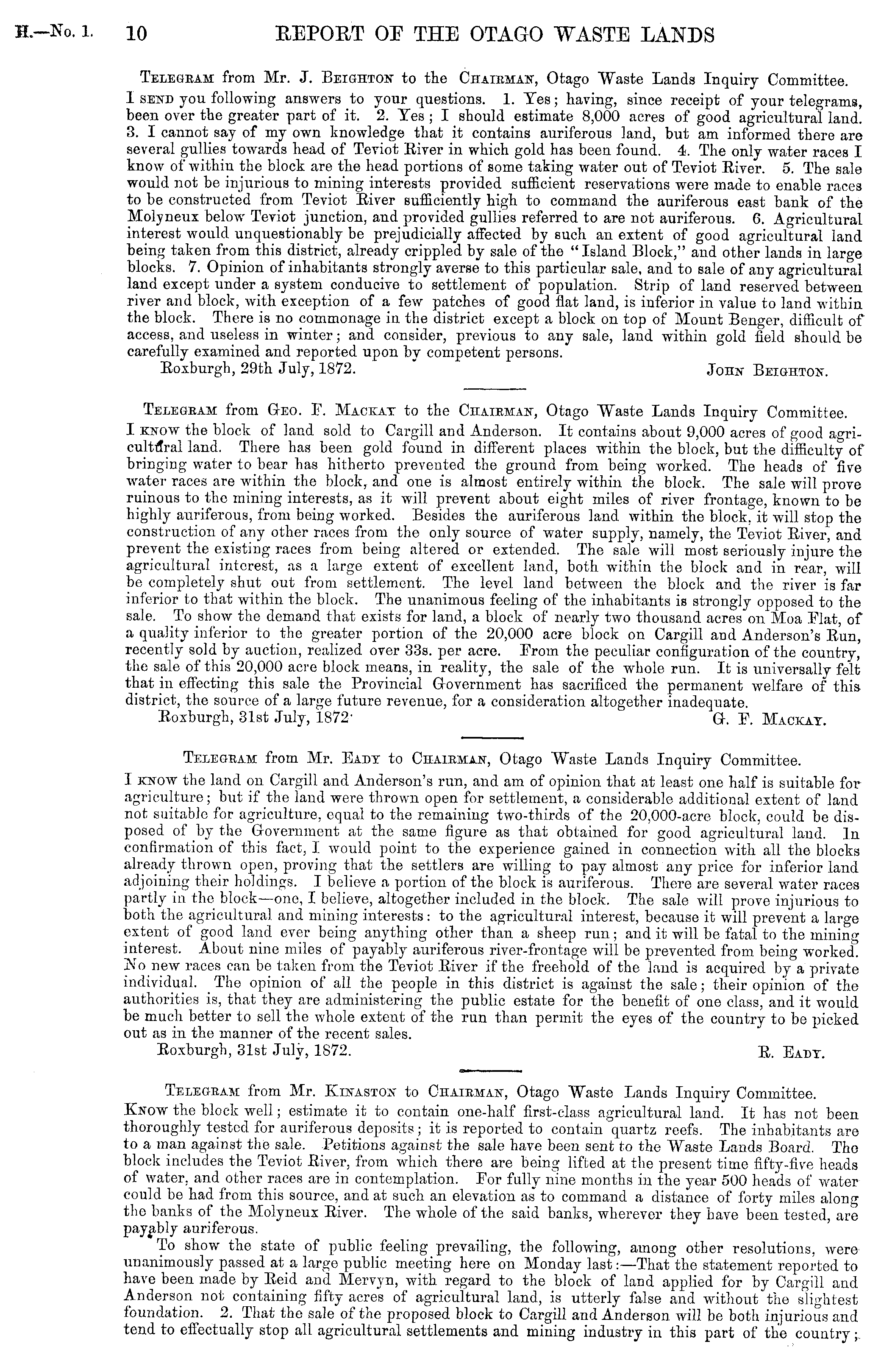 Telegeam from Mr. J. Beighton to the Chaieman, Otago Waste Lands Inquiry Committee. I send you following answers to your questions. 1. Tes; having, since receipt of your telegrams, been over the greater part of it. 2. Tes ; I should estimate 8,000 acres of good agricultural land. 3. I cannot say of my own knowledge that it contains auriferous land, but am informed there are several gullies towards head of Teviot River in which gold has been found. 4. The only water races I know of within the block are the head portions of some taking water out of Teviot River. 5. The sale would not be injurious to mining interests provided sufficient reservations were made to enable races to be constructed from Teviot River sufficiently high to command the auriferous east bank of the Molyneux below Teviot junction, and provided gullies referred to are not auriferous. 6. Agricultural interest would unquestionably be prejudicially affected by such an extent of good agricultural land being taken from this district, already crippled by sale of the "Island Block," and other lands in large blocks. 7. Opinion of inhabitants strongly averse to this particular sale, and to sale of any agricultural land except under a system conducive to settlement of population. Strip of land reserved between river and block, with exception of a few patches of good flat land, is inferior in value to land within the block. There is no commonage in the district except a block on top of Mount Benger, difficult of access, and useless in winter; and consider, previous to any sale, land within gold field should be carefully examined and reported upon by competent persons. Roxburgh, 29th July, 1872. John Beighton.