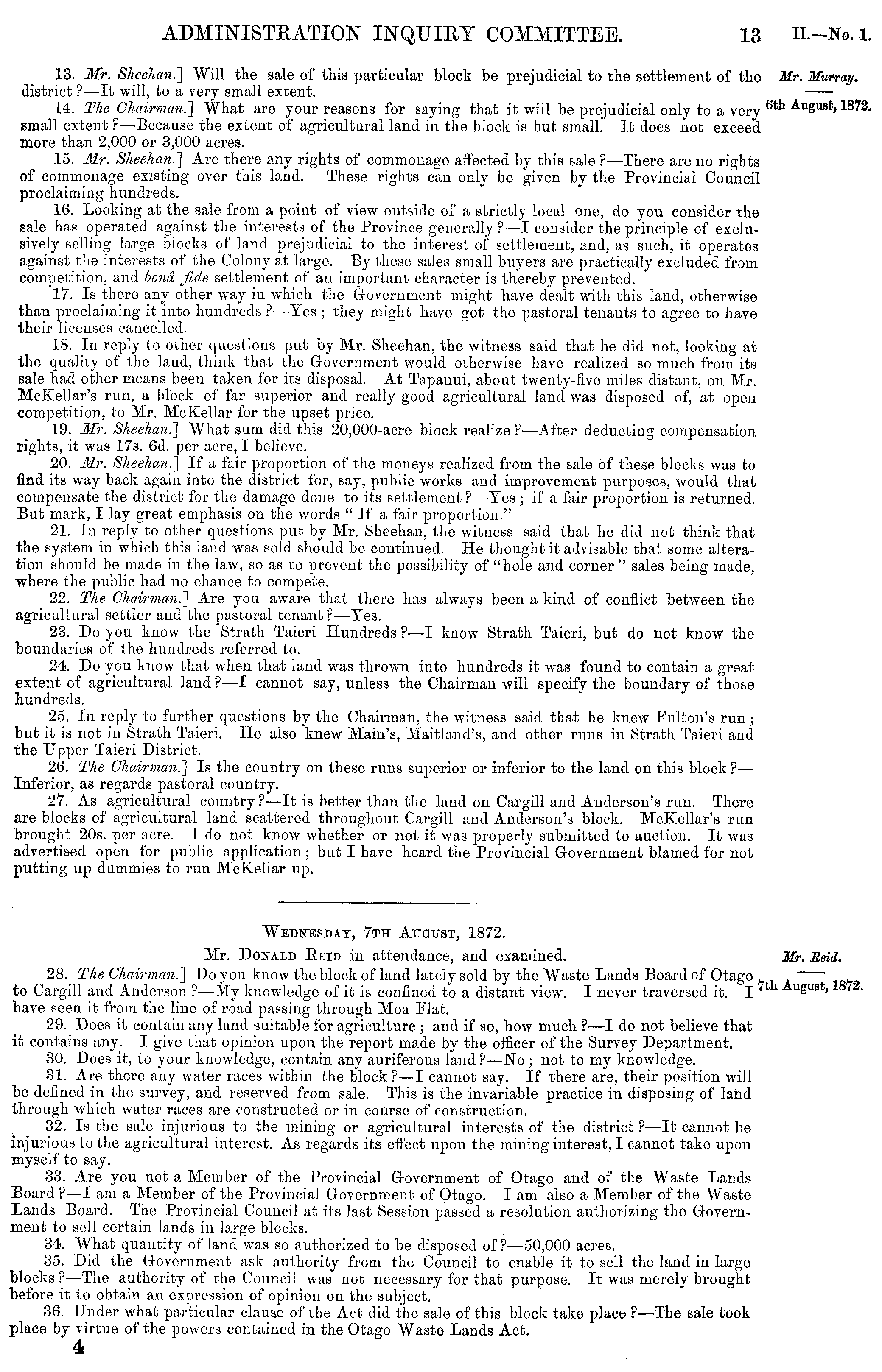Wednesday, 7th August, 1872. Mr. Donald Eeid in attendance, and examined. 28. The Chairman.] Do you know the block of land lately sold by the Waste Lands Board of Otago to Cargill and Anderson ?—My knowledge of it is confined to a distant view. I never traversed it. I have seen it from the line of road passing through Moa Flat. 29. Does it contain any land suitable for agriculture ; and if so, how much ?—I do not believe that it contains any. I give that opinion upon the report made by the officer of the Survey Department. 30. Does it, to your knowledge, contain any auriferous land ? —No ; not to my knowledge. 31. Are there any water races within the block?—l cannot say. If there are, their position will be defined in the survey, and reserved from sale. This is the invariable practice in disposing of land through which water races are constructed or in course of construction. 32. Is the sale injurious to the mining or agricultural interests of the district ?—lt cannot be injurious to the agricultural interest. As regards its effect upon the mining interest, I cannot take upon myself to say. 33. Are you not a Member of the Provincial Government of Otago and of the Waste Lands Board ? —I am a Member of the Provincial Government of Otago. lam also a Member of the Waste Lands Board. The Provincial Council at its last Session passed a resolution authorizing the Government to sell certain lands in large blocks. 34. What quantity of land was so authorized to be disposed of?- —50,000 acres. 35. Did the Government ask authority from the Council to enable it to sell the land in large blocks ? —The authority of the Council was not necessary for that purpose. It was merely brought before it to obtain an expression of opinion on the subject. 36. Under what particular clause of the Act did the sale of this block take place ?—The sale took place by virtue of the powers contained in the Otago Waste Lands Act. 4