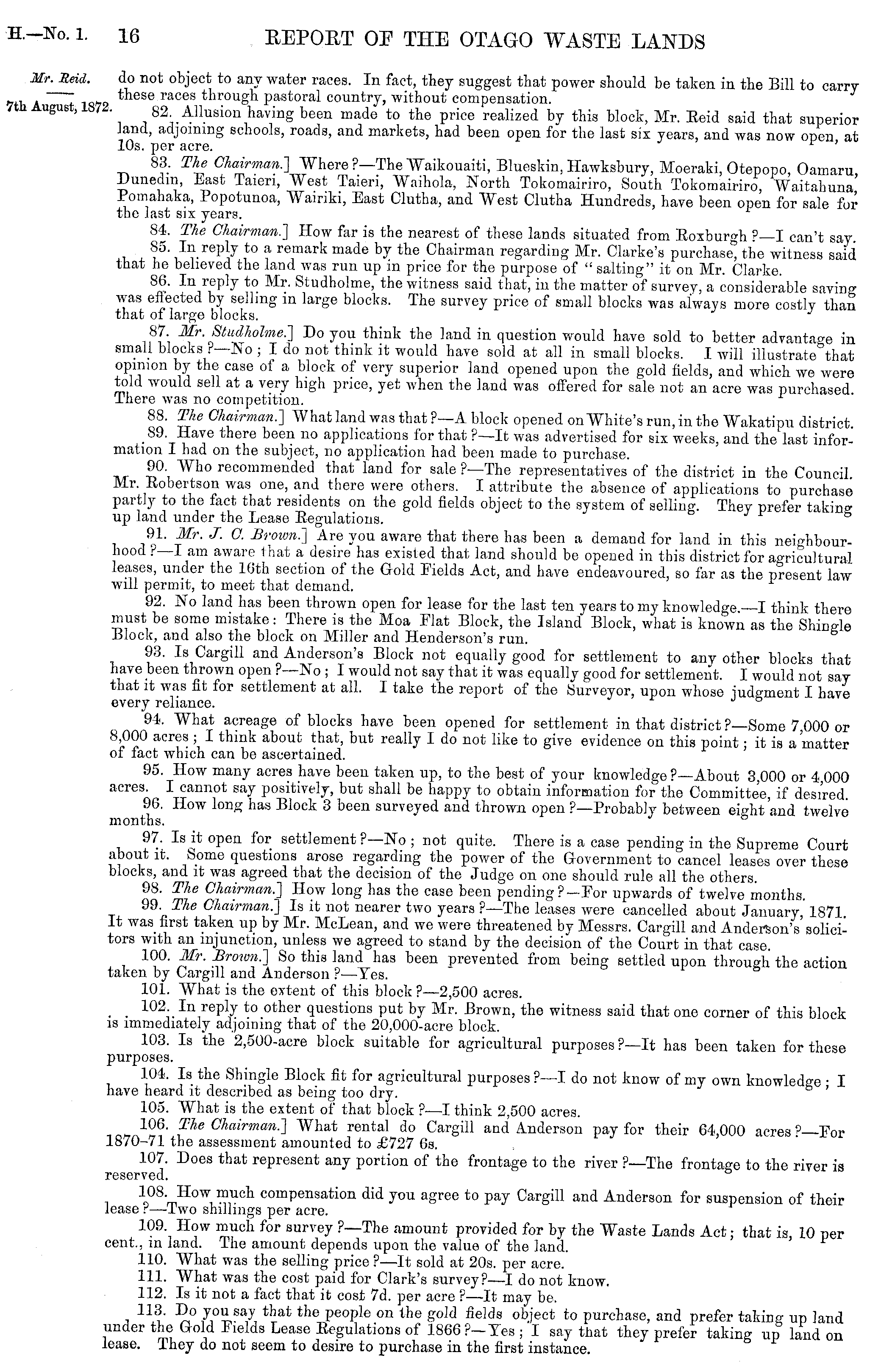 do not object to any water races. In fact, they suggest that power should be taken in the Bill to carry these races through pastoral country, without compensation. 82^ Allusion having been made to the price realized by this block, Mr. Eeid said that superior land, adjoining schools, roads, and markets, had been open for the last six years, and was now open at 10s. per acre. r ' 83. The Chairman.] Where ?—The Waikouaiti, Blueskin, Hawksbury, Moeraki, Otepopo, Oamaru, Dunedin, East Taieri, West Taieri, Waihola, North Tokomairiro, South Tokomairiro, Vaitahuna Pomabaka, Popotunoa, Wairiki, East Clutha, and West Clutha Hundreds, have been open for sale for the last six years. 84. The Chairman.] How far is the nearest of these lands situated from Eoxburgh ?—I can't say 85. In reply to a remark made by the Chairman regarding Mr. Clarke's purchase, the witness said that he believed the land was run up in price for the purpose of " salting" it on Mr. Clarke. 86. In reply to Mr. Studholme, the witness said that, in the matter of survey, a considerable saving was effected by selling in large blocks. The survey price of small blocks was always more costly than that of large blocks. J ul'i ]i( r- Studholme-'] Do you think the land in question would have sold to better advantage in small blocks ?—No ;I do not think it would have sold at all in small blocks. I will illustrate that opinion by the case of a block of very superior land opened upon the gold fields, and which we were told woufd sell at a very high price, yet when the land was offered for sale not an acre was purchased There was no competition. 88. The Chairman.] What land was that ?—A block opened on White's run, in the Wakatipu district _ 89. Have there been no applications for that ?—lt was advertised for six weeks, and the last information I had on the subject, no application had been made to purchase. 90. Who recommended that land for sale ?—The representatives of the district in the Council Mr. Eobertson was one, and there were others. I attribute the absence of applications to purchase partly to the fact that residents on the gold fields object to the system of selling. They prefer taking up land under the Lease Eegulations. ■■ j s 91. Mr. J. C. Brown.] Are you aware that there has been a demand for land in this neighbourhood ?—I am aware that a desire has existed that land should be opened in this district for a°ricultural leases, under the 16th section of the Gold Fields Act, and have endeavoured, so far as the present law will permit, to meet that demand. 92. No land has been thrown open for lease for the last ten years to my knowledge—l think there must be some mistake: There is the Moa Flat Block, the Island Block, what is known as the Shingle Block, and also the block on Miller and Henderson's run. 93. Is Cargill and Anderson's Block not equally good for settlement to any other blocks that have been thrown open ?—No ; I would not say that it was equally good for settlement. I would not say that it was fit for settlement at all. I take the report of the Surveyor, upon whose judgment I have every reliance. 94. What acreage of blocks have been opened for settlement in that district ?—Some 7 000 or 8 000 acres ; I think about that, but really Ido not like to give evidence on this point; it is a matter of fact which can be ascertained. 95. How many acres have been taken up, to the best of your knowledge ?—About 3,000 or 4 000 acres. I cannot say positively, but shall be happy to obtain information for the Committee, if desired 96. How long has Block 3 been surveyed and thrown open ?—Probably between eight'and twelve months. 97. Is it open for settlement ?—No ; not quite. There is a case pending in the Supreme Court about it. Some questions arose regarding the power of the Government to cancel leases over these blocks, and it was agreed that the decision of the Judge on one should rule all the others. 98. The Chairman.] How long has the case been pending?— For upwards of twelve months. 99 The Chairman.] Is it not nearer two years ?—The leases were cancelled about January 1871 It was first taken up by Mr. McLean, and we were threatened by Messrs. Cargill and Anderson's solicitors with an injunction, unless we agreed to stand by the decision of the Court in that case. 100. Mr. Brown.] So this land has been prevented from being settled upon through the action taken by Cargill and Anderson ? —Tes. 101. What is the extent of this block ? —2,500 acres. _ _ 102. In reply to other questions put by Mr. Brown, the witness said that one corner of this block is immediately adjoining that of the 20,000-acre block. 103. Is the 2,500-acre block suitable for agricultural purposes ?—lt has been taken for these purposes. 104. Is the Shingle Block fit for agricultural purposes P—l do not know of my own knowledge • I have heard it described as being too dry. ' 105. What is the extent of that block ?—I think 2,500 acres. 106. The Chairman.] What rental do Cargill and Anderson pay for their 64,000 acres ?—For 18/0-71 the assessment amounted to £727 6s. 107 Does that represent any portion of the frontage to the river ?—The frontage to the river is reserved. 108I 08- How, ™, ucn compensation did you agree to pay Cargill and Anderson for suspension of their lease r—Two shillings per acre. 109 How much for survey ?—The amount provided for by the Waste Lands Act; that is, 10 per cent., m land. The amount depends upon the value of the land. 110. What was the selling price ?—lt sold at 20s. per acre. 111. What was the cost paid for Clark's survey?—l do not know. 112. Is it not a fact that it cost 7d. per acre ?—lt may be. 113 Do you say that the people on the gold fields object to purchase, and prefer taking up land under the Gold Fields Lease Eegulations of 1866?—Tes ; I say that they prefer taking up land on lease. They do not seem to desire to purchase in the first instance.