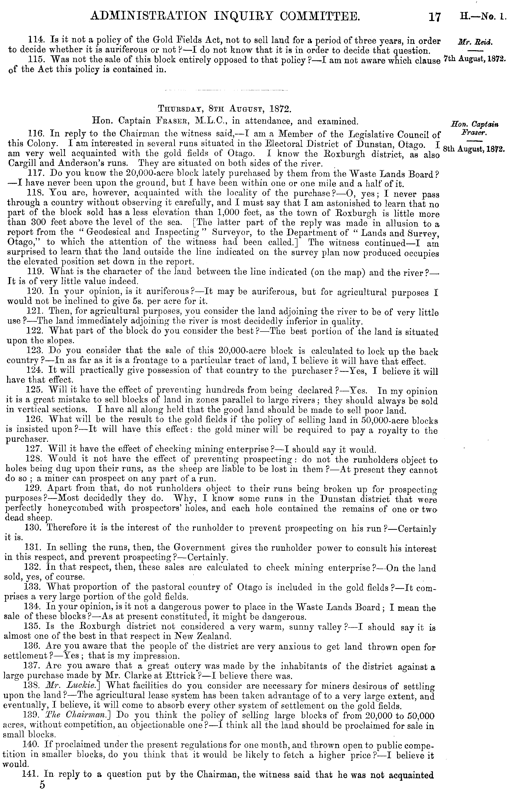 Thursday, Bth August, 1872. Hon. Captain Phaser, M.L.C., in attendance, and examined. 116. In reply to the Chairman the witness said, —I am a Member of the Legislative Council of this Colony. lam interested in several runs situated in the Electoral District of Dunstan, Otago. I am very well acquainted with the gold fields of Otago. I know the Eoxburgh district, as also Cargill and Anderson's runs. They are situated on both sides of the river. 117. Do you know the 20,000-acre block lately purchased by them from the Waste Lands Board? —I have never been upon the ground, but I have been within one or one mile and a half of it. 118. Tou are, however, acquainted with the locality of the purchase ?■ —O, yes; I never pass through a country without observing it carefully, and I must say that I am astonished to learn that no part of the block sold has a less elevation than 1,000 feet, as the town of Eoxburgh is little more than 300 feet above the level of the sea. [The latter part of the reply was made in allusion to a report from the " Geodesical and Inspecting " Surveyor, to the Department of " Lands and Survey, Otago," to which the attention of the witness had been called.] The witness continued —I am surprised to learn that the land outside the line indicated on the survey plan now produced occupies the elevated position set down in the report. 119. What is the character of the land between the line indicated (on the map) and the river ?—■ It is of very little value indeed. 120. In your opinion, is it auriferous ? —lt may be auriferous, but for agricultural purposes I would not be inclined to give ss. per acre for it. 121. Then, for agricultural purposes, you consider the land adjoining the river to be of very little use ?—The land immediately adjoining the river is most decidedly inferior in quality. 122. What part of the block do you consider the best ? —The best portion of the land is situated upon the slopes. 123. Do you consider that the sale of this 20,000-acre block is calculated to lock up the back country ?—ln as far as it is a frontage to a particular tract of land, I believe it will have that effect. 124. It will practically give possession of that country to the purchaser?—Tes, I believe it will have that effect. 125. Will it have the effect of preventing hundreds from being declared ?—Tes. In my opinion it is a great mistake to sell blocks of land in zones parallel to large rivers; they should always be sold in vertical sections. I have all along hold that the good land should be made to sell poor land. 126. What will be the result to the gold fields if the policy of selling land in 50,000-acre blocks is insisted upon ? —lt will have this effect: the gold miner will be required to pay a royalty to the purchaser. 127. Will it have the effect of checking mining enterprise ? —I should say it would. 128. Would it not have the effect of preventing prospecting : do not the runholdors object to holes being dug upon their runs, as the sheep are liable to be lost in them ? —At present they cannot do so ; a miner can prospect on any part of a run. 129. Apart from that, do not runholders object to their runs being broken up for prospecting purposes? —Most decidedly they do. Why, I know some runs in the Dunstan district that were perfectly honeycombed with prospectors' holes, and each hole contained the remains of one or two dead sheep. 130. Therefore it is the interest of the runholder to prevent prospecting on his run ?—Certainly it is. 131. In selling the runs, then, the Government gives the runholder power to consult his interestin this respect, and prevent prospecting? —Certainly. 132. In that respect, then, these sales are calculated to check mining enterprise ?—On the land sold, yes, of course. 133. What proportion of the pastoral country of Otago is included in the gold fields ? —lt comprises a very large portion of the gold fields. 134. In your opinion, is it not a dangerous power to place in the Waste Lands Board ; I mean the sale of these blocks ? —As at present constituted, it might be dangerous. 135. Is the Eoxburgh district not considered a very warm, sunny valley ? —I should say it is almost one of the best in that respect in New Zealand. 136. Are you aware that the people of the district are very anxious to get land thrown open for settlement? —Tes; that is my impression. 137. Are you aware that a great outcry was made by the inhabitants of the district against a large purchase made by Mr. Clarke at Ettrick ? —I believe there was. 138. Mr. Luckie.] What facilities do you consider are necessary for miners desirous of settling upon the land ? —The agricultural lease system has been taken advantage of to a very large extent, and eventually, I believe, it will come to absorb every other system of settlement on the gold fields. 139. The Chairman.] Do you think the policy of selling large blocks of from 20,000 to 50,000 acres, without competition, an objectionable one? —1 think all the land should be proclaimed for sale in small blocks. 140. If proclaimed under the present regulations for one month, and thrown open to public competition in smaller blocks, do you think that it would be likely to fetch a higher price ?—I believe it would. 141. In reply to a question put by the Chairman, the witness said that he was not acquainted 5
