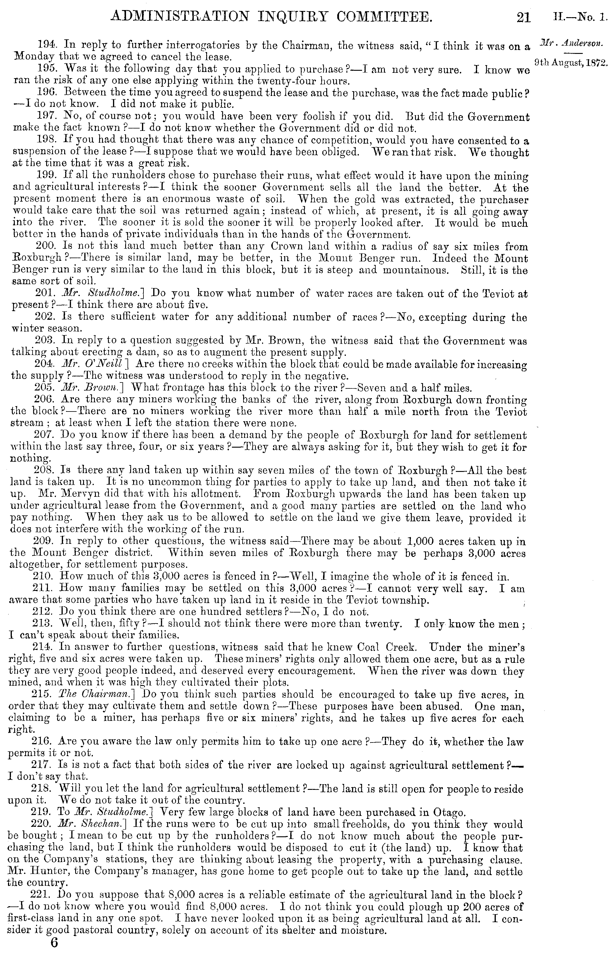 194. In reply to further interrogatories by the Chairman, the witness said, " I think it was on a Monday that we agreed to cancel the lease. 195. Was it the following day that you applied to purchase ?—I am not very sure. I know we ran the risk of any one else applying within the twenty-four hours. 196. Between the time you agreed to suspend the lease and the purchase, was the fact made public ? —I do not know. I did not make it public. 197. No, of course not; you would have been very foolish if you did. But did the Government make the fact known ? —I do not know whether the Government did or did not. 198. If you had thought that there was any chance of competition, would you have consented to a suspension of the lease ? —I suppose that we would have been obliged. We ran that risk. We thought at the time that it was a great risk. 199. If all the runholders chose to purchase their runs, what effect would it have upon the mining and agricultural interests ? —I think the sooner Government sells all the land the better. At the present moment there is an enormous waste of soil. When the gold was extracted, the purchaser would take care that the soil was returned again; instead of which, at present, it is all going away into tho river. The sooner it is sold the sooner it will be properly looked after. It would be much better in the hands of private individuals than in the hands of the Government. 200. Is not this land much better than any Crown land within a radius of say six miles from Eoxburgh ?—There is similar land, may be better, in the Mount Benger run. Indeed the Mount Benger run is very similar to the land in this block, but it is steep and mountainous. Still, it is the same sort of soil. 201. Mr. Studholme.] Do you know what number of water races are taken out of the Teviot at present ?—I think there are about five. 202. Is there sufficient water for any additional number of races ? —No, excepting during the winter season. 203. In reply to a question suggested by Mr. Brown, the witness said that the Government was talking about erecting a dam, so as to augment the present supply. 204. Mr. O'Neill] Are there no creeks within the block that could be made available for increasing the supply ?—The witness was understood to reply in the negative. 205. Mr. Brown.] What frontage has this block to the river ? —Seven and a half miles. 206. Are there any miners working the banks of the river, along from Eoxburgh down fronting the block ? —There are no miners working the river more than half a mile north from the Teviot stream ; at least when I left the station there were none. 207. Do you know if there has been a demand by tho people of Eoxburgh for land for settlement within the last say three, four, or six years ? —They are always asking for it, but they wish to get it for nothing. 208. Is there any land taken up within say seven miles of the town of Eoxburgh ?—All the best land is taken up. It is no uncommon thing for parties to apply to take up land, and then not take it up. Mr. Mervyn did that with his allotment. Erom Eoxburgh upwards the land has been taken up under agricultural lease from the Government, and a good many parties are settled on the land who pay nothing. When they ask us to be allowed to settle on the land we give them leave, provided it does not interfere with the working of the run. 209. In reply to other questions, the witness said —There may be about 1,000 acres taken up in the Mount Benger district. Within seven miles of Eoxburgh there may be perhaps 3,000 acres altogether, for settlement purposes. 210. How much of this 3,000 acres is fenced in ?—Well, I imagine the whole of it is fenced in. 211. How many families may be settled on this 3,000 acres ? —I cannot very well say. lam aware that some parties who have taken up land in it reside in the Teviot township. 212. Do you think there are one hundred settlers? —No, I do not. 213. Well, then, fifty ? —I should not think there were more than twenty. I only know the men ; I can't speak about their families. 214. In answer to further questions, witness said that he knew Coal Creek. Under the miner's right, five and six acres were taken up. These miners' rights only allowed them one acre, but as a rule they are very good people indeed, and deserved every encouragement. When the river was down they mined, and when it was high they cultivated their plots. 215. The Chairman.] Do you think such parties should be encouraged to take up five acres, in order that they may cultivate them and settle down ? —These purposes have been abused. One man, claiming to be a miner, has perhaps five or six miners' rights, and he takes up five acres for each right. 216. Are you aware the law only permits him to take up one acre ? —They do it, whether the law permits it or not. 217. Is is not a fact that both sides of the river are locked up against agricultural settlement ?— I don't say that. 218. Will you let the land for agricultural settlement ? —The land is still open for people to reside upon it. We do not take it out of the country. 219. To Mr. Studholme.] Very few large blocks of land have been purchased in Otago. 220. Mr. Sheehan.] If the runs were to be cut up into small freeholds, do you think they would bo bought; I mean to be cut up by the runholders ?—I do not know much about the people purchasing the land, but I think the runholders would be disposed to cut it (the land) up. I know that on the Company's stations, they are thinking about leasing the property, with a purchasing clause. Mr. Hunter, the Company's manager, has gone home to get people out to take up the land, and settle the country. 221. Do you suppose that 8,000 acres is a reliable estimate of the agricultural land in the block ? —I do not know where you would find 8,000 acres. Ido not think you could plough up 200 acres of first-class land in any one spot. I have never looked upon it as being agricultural land at all. I c