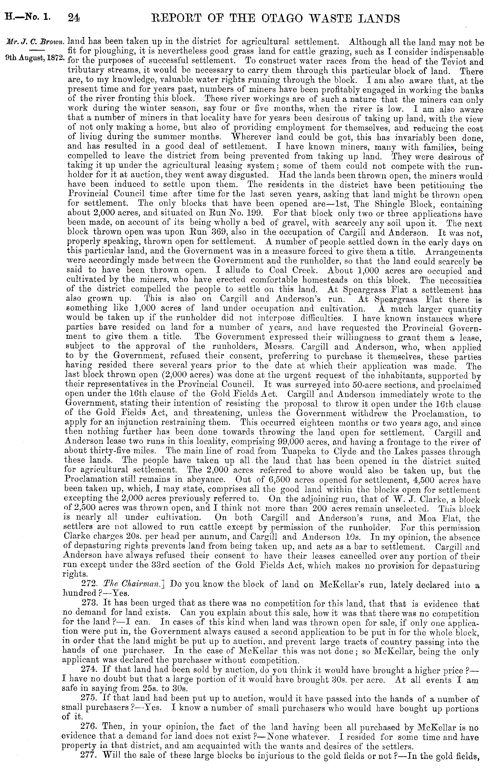 land has been taken up in the district for agricultural settlement. Although all the land may not be fit for ploughing, it is nevertheless good grass land for cattle grazing, such as I consider indispensable for the purposes of successful settlement. To construct water races from the head of the Teviot and tributary streams, it would be necessary to carry them through this particular block of land. There are, to my knowledge, valuable water rights running through the block. lam also aware that, at the present time and for years past, numbers of miners have been profitably engaged in working the banks of the river fronting this block. These river workings are of such a nature that the miners can only work during the winter season, say four or five months, when the river is low. I am also aware that a number of miners in that locality have for years been desirous of taking up land, with the view of not only making a home, but also of providing employment for themselves, and reducing the cost of living during the summer months. Wherever land could be got, this has invariably been done, and has resulted in a good deal of settlement. I have known miners, many with families, being compelled to leave the district from being prevented from taking up land. They were desirous of taking it up under the agricultural leasing system; some of them could not compete with the runholder for it at auction, they went away disgusted. Had the lands been thrown open, the miners would have been induced to settle upon them. The residents in the district have been petitioning the Provincial Council time after time for the last seven years, asking that land might be thrown open for settlement. The only blocks that have been opened are —Ist, The Shingle Block, containing about 2,000 acres, and situated on Eun No. 199. For that block only two or three applications have been made, on account of its being wholly a bed of gravel, with scarcely any soil upon it. The next block thrown open was upon Eun 369, also in the occupation of Cargill and Anderson. It was not, properly speaking, thrown open for settlement. A number of people settled down in the early days on this particular land, and the Government was in a measure forced to give them a title. Arrangements were accordingly made between the Government and the runholder, so that the land could scarcely be said to have been thrown open. I allude to Coal Creek. About 1,000 acres are occupied and cultivated by the miners, who have erected comfortable homesteads on this block. The necessities of the district compelled the people to settle on this land. At Speargrass Flat a settlement has also grown up. This is also on Cargill and Anderson's run. At Speargrass Flat there is something like 1,000 acres of land under occupation and cultivation. A much larger quantity would be taken up if the runholder did not interpose difficulties. I have known instances where parties have resided on land for a number of years, and have requested the Provincial Government to give them a title. The Government expressed their willingness to grant them a lease, subject to the approval of the runholders, Messrs. Cargill and Anderson, who, when applied to by the _ Government, refused their consent, preferring to purchase it themselves, these parties having resided there several years prior to the date at which their application was made. The last block thrown open (2,000 acres) was done at the urgent request of the inhabitants, supported by their representatives in the Provincial Council. It was surveyed into 50-acre sections, and proclaimed open under the 16th clause of the Gold Fields Act. Cargill and Anderson immediately wrote to the Government, stating their intention of resisting the proposal to throw it open under the 16th clause of the Gold Fields Act, and threatening, unless the Government withdrew the Proclamation, to apply for an injunction restraining them. This occurred eighteen months or two years ago, and since then nothing further has been done towards throwing the land open for settlement. Cargill and Anderson lease two runs in this locality, comprising 99,000 acres, and having a frontage to the river of about thirty-five miles. The main line of road from Tuapeka to Clyde and the Lakes passes through these lands. The people have taken up all the land that has been opened in the district suited for agricultural settlement. The 2,000 acres referred to above would also be taken up, but the Proclamation still remains in abeyance. Out of 6,500 acres opened for settlement, 4,500 acres have been taken up, which, I may state, comprises all the good land within the blocks open for settlement excepting the 2,000 acres previously referred to. On the adjoining run, that of W. J. Clarke, a block of 2,500 acres was thrown open, and I think not more than 200 acres remain unselected. This block is nearly all under cultivation. On both Cargill and Anderson's runs, and Moa Flat, the settlers are not allowed to run cattle except by permission of the runholder. For this permission Clarke charges 20s. per head per annum, and Cargill and Anderson 10s. In my opinion, the absence of depasturing rights prevents land from being taken up, and acts as a bar to settlement. Cargill and Anderson have always refused their consent to have their leases cancelled over any portion of their run except under the 33rd section of the Gold Fields Act, which makes no provision for depasturing rights. 272. The Chairman^] Do you know the block of land on McKellar's run, lately declared into a hundred ? —Tes. 273. It has been urged that as there was no competition for this land, that that is evidence that no demand for land exists. Can you explain about this sale, how it was that there was no competition for the land ?• —I can. In cases of this kind when land was thrown open for sale, if only one application were put in, the Government always caused a second application to be put in for the whole block, in order tha
