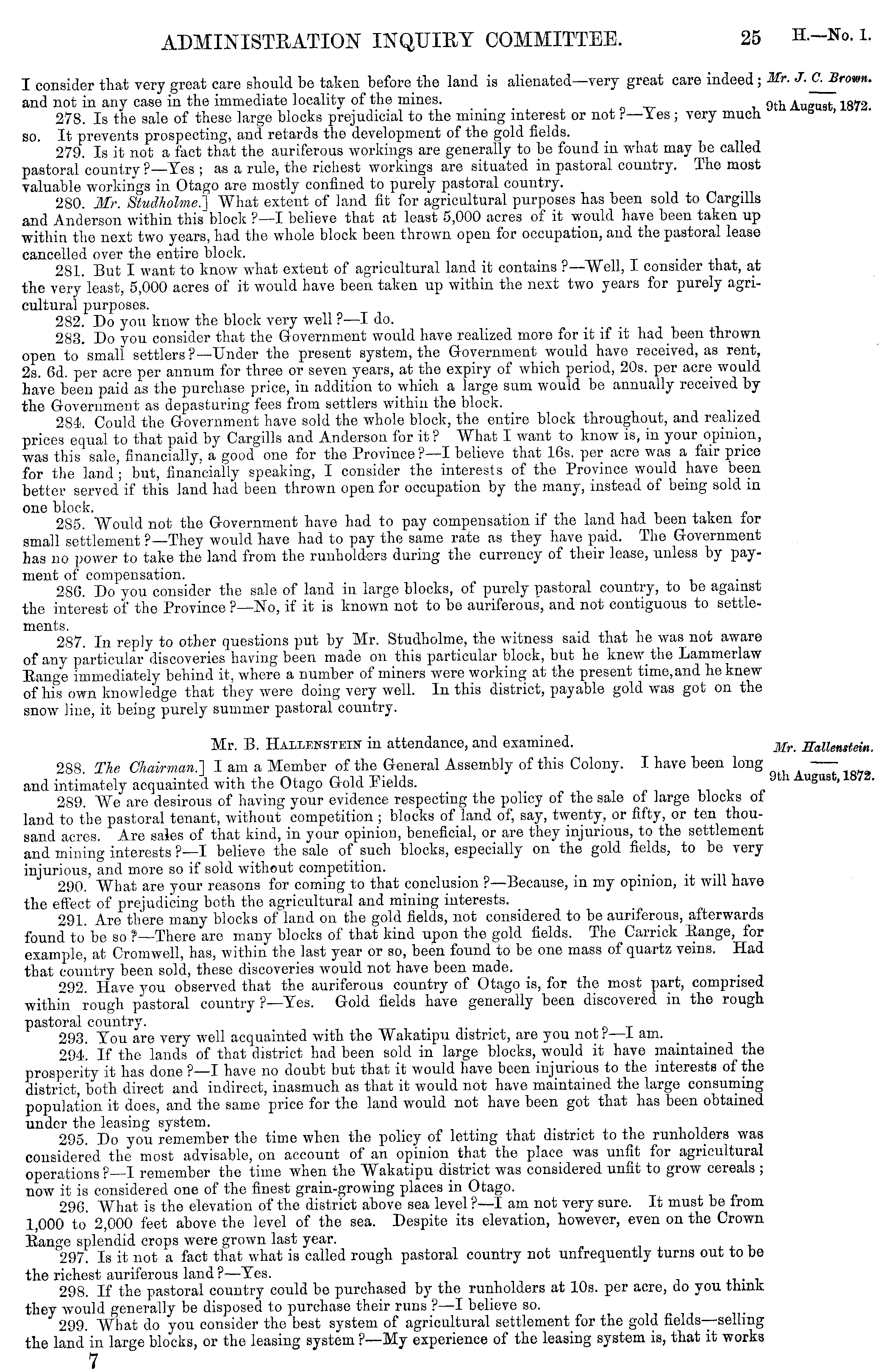 I consider that very great care should be taken before the land is alienated—very great care indeed; - and not in any case in the immediate locality of the mines. , 278. Is the sale of these large blocks prejudicial to the mining interest or not ?—Tes ; very much ' so. It prevents prospecting, and retards the development of the gold fields. 279. Is it not a fact that the auriferous workings are generally to be found in what may be called pastoral country ?—Tes ;as a rule, the richest workings are situated in pastoral country. The most valuable workings in Otago are mostly confined to purely pastoral country. 280. Mr. Studholme.] What extent of land fit for agricultural purposes has been sold to Cargills and Anderson within this block ?—I believe that at least 5,000 acres of it would have been taken up within the next two years, had the whole block been thrown open for occupation, and the pastoral lease cancelled over the entire block. 281. But I want to know what extent of agricultural land it contains ?—Well, I consider that, at the very least, 5,000 acres of it would have been taken up within the next two years for purely agricultural purposes. 282. Do you know the block very well ? —I do. 283. Do you consider that the Government would have realized more for it if it had been thrown open to small settlers ?—Under the present system, the Government would _ have received, as rent, 2s. 6d. per acre per annum for three or seven years, at the expiry of which period, 20s. per acre would have been paid as the purchase price, in addition to which a large sum would be annually received by the Government as depasturing fees from settlers within the block. 284. Could the Government have sold the whole block, the entire block throughout, and realized prices equal to that paid by Cargills and Anderson for it ? What I want to know is, in your opinion, was this sale, financially, a good one for the Province?—l believe that 16s. per acre was a fair price for the land ; but, financially speaking, I consider the interests of the Province would have been better served'if this land had been thrown open for occupation by the many, instead of being sold in one block. . .„,,,,,, , , n 285. Would not the Government have had to pay compensation if the land had been taken lor small settlement ?—They would have had to pay the same rate as they have paid. The Government has no power to take the land from the runholders during the currency of their lease, unless by payment of compensation. 256. Do you consider tho sale of land in large blocks, of purely pastoral country, to be against the interest of the Province ?—No, if it is known not to be auriferous, and not contiguous to settlements. 287. In reply to other questions put by Mr. Studholme, the witness said that he was not aware of any particular discoveries having been made on this particular block, but he knewthe Lammerlaw Eange immediately behind it, where a number of miners were working at the present time,and he knew of his own knowledge that they were doing very well. In this district, payable gold was got on the snow line, it being purely summer pastoral country. Mr. B. Hallenstein in attendance, and examined. 288. The Chairman.] lam a Member of the General Assembly of this Colony. I have been long and intimately acquainted with the Otago Gold Fields. 289. We are desirous of having your evidence respecting the policy of the sale of large blocks ol land to the pastoral tenant, without competition ; blocks of land of, say, twenty, or fifty, or ten thousand acres. Are sales of that kind, in your opinion, beneficial, or are they injurious, to the settlement and mining interests ?—I believe the sale of such blocks, especially on the gold fields, to bo very injurious, and more so if sold without competition. _ _ _ ..'.„, 290. What are your reasons for coming to that conclusion ?—Because, in my opinion, it will have the effect of prejudicing both the agricultural and mining interests. 291. Are there many blocks of land on the gold fields, not considered to be auriferous, afterwards found to be so ?—There are many blocks of that kind upon the gold fields. The Carrick Eange, for example, at Cromwell, has, within the last year or so, been found to be one mass of quartz veins. Had that country been sold, these discoveries would not have been made. 292. Have you observed that the auriferous country of Otago is, for the most part, comprised within rough pastoral country ?—Tes. Gold fields have generally been discovered in the rough pastoral country. 293. Tou are very well acquainted with the Wakatipu district, are you not ? —1 am. 294. If the lands of that district had been sold in large blocks, would it have maintained the prosperity it has done ?—I have no doubt but that it would have been injurious to the interests of the district, both direct and indirect, inasmuch as that it would not have maintained the large consuming population it does, and the same price for the land would not have been got that has been obtained under the leasing system. 295. Do you remember the time when the policy of letting that district to the runholders was considered the most advisable, on account of an opinion that the place was unfit for agricultural operations ?—I remember the time when the Wakatipu district was considered unfit to grow cereals ; now it is considered one of the finest grain-growing places in Otago. 296. What is the elevation of the district above sea level ?—I am not very sure. It must be from 1,000 to 2,000 feet above the level of the sea. Despite its elevation, however, even on the Crown Eange splendid crops were grown last year. 297. Is it not a fact that what is called rough pastoral country not unfrequently turns out to be the richest auriferous land ? —Tes. 298. If the pastoral country could be purchased by the runholders at 10s. per acre, do you think they would generally be disposed to purchase their runs ?—I beli