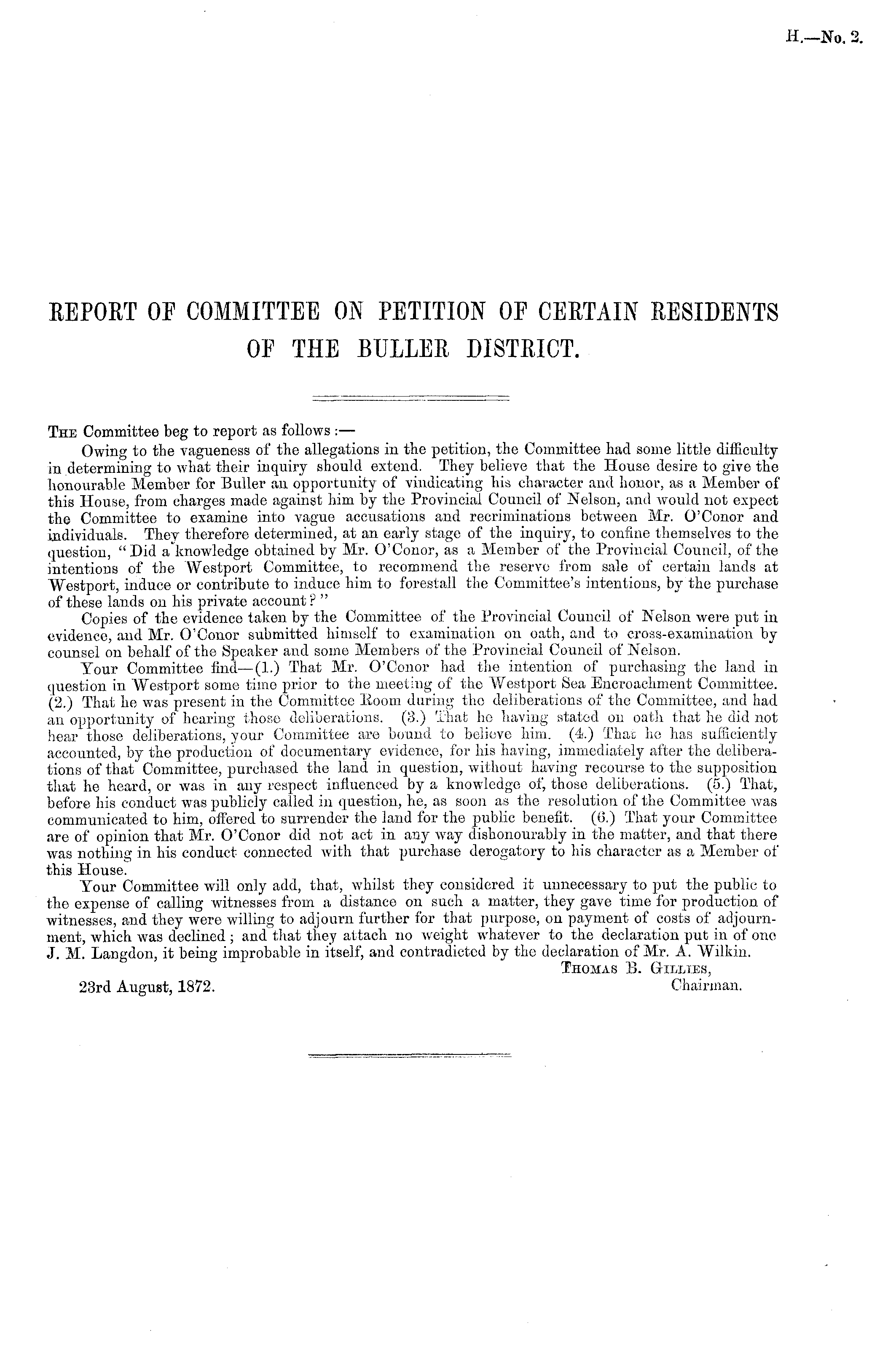The Committee beg to report as follows : — Owing to the vagueness of the allegations in the petition, the Committee had some little difficulty in determining to what their inquiry should extend. They believe that the House desire to give the honourable Member for Buller an opportunity of vindicating his character and honor, as a Member of this House, from charges made against him by the Provincial Council of Nelson, and would not expect the Committee to examine into vague accusations and recriminations between Mr. O'Conor and individuals. They therefore determined, at an early stage of the inquiry, to confine themselves to the question, "Did a'knowledge obtained by Mr. O'Conor, as a Member of the Provincial Council, of the intentions of the Westport Committee, to recommend the reserve from sale of certain lands at Westport, induce or contribute to induce him to forestall the Committee's intentions, by the purchase of these lands on his private account ? " Copies of the evidence taken by the Committee of the Provincial Council of Nelson were put in evidence, and Mr. O'Conor submitted himself to examination on oath, and to cross-examination by counsel on behalf of the Speaker and some Members of the Provincial Council of Nelson. Tour Committee find. — (1.) That Mr. O'Conor had the intention of purchasing the land in question in Westport some time prior to the meeting of the Westport Sea Encroachment Committee. (2.) That he was present in the Committee Room during the deliberations of the Committee, and had an opportunity of hearing those deliberations. (3.) That ho having stated on oath that he did not hear those deliberations, your Committee are bound to believe him. (4.) That he has sufficiently accounted, by the production of documentary evidence, for his having, immediately after the deliberations of that Committee, purchased the land in question, without having recourse to the supposition that he heard, or was in any respect influenced by a knowledge of, those deliberations. (5.) That, before his conduct was publicly called in question, he, as soon as the resolution of the Committee was communicated to him, offered to surrender the land for the public benefit. (6.) That your Committee are of opinion that Mr. O'Conor did not act in any way dishonourably in the matter, and that there was nothing in his conduct connected with that purchase derogatory to his character as a Member of this House. Tour Committee will only add, that, whilst they considered it unnecessary to put the public to the expense of calling witnesses from a distance on such a matter, they gave time for production of witnesses, and they were willing to adjourn further for that purpose, on payment of costs of adjournment, which was declined; and that they attach no weight whatever to the declaration put in of one J. M. Langdon, it being improbable in itself, and contradicted by the declaration of Mr. A. Wilkin. Thomas B. Gillies, 23rd August, 1872. Chairman.