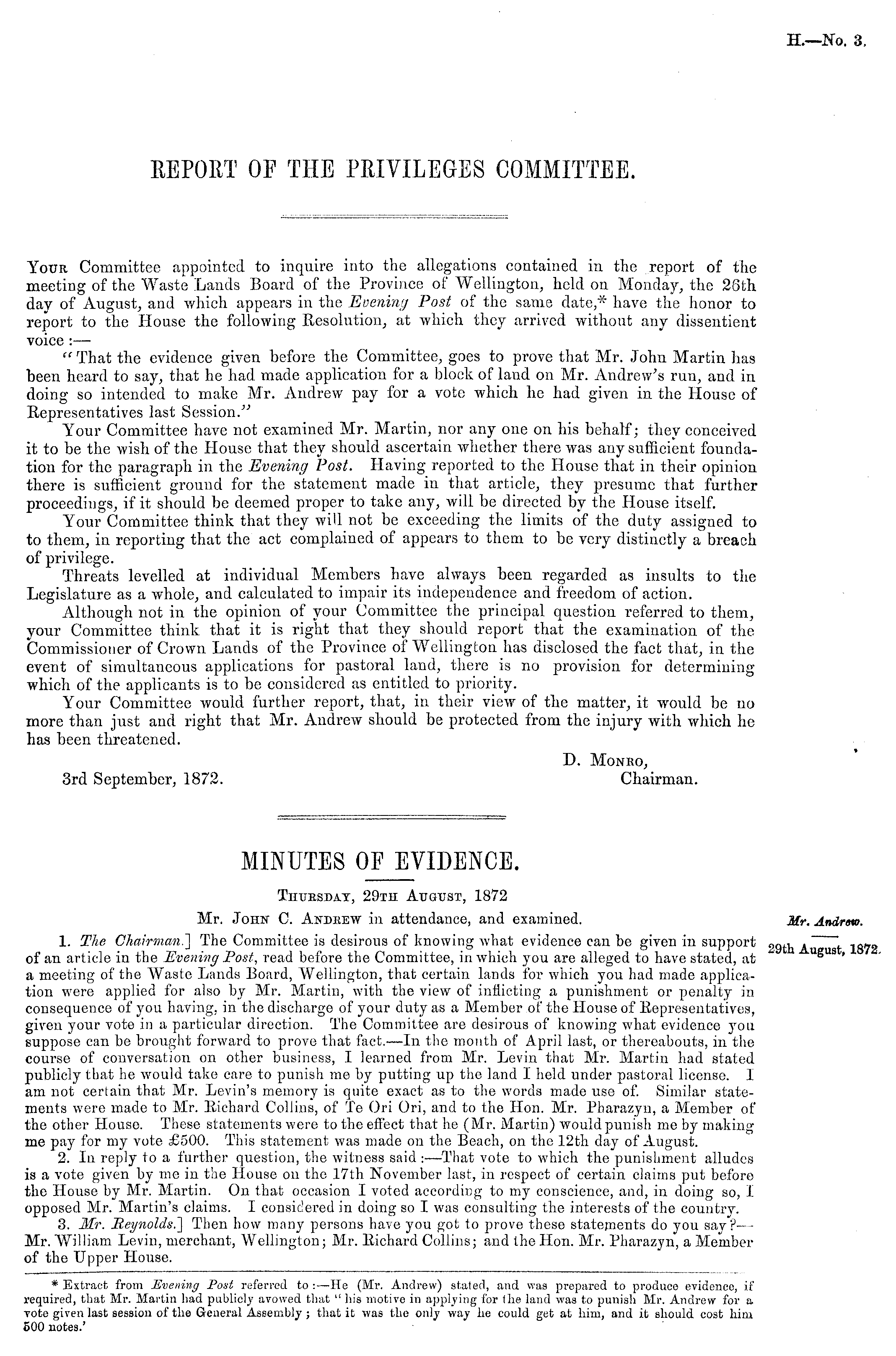 Youe Committee appointed to inquire into the allegations contained in the report of the meeting of the Waste Lands Board of the Province of Wellington, held on Monday, the 28th day of August, and which appears in the Evening Post of the same date,* have the honor to report to the House the following Resolution, at which they arrived without any dissentient voice :— " That the evidence given before the Committee, goes to prove that Mr. John Martin has been heard to say, that he had made application for a block of land on Mr. Andrew's run, and in doing so intended to make Mr. Andrew pay for a vote which he had given in the House of Representatives last Session." Your Committee have not examined Mr. Martin, nor any one on his behalf; they conceived it to be the wish of the House that they should ascertain whether there was any sufficient foundation for the paragraph in the Evening Post. Having reported to the House that in their opinion there is sufficient ground for the statement made in that article, they presume that further proceedings, if it should be deemed proper to take any, will be directed by the House itself. Your Committee think that they will not be exceeding the limits of the duty assigned to to them, in reporting that the act complained of appears to them to be very distinctly a breach of privilege. Threats levelled at individual Members have always been regarded as insults to the Legislature as a whole, and calculated to impair its independence and freedom of action. Although not in the opinion of your Committee the principal question referred to them, your Committee think that it is right that they should report that the examination of the Commissioner of Crown Lands of the Province of Wellington has disclosed the fact that, in the event of simultaneous applications for pastoral land, there is no provision for determining which of the applicants is to be considered as entitled to priority. Your Committee would further report, that, in their view of the matter, it would be no more than just and right that Mr. Andrew should be protected from the injury with which he has been threatened. IX Moneo, 3rd September, 1872. Chairman.