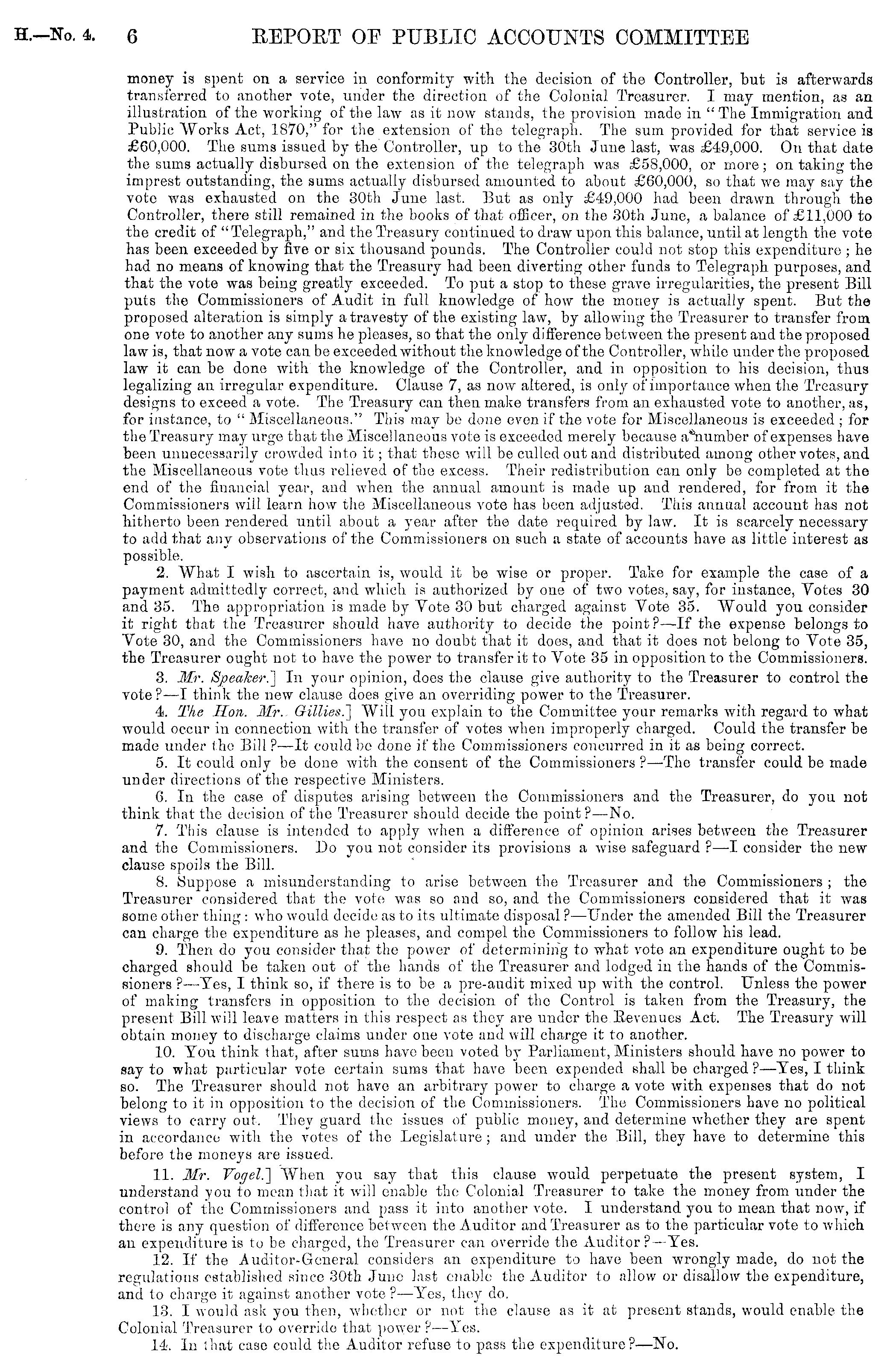 money is spent on a service in conformity with the decision of the Controller, but is afterwards transferred to another vote, under the direction of the Colonial Treasurer. I may mention, as an illustration of the working of the law as it now stands, the provision made in " The Immigration and Public Works Act, 1870," for the extension of the telegraph. The sum provided for that service is £60,000. The sums issued by the Controller, up to the 30th June last, was £49,000. On that date the sums actually disbursed on the extension of the telegraph was £58,000, or more; on taking the imprest outstanding, the sums actually disbursed amounted to about £60,000, so that we may say the vote was exhausted on the 30th dune last. But as only £49,000 had been drawn through the Controller, there still remained in the books of that officer, on the 30th June, a balance of £11,000 to the credit of "Telegraph," and the Treasury continued to draw upon this balance, until at length the vote has been exceeded by five or six thousand pounds. The Controller could not stop this expenditure ;he had no means of knowing that the Treasury had been diverting other funds to Telegraph purposes, and that the vote was being greatly exceeded. To put a stop to these grave irregularities, the present Bill puts the Commissioners of Audit in full, knowledge of how the money is actually spent. But the proposed alteration is simply a travesty of the existing law, by allowing the Treasurer to transfer from one vote to another any sums he pleases, so that the only difference between the present and the proposed law is, that now a vote can be exceeded without the knowledge of the Controller, while under the proposed law it can be done with' the knowledge of the Controller, and in opposition to his decision, thus legalizing an irregular expenditure. Clause 7, as now altered, is only of importance when the Treasury designs to exceed a vote. The Treasury can then make transfers from an exhausted vote to another, as, for instance, to " Miscellaneous." This may be done even if the vote for Miscellaneous is exceeded ; for the Treasury may urge that the Miscellaneous vote is exceeded merely because a*number of expenses have been unnecessarily crowded into it; that these will be culled out and distributed among other votes, and the Miscellaneous vote thus relieved of the excess. Their redistribution can only be completed at the end of the financial year, and when the annual amount is made up and rendered, for from it the Commissioners will learn how the Miscellaneous vote has been adjusted. This annual account has not hitherto been rendered until about a year after the date required by law. It is scarcely necessary to add that any observations of the Commissioners on such a state of accounts have as little interest as possible. 2. What I wish to ascertain is, would it be wise or proper. Take for example the case of a payment admittedly correct, and which is authorized by one of two votes, say, for instance, Votes 30 and 35. The appropriation is made by Vote 30 but charged against Vote 35. Would you consider it right that the Treasurer should have authority to decide the point?—lf the expense belongs to Vote 30, and the Commissioners have no doubt that it does, and that it does not belong to Vote 35, the Treasurer ought not to have the power to transfer it to Vote 35 in opposition to the Commissioners. 3. Mr. Speaker.] In your opinion, does the clause give authority to the Treasurer to control the vote?—l think the new clause does give an overriding power to the Treasurer. 4. The Hon. Mr., Gillies.] Will you explain to the Committee your remarks with regard to what would occur in connection with the transfer of votes when improperly charged. Could the transfer be made under the Bill ? —lt could be done if the Commissioners concurred in it as being correct. 5. It could only be done with the consent of the Commissioners ? —The transfer could be made under directions of the respective Ministers. 0. In the case of disputes arising between the Commissioners and the Treasurer, do you not think that the decision of the Treasurer should decide the point? —No. 7. This clause is intended to apply when a difference of opinion arises between the Treasurer and the Commissioners. Do you not consider its provisions a wise safeguard ? —I consider the new clause spoils fhe Bill. 8. Suppose a misunderstanding to arise between the Treasurer and the Commissioners ; the Treasurer considered that the vote was so and so, and the Commissioners considered that it was some other thing : who would decide as to its ultimate disposal ? —Under the amended Bill the Treasurer can charge the expenditure as he pleases, and compel the Commissioners to follow his lead. 9. Then do you consider that the power of determining to what vote an expenditure ought to be charged should be taken out of the hands of the Treasurer and lodged in the hands of the Commissioners ? —Tes, I think so, if there is to be a pre-audit mixed up with the control. Unless the power of making transfers in opposition to the decision of the Control is taken from the Treasury, the present Bill will leave matters in this respect as they are under the Revenues Act. The Treasury will obtain money to discharge claims under one vote and will charge it to another. 10. You think that, after sums have been voted by Parliament, Ministers should have no power to say to what particular vote certain sums that have been expended shall be charged ? —Tes, I think so. The Treasurer should not have an arbitrary power to charge a vote with expenses that do not belong to it in opposition to the decision of the Commissioners. The Commissioners have no political views to carry out. They guard the issues of public money, and determine whether they are spent in accordance with the votes of the Legislature; and under the Bill, they have to determine this before the moneys are issued. 11. Mr. Vogel.] When 