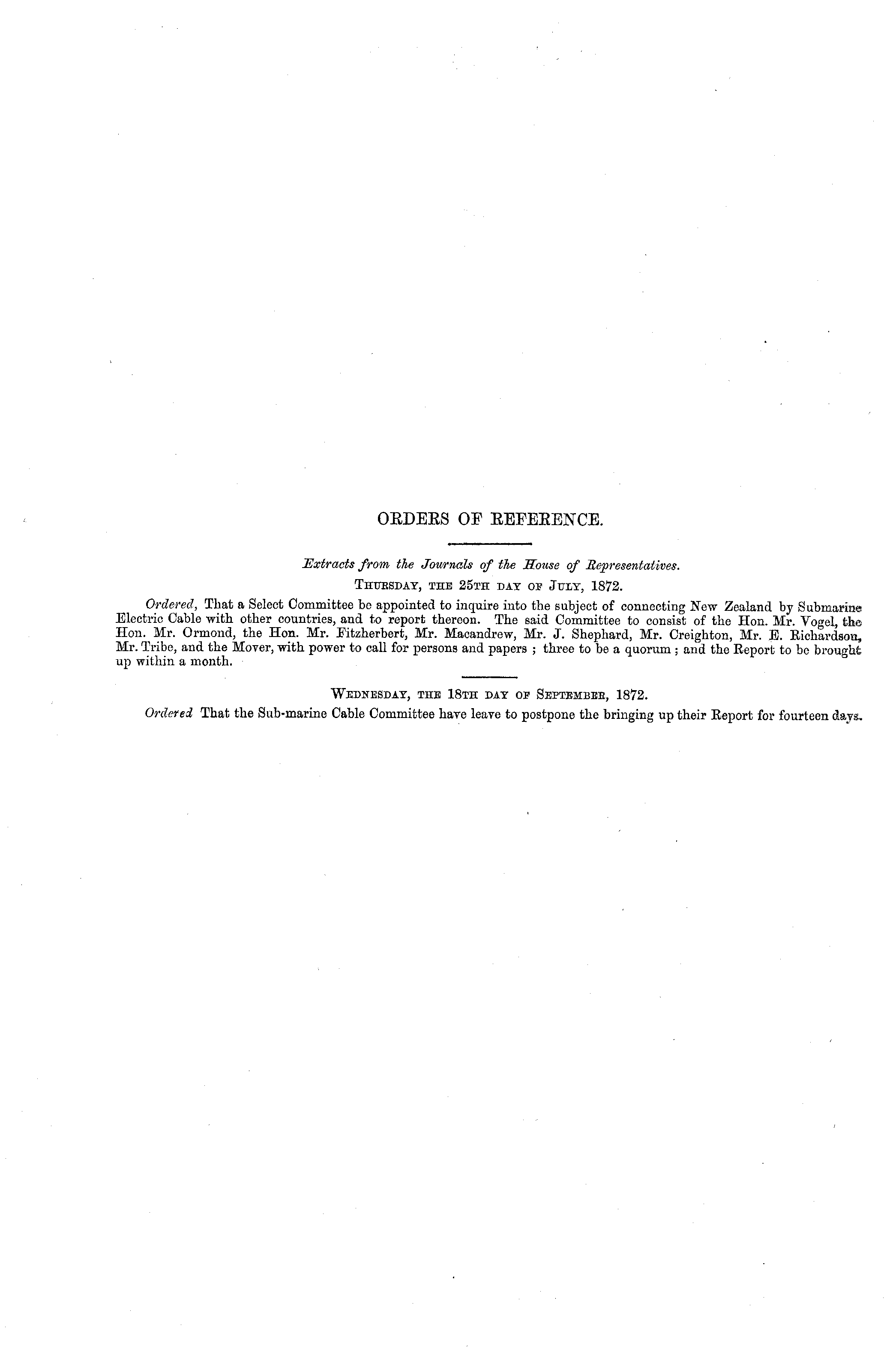 Extracts from the Journals of the Souse of Representatives. Thursday, the 25th day op July, 1872. Ordered, That a Select Committee be appointed to inquire into the subject of connecting New Zealand by Submarine Electric Cable with other countries, and to report thereon. The said Committee to consist of the Hon. Mr. Vogel, the, Hon. Mr. Ormond, the Hon. Mr. Fitzherbert, Mr. Maeandrew, Mr. J. Shephard, Mr. Creighton, Mr. E. RichardsonMr. Tribe, and the Mover, with power to call for persons and papers ; three to be a quorum ; and the Report to be brought up within a month.