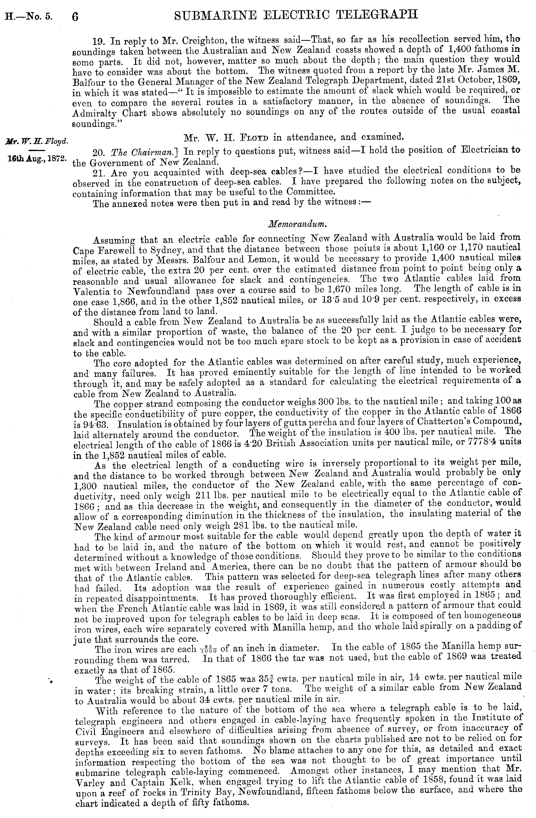 19. In reply to Mr. Creighton, the witness said —That, so far as his recollection served him, the soundings taken between the Australian and New Zealand coasts showed a depth of 1,400 fathoms in some parts. It did not, however, matter so much about the depth; the main question they would have to consider was about the bottom. The witness quoted from a report by the late Mr. James M. Balfour to the General Manager of the New Zealand Telegraph Department, dated 21st October, 1869, in which it was stated—" It is impossible to estimate the amount of slack which would be required, or even to compare the several routes in a satisfactory manner, in the absence of soundings. The Admiralty Chart shows absolutely no soundings on "any of the routes outside of the usual coastal soundings." Mr. W. H. Floyd in attendance, and examined. 20. The Chairman.] In reply to questions put, witness said —I hold the position of Electrician to the Government of New Zealand. 21. Are you acquainted with deep-sea cables? —I have studied the electrical conditions to be observed in the construction of deep-sea cables. I have prepared the following notes on the subject, containing information that may be useful to the Committee. The annexed notes were then put in and read by the witness: — Memorandum. Assuming that an electric cable for connecting New Zealand with Australia would be laid from Cape Farewell to Sydney, and that the distance between those poiuts is about 1,160 or 1,170 nautical miles, as stated by Messrs. Balfour and Lemon, it would bo necessary to provide 1,400 nautical miles of electric cable, the extra 20 per cent, over the estimated distance from point to point being only a reasonable and usual allowance for slack and contingencies. The two Atlantic cables laid from Valentia to Newfoundland pass over a course said to be 1,670 miles long. The length of cable is in one case 1,866, and in the other 1,852 nautical miles, or 135 and 109 per cent, respectively, in excess of the distance from land to land. .'•■.. Should a cable from New Zealand to Australia be as successfully laid as the Atlantic cables were, and with a similar proportion of waste, the balance of the 20 per cent. I judge to be necessary for slack and contingencies would not be too much spare stock to be kept as a provision in case of accident to the cable. - The core adopted for the Atlantic cables was determined on after careful study, much experience, and many failures. It has proved eminently suitable for the length of line intended to be worked through it, and may be safely adopted as a standard for calculating the electrical requirements of a cable from New Zealand to Australia. _ . The copper strand composing the conductor weighs 300 lbs. to the nautical mile ; and taking 100 as the specific conductibilitv of pure copper, the conductivity of the copper in the Atlantic cable of 1866 is 9463 Insulation is obtained by four layers of gutta percha and four layers of Chatterton's Compound, laid alternately around the conductor. The weight of the insulation is 400 lbs. per nautical mile. The electrical length of the cable of 1866 is 420 British Association units per nautical mile, or 77784 units in the 1,852 nautical miles of cable. . As the electrical length of a conducting wire is inversely proportional to its weight per mile, and the distance to be worked through between New Zealand and Australia would probably be only 1,300 nautical miles, the conductor of the New Zealand cable, with the same percentage of conductivity, need only weigh 211 lbs. per nautical mile to be electrically equal to the Atlantic cable of 1866 ; and as this decrease in the weight, and consequently in the diameter of the conductor, would allow of a corresponding diminution in the thickness of the insulation, the insulating material of the New Zealand cable need only weigh 281 lbs. to the nautical mile. The kind of armour most suitable for the cable would depend greatly upon the depth of water it had to be laid in, and the nature of the bottom on which it would rest, and cannot be positively determined without a knowledge of those conditions. Should they prove to be similar to the conditions met with between Ireland and America, there can be no doubt that the pattern of armour should be that of the Atlantic cables. This pattern was selected for deep-sea telegraph lines after many others had failed. Its adoption was the result of experience gained in numerous costly attempts and in repeated disappointments. It has proved thoroughly efficient. It was first employed in 1865 ; and when the French Atlantic cable was laid in 1869, it was still considered a pattern of armour that could not be improved upon for telegraph cables to bo laid in deep seas. It is composed of ten homogeneous iron wires, each wire separately covered with Manilla hemp, and tho whole laid spirally on a padding of jute that surrounds the core. The iron wires are each .Mo of an inch in diameter. In the cable of 1865 the Manilla hemp Burrounding them was tarred. In that of 1866 the tar was not used, but the cable of 18G9 was treated exactly as that of 1865. The weight of the cable of 1865 was 35f- cwts. per nautical mile in air, 14 cwts. per nautical mile in water; its" breaking strain, a little over 7 tons. The weight of a similar cable from New Zealand to Australia would be about 34 cwts. per nautical mile in air. -' With reference to the nature of the bottom of the sea where a telegraph cable is to be laid, telegraph engineers and others engaged in cable-laying have frequently spoken in the Institute of Civil Engineers and elsewhere of difficulties arising from absence of survey, or from inaccuracy of surveys. It has been said that soundings shown on the charts published are not to be relied on for depths exceeding six to seven fathoms. No blame attaches to any one for this, as detailed and exact information respecting the bottom of the sea was not thought to be of great importance until