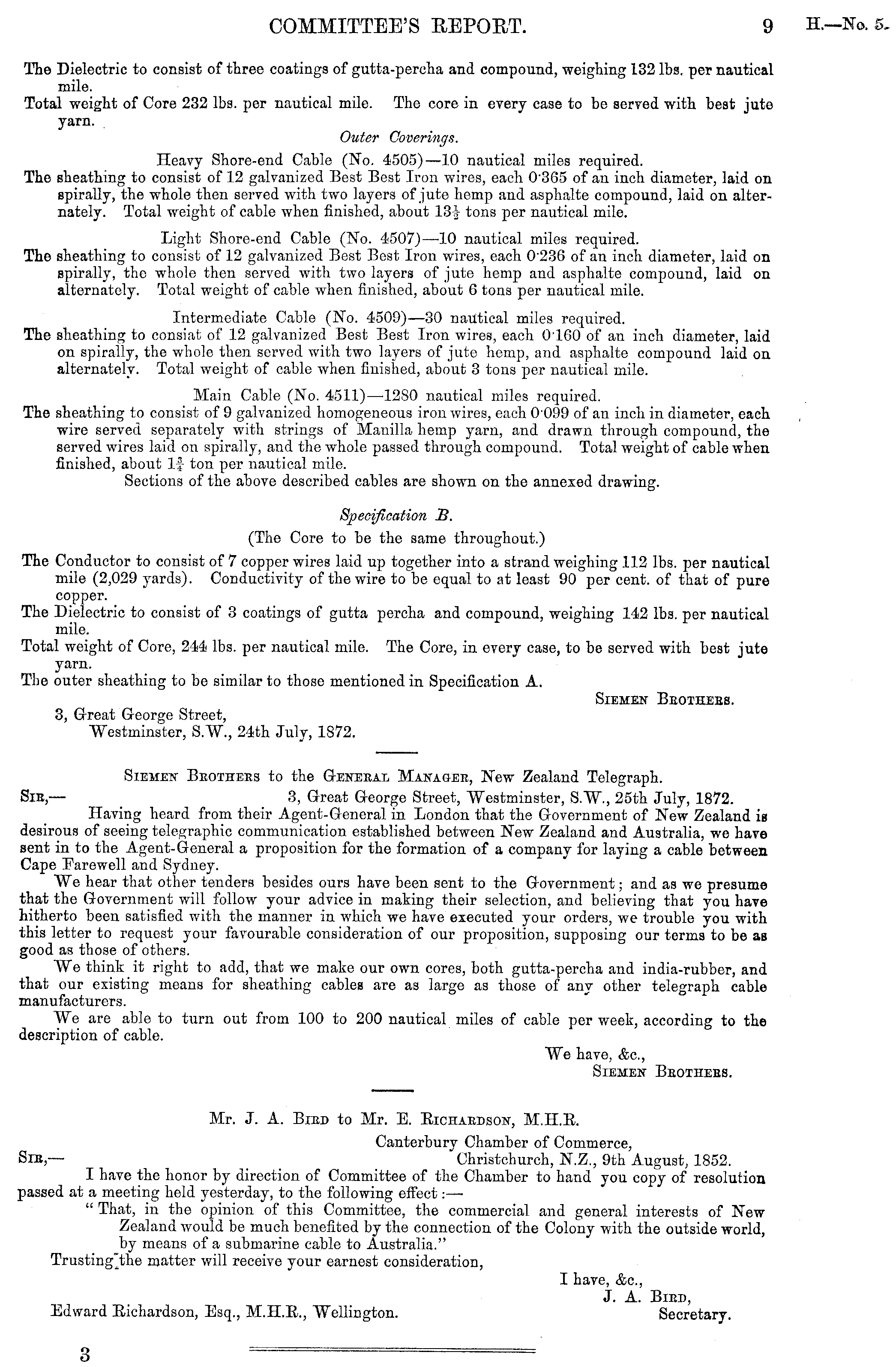 Siemen Beothees to the Geneeal Managee, New Zealand Telegraph. Sib,— 3, Great George Street, Westminster, S.W., 25th July, 1872. Having heard from their Agent-General in London that the Government of New Zealand ia desirous of seeing telegraphic communication established between New Zealand and Australia, we have sent in to the Agent-General a proposition for the formation of a company for laying a cable between Cape Farewell and Sydney. We hear that other tenders besides ours have been sent to the Government; and as we presume that the Government will follow your advice in making their selection, and believing that you have hitherto been satisfied with the manner in which we have executed your orders, we trouble you with this letter to request your favourable consideration of our proposition, supposing our terms to be as good as those of others. We think it right to add, that we make our own cores, both gutta-percha and india-rubber, and that our existing means for sheathing cables are as large as those of any other telegraph cable manufacturers. We are able to turn out from 100 to 200 nautical miles of cable per week, according to the description of cable. We have, &c, Siemen Beothees.