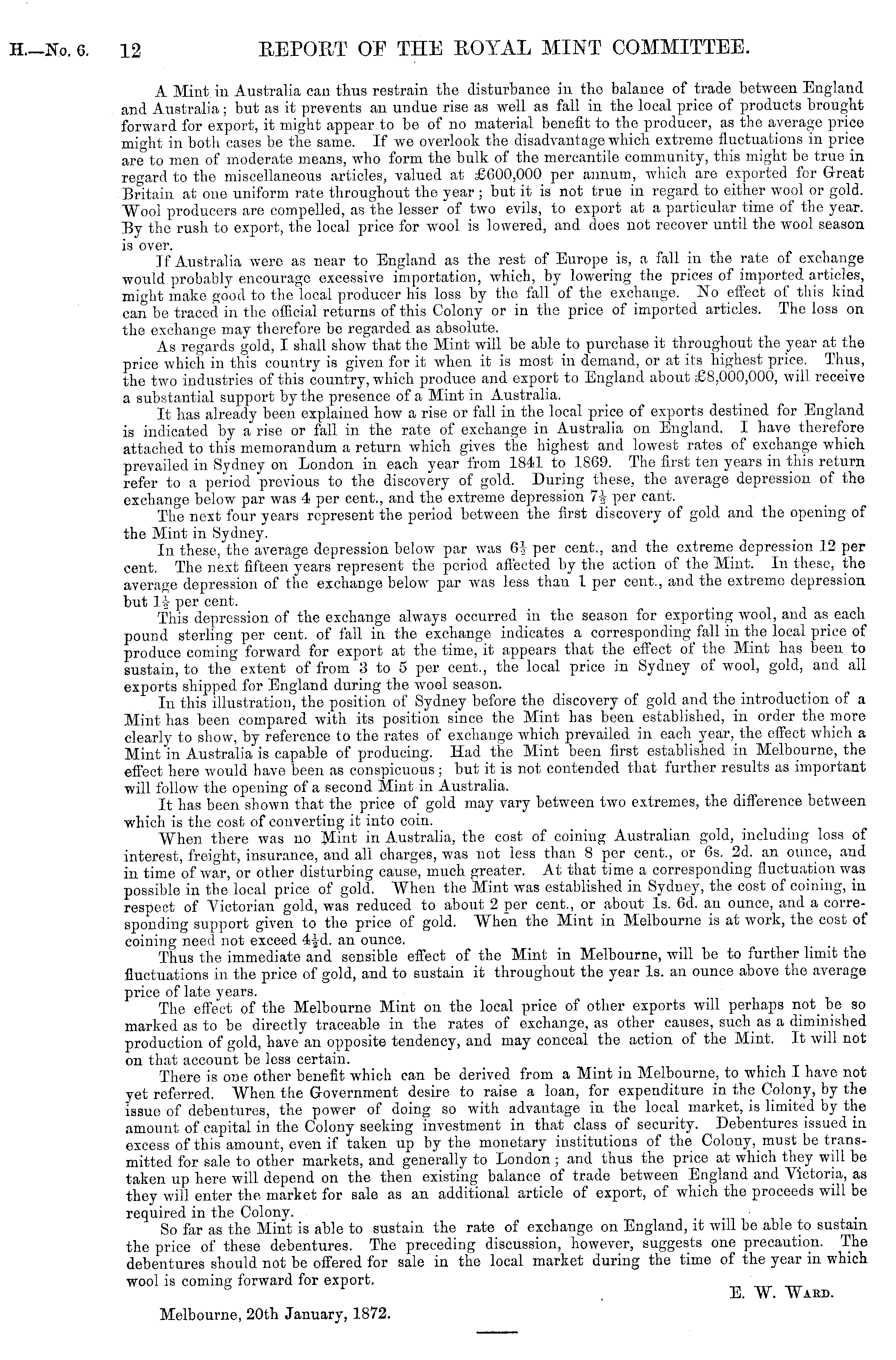A Mint, in Australia can thus restrain the disturbance in the balance of trade between England and Australia; but as it prevents an undue rise as well as fall in the local price of products brought forward for export, it might appear to be of no material benefit to the producer, as the average price might in both cases be the same. If we overlook the disadvantage which extreme fluctuations in price are to men of moderate means, who form the bulk of the mercantile community, this might be true in regard to the miscellaneous articles, valued at £600,000 per annum, which are exported for Groat Britain at one uniform rate throughout the year ; but it is not true in regard to either wool or gold. Wool producers are compelled, as the lesser of two evils, to export at a particular time of the year. By the rush to export, the local price for wool is lowered, and does not recover until the wool season is over. If Australia were as near to England as the rest of Europe is, a fall in the rate of exchange would probably encourage excessive importation, which, by lowering the prices of imported articles, might make good to the local producer his loss by the fall of the exchange. No effect of this kind can be traced in the official returns of this Colony or in the price of imported articles. The loss on the exchange may therefore be regarded as absolute. As regards gold, I shall show that the Mint will be able to purchase it throughout the year at the price which in this country is given for it when it is most in demand, or at its highest price. Thus, the two industries of this country, which produce and export to England about £8,000,000, will receive a substantial support by the presence of a Mint in Australia. It has already been explained how a rise or fall in the local price of exports destined for England is indicated by a rise or fall in the rate of exchange in Australia on England. I have therefore attached to this memorandum a return which gives the highest and lowest rates of exchange which prevailed in Sydney on London in each year from 1841 to 1869. The first ten years in this return refer to a period previous to the discovery of gold. During these, the average depression of the exchange below par was 4 per cent., and the extreme depression 7$ per cant. The next four years represent the period between the first discovery of gold and the opening of the Mint in Sydney. In these, the average depression below par was 6| per cent., and the extreme depression 12 per cent. The next fifteen years represent the period affected by the action of the Mint. In these, the average depression of the exchange below par was less than 1 per cent., and the extreme depression but 1-2- per cent. This depression of the exchange always occurred in the season for exporting wool, and as each pound sterling per cent, of fall in the exchange indicates a corresponding fall in the local price of produce coming forward for export at the time, it appears that the effect of the Mint has been to sustain, to the extent of from 3 to 5 per cent., the local price in Sydney of wool, gold, and all exports shipped for England during the wool season. In this illustration, the position of Sydney before the discovery of gold and the introduction of a Mint has been compared with its position since the Mint has been established, in order the more clearly to show, by reference to the rates of exchange which prevailed in each year, the effect which a Mint in Australia is capable of producing. Had the Mint been first established in Melbourne, the effect here would have been as conspicuous; but it is not contended that further results as important will follow the opening of a second Mint in Australia. It has been shown that the price of gold may vary between two extremes, the difference between which is the cost of converting it into coin. When there was no Mint in Australia, the cost of coining Australian gold, including loss of interest, freight, insurance, and all charges, was not less than 8 per cent., or 6s. 2d. an ounce, and in time of war, or other disturbing cause, much greater. At that time a corresponding fluctuation was possible in the local price of gold. When the Mint was established in Sydney, the cost of coining, in respect of Victorian gold, was reduced to about 2 per cent., or about Is. 6d. an ounce, and a corresponding support given to the price of gold. When the Mint in Melbourne is at work, the cost of coining need not exceed 4|d. an ounce. Thus the immediate and sensible effect of the Mint in Melbourne, will be to further limit the fluctuations in the price of gold, and to sustain it throughout the year Is. an ounce above the average price of late years. The effect of the Melbourne Mint on the local price of other exports will perhaps not^ be so marked as to be directly traceable in the rates of exchange, as other causes, such as a diminished production of gold, have an opposite tendency, and may conceal the action of the Mint. It will not on that account be less certain. There is one other benefit which can be derived from a Mint in Melbourne, to which I have not yet referred. When the Government desire to raise a loan, for expenditure in the Colony, by the issue of debentures, the power of doing so with advantage in the local market, is limited by the amount of capital in the Colony seeking investment in that class of security. Debentures issued in excess of this amount, even if taken up by the monetary institutions of the Colony, must be transmitted for sale to other markets, and generally to London; and thus the price at which they will be taken up here will depend on the then existing balance of trade between England and Victoria, as they will enter the market for sale as an additional article of export, of which the proceeds will be required in the Colony. So far as the Mint is able to sustain the rate of exchange on England, it will be able to sustain the price of these debentures. The preceding discussion, h