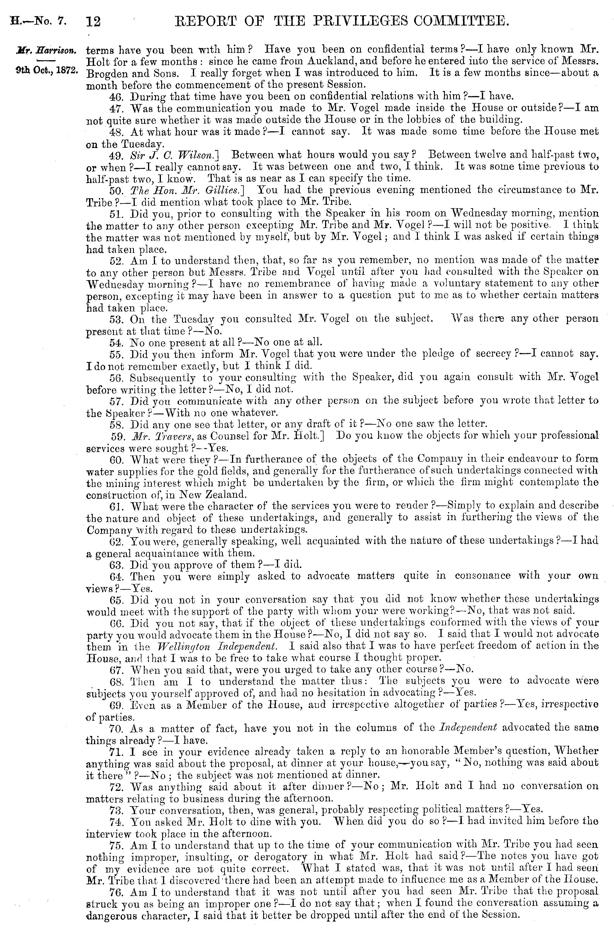 terms have you been with him ? Have you been on confidential terms ?—I have only known Mr. Holt for a few months : since he came from Auckland, and before he entered into the service of Messrs. Brogden and Sons. I really forget when I was introduced to him. It is a few months since—about a month before the commencement of the present Session. 46. During that time have you been on confidential relations with him?—l have. 47. Was the communication you made to Mr. Vogel made inside the House or outside? —I am not quite sure whether it was made outside the House or in the lobbies of the building. 48. At what hour was it made ?—I cannot say. It was made some time before the House met on the Tuesday. 49. Sir J. C. Wilson?^ Between what hours would you say ? Between twelve and half-past two, or when ?—I really cannot say. It was between one and two, I think. It was some time previous to half-past two, I know. That is as near as I can specify the time. 50. The Hon. Mr. allies.] You had the previous evening mentioned the circumstance to Mr. Tribe ? —I did mention what took place to Mr. Tribe. 51. Did you, prior to consulting with the Speaker in his room on Wednesday morning, mention the matter to any other person excepting Mr. Tribe and Mr. Vogel ? —I will not be positive. I think the matter was not mentioned by myself, but by Mr. Vogel; and I think I was asked if certain things had taken place. 52. Am I to understand then, that, so far as you remember, no mention was made of the matter to any other person but Messrs. Tribe and Vogel until after you had consulted with the Speaker on Wednesday morning ? —I have no remembrance of having made a voluntary statement to any other person, excepting it may have been in answer to a question put to me as to whether certain matters had taken place. 53. On the Tuesday you consulted Mr. Vogel on the subject. Was there any other person present at that time ?—No. 54. No one present at all ? —No one at all. 55. Did you then inform Mr. Vogel that you were under the pledge of secrecy ? —I cannot say. I do not remember exactly, but I think I did. 56. Subsequently to your consulting with the Speaker, did you again consult with Mr. Vogel before writing the letter ? —No, I did not. 57. Did you communicate with any other person on the subject before you wrote that letter to the Speaker? —With no one whatever. 58. Did any one see that letter, or any draft of it ? —No one saw the letter. 59. Mr. Travers, as Counsel for Mr. Holt.] Do you know the objects for which your professional services were sought ? —Yes. GO. What were they ? —ln furtherance of the objects of the Company in their endeavour to form water supplies for the gold fields, and generally for the furtherance of such undertakings connected with the mining interest which might be undertaken by the firm, or which the firm might contemplate the construction of, in New Zealand. Gl. What were the character of the services you were to render ?—Simply to explain and describe the nature and object of these undertakings, and generally to assist in furthering the views of the Company with regard to these undertakings. 62. You were, generally speaking, well acquainted with the nature of these undertakings? —Iliad a general acquaintance with them. 63. Did you approve of them ? —I did. 64. Then you "were simply asked to advocate matters quite in consonance with your own views ? —Yes. 65. Did you not in your conversation say that you did not know whether these undertakings would meet with the support of the party with whom your were working?—No, that was not said. 66. Did you not say, that if the object of these undertakings conformed with the views of your party you would advocate them in the House ?—No, I did not say so. I said that I would not advocate them in the Wellington Independent. I said also that I was to have perfect freedom of action in the House, and that I was to be free to take what course I thought proper. 67. When you said that, were you urged to take any other course?— No. 68. Then am I to understand the matter thus: The subjects you were to advocate were subjects you yourself approved of, and had no hesitation in advocating ?—Yes. 69. Even as a Member of the House, and irrespective altogether of parties ?—Yes, irrespective of parties. 70. As a matter of fact, have you not in the columns of the Independent advocated the same things already ? —I have. 71. I see in your evidence already taken a reply to an honorable Member's question, Whether anything was said about the proposal, at dinner at your house,—you say, " No, nothing was said about it there " ? —No ; the subject was not mentioned at dinner. 72. Was anything said about it after dinner ? —No ; Mr. Holt and I had no conversation on matters relating to business during the afternoon. 73. Your conversation, then, was general, probably respecting political matters? —Yes. 74. You asked Mr. Holt to dine with you. When did you do so ?—I. had invited him before the interview took place in the afternoon. 75. Am I to understand that up to the time of your communication with Mr. Tribe you had seen nothing improper, insulting, or derogatory in what Mr. Holt had said?— The notes you have got of my evidence are not quite correct. What I stated was, that it was not until after I had seen Mr. Tribe that 1 discovered there had been an attempt made to influence me as a Member of the House. 76. Am I to understand that it was not until after you had seen Mr. Tribe that the proposal struck you as being an improper one ?— I do not say that; when I found the conversation assuming a dangerous character, I said that it better be dropped until after the end of the Session.