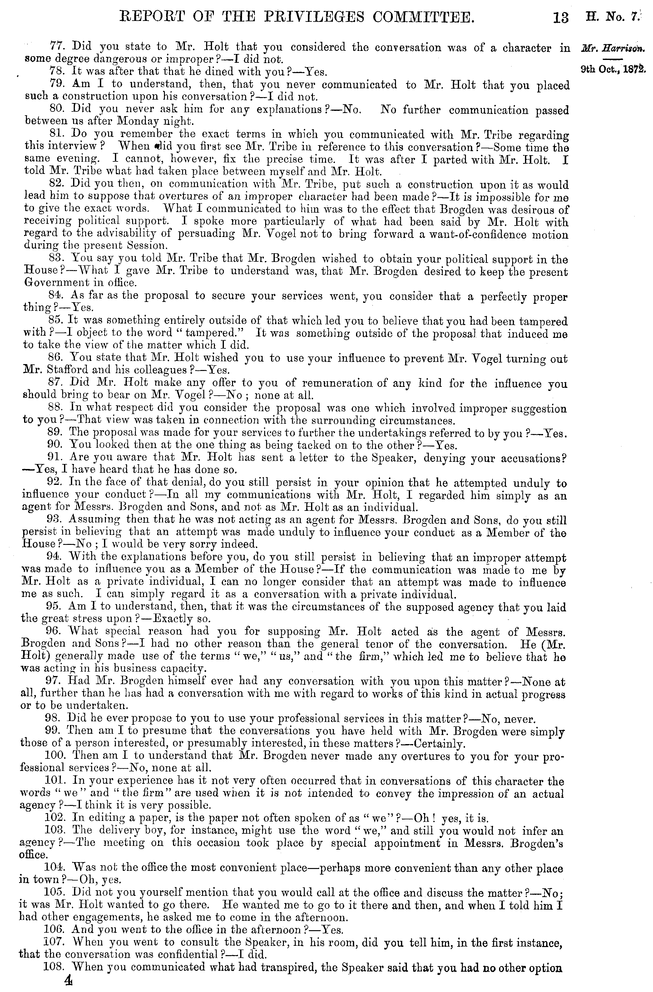 77. Did you state to Mr. Holt that you considered the conversation was of a character in some degree dangerous or improper ?—I did not. 78. It was after that that he dined with you?— Yes. 79. Am I to understand, then, that you never communicated to Mr. Holt that you placed such a construction upon his conversation ? —I did not. 80. Did you never ask him for any explanations ? —No. No further communication passed between us after Monday night. 81. Do you remember the exact terms in which you communicated with Mr. Tribe regarding this interview ? Wheu *lid you first see Mr. Tribe in reference to this conversation ?—Some time the same evening. I cannot, however, fix the precise time. It was after I parted with Mr. Holt. I told Mr. Tribe what had taken place between myself and Mr. Holt. 82. Did you then, on communication with Mr. Tribe, put such a construction upon it as would lead him to suppose that overtures of an improper character had been made?—lt is impossible for me to give the exact words. What I communicated to him was to the effect that Brogden was desirous of receiving political support. I spoke more particularly of what had been said by Mr. Holt with regard to the advisability of persuading Mr. Vogel not to bring forward a want-of-confidence motion during the present Session. 83. You say you told Mr. Tribe that Mr. Brogden wished to obtain your political support in the House? —What I gave Mr. Tribe to understand was, that Mr. Brogden desired to keep the present Government in office. 84. As far as the proposal to secure your services went, you consider that a perfectly proper thing? —Yes. 85. It was something entirely outside of that which led you to believe that you had been tampered with ? —I object to the word " tampered." It was something outside of the proposal that induced me to take the view of the matter which I did. 86. You state that Mr. Holt wished you to use your influence to prevent Mr. Vogel turning out Mr. Stafford and his colleagues ?—Yes. 87. Did Mi-. Holt make any offer to you of remuneration of any kind for the influence you should bring to bear on Mr. Vogel ? —No ; none at all. 88. In what respect did you consider the proposal was one which involved improper suggestion to you ? —That view was taken in connection with the surrounding circumstances. 89. The proposal was made for your services to further the undertakings referred to by you ?—Yes. 90. You looked then at the one thing as being tacked on to the other ?—Yes. 91. Are you aware that Mr. Holt has sent a letter to the Speaker, denying your accusations? —Yes, I have heard that he has done so. 92. In the face of that denial, do you still persist in your opinion that he attempted unduly to influence your conduct ?—ln all my communications with Mr. Holt, I regarded him simply as an agent for Messrs. Brogden and Sons, and not as Mr. Holt as an individual. 93. Assuming then that he was not acting as an agent for Messrs. Brogden and Sons, do you still persist in believing that an attempt was made unduly to influence your conduct as a Member of the House ?—No ; I would be very sorry indeed. 94. With the explanations before you, do you still persist in believing that an improper attempt was made to influence you as a Member of the House ? —lf the communication was made to me by Mr. Holt as a private individual, I can no longer consider that an attempt was made to influence me as such. I can simply regard it as a conversation with a private individual. 95. Am I to understand, then, that it was the circumstances of the supposed agency that you laid the great stress upon ?—Exactly so. 96. What special reason had you for supposing Mr. Holt acted as the agent of Messrs. Brogden and Sons ? —I had no other reason than the general tenor of the conversation. He (Mr. Holt) generally made use of the terms " we," " us," and " the firm," which led me to believe that he was acting in his business capacity. 97. Had Mr. Brogden himself ever had any conversation with you upon this matter ? —None at all, further than he has had a conversation with me with regard to works of this kind in actual progress or to be undertaken. 98. Did he ever propose to you to use your professional services in this matter?—No, never. 99. Then am I to presume that the conversations you have held with Mr. Brogden were simply those of a person interested, or presumably interested, in these matters ?—Certainly. 100. Then am I to understand that Mr. Brogden never made any overtures to you for your professional services?—No, none at all. 101. In your experience has it not very often occurred that in conversations of this character the words " we " and " the firm" are used when it is not intended to convey the impression of an actual agency ? —I think it is very possible. 102. In editing a paper, is the paper not often spoken of as " we" ? —Oh ! yes, it is. 103. The delivery boy, for instance, might use the word " we," and still you would not infer an agency? —The meeting on this occasion took place by special appointment in Messrs. Brogden's office. 104. Was not the office the most convenient place—perhaps more convenient than any other place in town ? —Oh, yes. 105. Did not you yourself mention that you would call at the office and discuss the matter?—No; it was Mr. Holt wanted to go there. He wanted me to go to it there and then, and when I told him I had other engagements, he asked me to come in the afternoon. 106. And you went to the office in the afternoon? —Yes. 107. When you went to consult the Speaker, in his room, did you tell him, in the first instance, that the conversation was confidential?—l did. 108. When you communicated what had transpired, the Speaker said that you had no other option 4