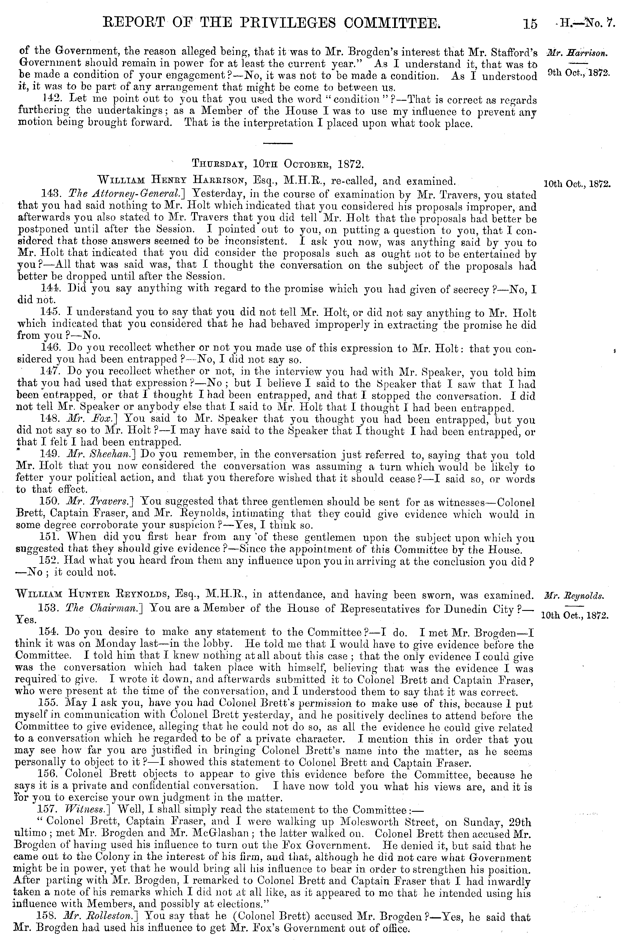 Thursday, lOtii October, 1872. William Henry Harrison, Esq., M.H.E., re-called, and examined. 143. The Attorney-General.] Yesterday, in the course of examination by Mr. Travers, you stated that you had said nothing to Mr. Holt which indicated that you considered his proposals improper, and afterwards you also stated to Mr. Travers that you did tell Mr. Holt that the proposals had better be postponed until after the Session. I pointed out to you, on putting a question to you, that I considered that those answers seemed to be inconsistent. I ask you now, was anything said by you to Mr. Holt that indicated that you did consider the proposals such as ought not to be entertained by you?— All that was said was, that I thought the conversation on the subject of the proposals had better be dropped until after the Session. 144. Did you say anything with regard to tho promise which you had given of secrecy ? —No, I did not. 145. I understand you to say that you did not tell Mr. Holt, or did not say anything to Mr. Holt which indicated that you considered that he had behaved improperly in extracting the promise he did from you ? —No. 146. Do you recollect whether or not you made use of this expression to Mr. Holt: that you considered you had been entrapped ?—No, I did not say so. 147. Do you recollect whether or not, in the interview you had with Mr. Speaker, you told him that you had used that expression? —No ; but I believe I said to the Speaker that I saw that I had been entrapped, or that I thought I had been entrapped, and that I stopped the conversation. I did not tell Mr. Speaker or anybody else that I said to Mr. Holt that I thought I had been entrapped. 148. Mr. Fox.] You said to Mr. Speaker that you thought you had been entrapped, but you did not say so to Mr. Holt ? —I may have said to the Speaker that I thought I had been entrapped, or that I felt I had been entrapped. 149. Mr. Sheehan.] Do you remember, in the conversation just referred to, saying that you told Mr. Holt that you now considered the conversation, was assuming a turn which would be likely to fetter your political action, and that you therefore wished that it should cease?—l said so, or words to that effect. 150. Mr. Travers.] You suggested that three gentlemen should be sent for as witnesses—Colonel Brett, Captain Eraser, and Mr. Eeynolds, intimating that they could give evidence which would in some degree corroborate your suspicion ? —Yes, I think so. 151. When did you first hear from any 'of these gentlemen upon the subject upon which you suggested that they should give evidence ?—Since the appointment of this Committee by the House. 152. Had what you heard from them any influence upon you in arriving at the conclusion you did ? —No ;it could not. William Hunter Eeynolds, Esq., M.H.E., in attendance, and having been sworn, was examined. 153. The Chairman.] You are a Member of the House of Eepresentatives for Dunedin City P— Yes. 154. Do you desire to make any statement to the Committee ?—I do. I met Mr. Brogden—l think it was on Monday last —in the lobby. He told me that I would have to give evidence before the Committee. I told him that I knew nothing at all about this case ; that the only evidence I could give was the conversation which had taken place with himself, believing that was the evidence I was required to give. I wrote it down, and afterwards submitted it to Colonel Brett and Captain Eraser, who were present at the time of the conversation, and I understood them to say that it was correct. 155. May I ask you, have you had Colonel Brett's permission to make use of this, because I put myself in communication with Colonel Brett yesterday, and he positively declines to attend before the Committee to give evidence, alleging that he could not do so, as all the evidence he could give related to a conversation which he regarded to be of a private character. I mention this in order that you may see how far you are justified in bringing Colonel Brett's name into the matter, as he seems personally to object to it ? —I showed this statement to Colonel Brett and Captain Fraser. 156. Colonel Brett objects to appear to give this evidence before the Committee, because he says it is a private and confidential conversation. I have now told you what his views are, and it is 'for you to exercise your own judgment in the matter. 157. Witness.] Well, I shall simply read the statement to the Committee:— " Colonel Brett, Captain Fraser, and I were walking up Molesworth Street, on Sunday, 29th ultimo ; met Mr. Brogden and Mr. McGlashan ; the latter walked on. Colonel Brett then accused Mr. Brogden of having used his influence to turn out the Fox Government. He denied it, but said that he came out to the Colony in the interest of his firm, and that, although he did not care what Government might be in power, yet that he would bring all his influence to bear in order to strengthen his position. After parting with Mr. Brogden, I remarked to Colonel Brett and Captain Fraser that I had inwardly taken a note of his remarks which I did not at all like, as it appeared to me that he intended using his influence with Members, and possibly at elections." 158. Mr. Rolleston.] You say that he (Colonel Brett) accused Mr. Brogden ?—Yes, he said that Mr. Brogden had used his influence to get Mr. Pox's Government out of office.