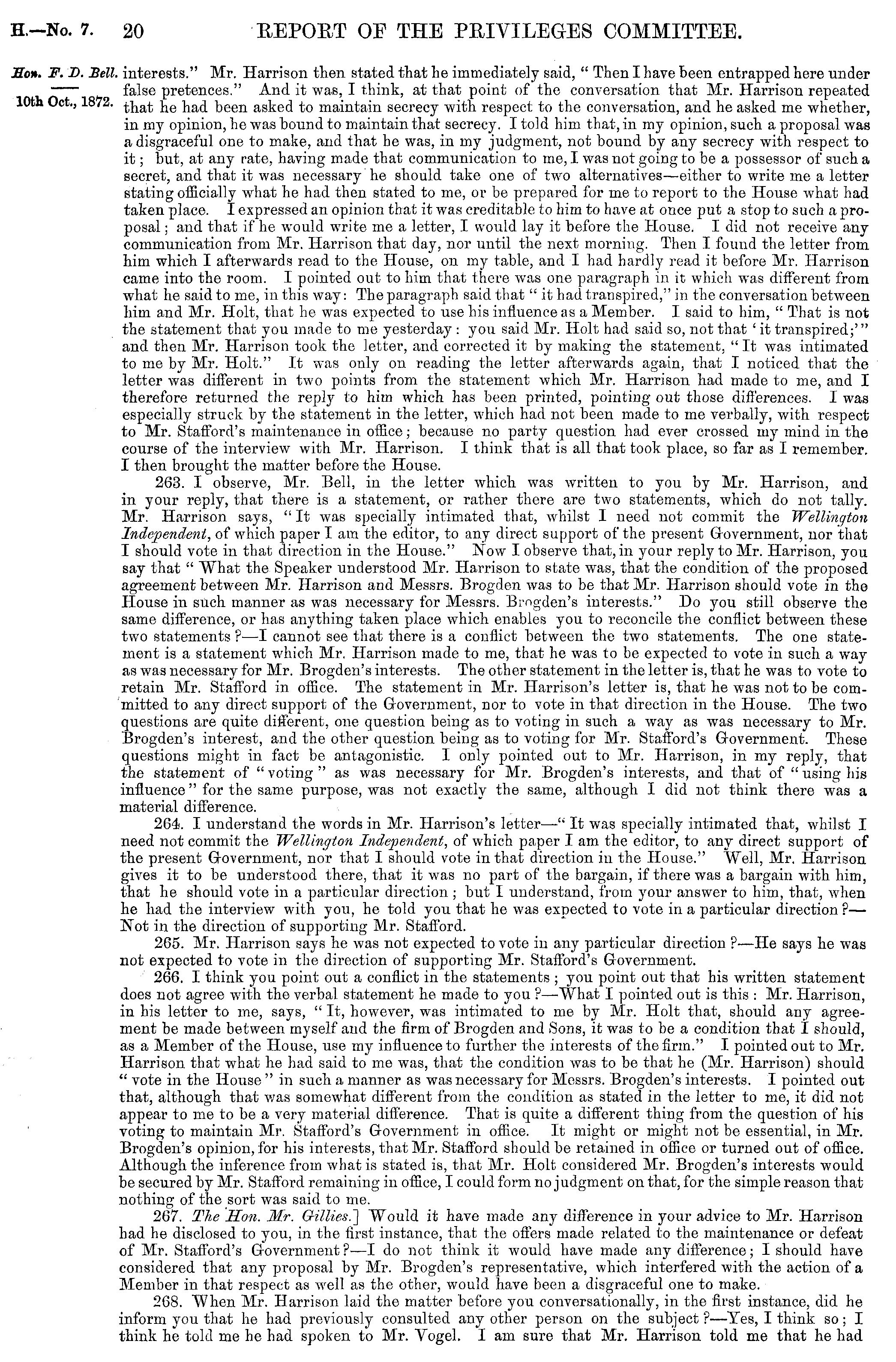 . interests." Mr. Harrison then stated that he immediately said, " Then I have been entrapped here under false pretences." And it was, I think, at that point of the conversation that Mr. Harrison repeated that ho had been asked to maintain secrecy with respect to the conversation, and he asked me whether, in my opinion, he was bound to maintain that secrecy. I told him that, in my opinion, such a proposal was a disgraceful one to make, and that he was, in my judgment, not bound by any secrecy with respect to it; but, at any rate, having made that communication to me, I was not going to be a possessor of such a secret, and that it was necessary he should take one of two alternatives —either to write me a letter stating officially what he had then stated to me, or be prepared for me to report to the House what had taken place. I expressed an opinion that it was creditable to him to have at once put a stop to such a proposal ; and that if ho would write me a letter, I would lay it before the House, I did not receive any communication from Mr. Harrison that day, nor until the next morning. Then I found the letter from him which I afterwards read to the House, on my table, and I had hardly read it before Mr. Harrison came into the room. I pointed out to him that there was one paragraph in it which was different from what he said to me, in this way: The paragraph said that "it had transpired," in the conversation between him and Mr. Holt, that ho was expected to use his influence as a Member. I said to him, " That is not the statement that you made to me yesterday : you said Mr. Holt had said so, not that ' it transpired;'" and then Mr. Harrison took the letter, and corrected it by making the statement, " It was intimated to me by Mr. Holt." It was only on reading the letter afterwards again, that I noticed that the letter was different in two points from the statement which Mr. Harrison had made to me, and I therefore returned the reply to him which has been printed, pointing out those differences. I was especially struck by the statement in the letter, which had not been made to me verbally, with respect to Mr. Stafford's maintenance in office; because no party question had ever crossed my mind in the course of the interview with Mr. Harrison. I think that is all that took place, so far as I remember. I then brought the matter before the House. 263. I observe, Mr. Bell, in the letter which was written to you by Mr. Harrison, and in your reply, that there is a statement, or rather there are two statements, which do not tally. Mr. Harrison says, "It was specially intimated that, whilst I need not commit the Wellington Independent, of which paper I am the editor, to any direct support of the present Government, nor that I should vote in that direction in the House." Now I observe that, in your reply to Mr. Harrison, you say that " What the Speaker understood Mr. Harrison to state was, that the condition of the proposed agreement between Mr. Harrison and Messrs. Brogden was to be that Mr. Harrison should vote in the House in such manner as was necessary for Messrs. Brogden's interests." Do you still observe the same difference, or has anything taken place which enables you to reconcile the conflict between these two statements ? —I cannot see that there is a conflict between the two statements. The one statement is a statement which Mr. Harrison made to me, that he was to be expected to vote in such a way as was necessary for Mr. Brogden's interests. The other statement in the letter is, that he was to vote to retain Mr. Stafford in office. The statement in Mr. Harrison's letter is, that he was not to be committed to any direct support of the Government, nor to vote in that direction in the House. The two questions are quite different, one question being as to voting in such a way as was necessary to Mr. Brogden's interest, and the other question being as to voting for Mr. Stafford's Government. These questions might in fact be antagonistic. I only pointed out to Mr. Harrison, in my reply, that the statement of " voting " as was necessary for Mr. Brogden's interests, and that of " using his influence" for the same purpose, was not exactly the same, although I did not think there was a material difference. 264. I understand the words in Mr. Harrison's letter —" It was specially intimated that, whilst I need not commit the Wellington Independent, of which paper I am the editor, to any direct support of the present Government, nor that I should vote in that direction in the House." Well, Mr. Harrison gives it to be understood there, that it was no part of the bargain, if there was a bargain with him, that he should vote in a particular direction; but I understand, from your answer to him, that, when he had the interview with you, he told you that he was expected to vote in a particular direction ?— Not in the direction of supporting Mr. Stafford. 265. Mr. Harrison says he was not expected to vote in any particular direction ?—He says he was not expected to vote in the direction of supporting Mr. Stafford's Government. 266. I think you point out a conflict in the statements ; you point out that his written statement does not agree with tho verbal statement he made to you ? —What I pointed out is this : Mr. Harrison, in his letter to me, says, " It, however, was intimated to me by Mr. Holt that, should any agreement be made between myself and the firm of Brogden and Sons, it was to be a condition that I should, as a Member of the House, use my influence to further the interests of the firm." I pointed out to Mr. Harrison that what he had said to me was, that the condition was to be that he (Mr. Harrison) should " vote in the House "in such a manner as was necessary for Messrs. Brogden's interests. I pointed out that, although that was somewhat different from the condition as stated in the letter to me, it did not appear to me to be a very material difference. That is quite a different thi