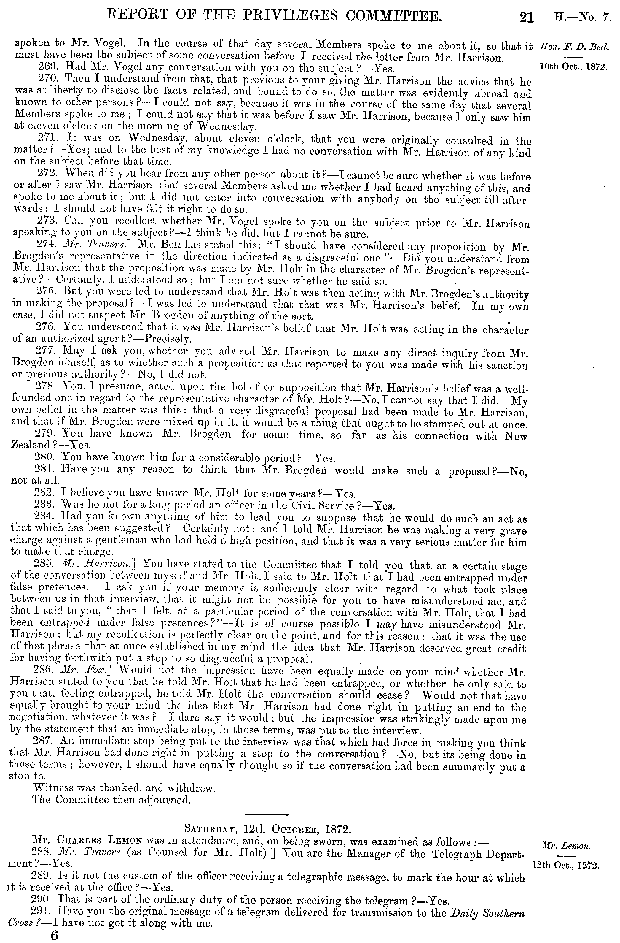 spoken to Mr. Vogel. In the course of that day several Members spoke to me about it, so that it must have been the subject of some conversation before I received the letter from Mr. Harrison. 269. Had Mr. Vogel any conversation with you on the subject ?—Yes. 270. Then I understand from that, that previous to your giving Mr. Harrison the advice that he was at liberty to disclose the facts related, and bound to'do so, the matter was evidently abroad and known to other persons ?—I could not say, because it was in the course of the same day that several Members spoke to me ; I could not say that it was before I saw Mr. Harrison, because I only saw him at eleven o'clock on the morning of Wednesday. 271. It was on Wednesday, about eleven o'clock, that you were originally consulted in the matter ?—Yes; and to the best of my knowledge I had no conversation with Mr. Harrison of any kind on the subject before that time. 272. When did you hear from any other person about it ?—I cannot be sure whether it was before or after I saw Mr. Harrison, that several Members asked me whether I had heard anything of this, and spoke to mo about it; but I did not enter into conversation with anybody on the subject till afterwards : I should not have felt it right to do so. 273. Can you recollect whether Mr. Vogel spoke to you on the subject prior to Mr. Harrison speaking to you on the subject ? —I think he did, but I cannot be sure. 274. Mr. Travers.] Mr. Bell has stated this: " I should have considered any proposition by Mr. Brogden's representative in the direction indicated as a disgraceful one." Did you understand from Mr. Harrison that the proposition was made by Mr. Holt in the character of Mr. Brogden's representative?— Certainly, I understood so ; but I am not sure whether he said so. 275. But you were led to understand that Mr. Holt was then acting with Mr. Brogden's authority in making the proposal ?—I was led to understand that that was Mr. Harrison's belief. In my own case, I did not suspect Mr. Brogden of anything of the sort. 276. You understood that it was Mr. Harrison's belief that Mr. Holt was acting in the character of an authorized agent?— Precisely. 277. May I ask you, whether you advised Mr. Harrison to make any direct inquiry from Mr. Brogden himself, as to whether such a proposition as that reported to you was made with his sanction or previous authority?—No, I did not. 278. You, I presume, acted upon the belief or supposition that Mr. Harrison's belief was a wellfounded one in regard to the representative character of Mr. Holt ?—No, I cannot say that I did. My own belief in the matter was this : that a very disgraceful proposal had been made to Mr. Harrison, and that if Mr. Brogden were mixed up in it, it would be a thing that ought to be stamped out at once. 279. You have known Mr. Brogden for some time, so far as his connection with New Zealand ? —Yes. 280. You have known him for a considerable period ?—Yes. 281. Have you any reason to think that Mr. Brogden would make such a proposal ?—No, not at all. 282. I believe you have known Mr. Holt for some years ?—Yes. 283. Was he not for a long period an officer in the Civil Service ?—Yes. 284. Had you known anything of him to lead you to suppose that he would do such an act as that which has been suggested ?—Certainly not; and I told Mr. Harrison he was making a very grave charge against a gentleman who had held a high position, and that it was a very serious matter for him to make that charge. 285. Mr. Harrison.] You have stated to the Committee that I told you that, at a certain stage of the conversation between myself and Mr. Holt, I said to Mr. Holt that I had been entrapped under false pretences. I ask you if your memory is sufficiently clear with regard to what took place between us in that interview, that it might not bo possible for you to have misunderstood me, and that I said to you, " that I felt, at a particular period of the conversation with Mr. Holt, that I had been entrapped under false pretences ?"—lt is of course possible I may have misunderstood Mr. Harrison ; but my recollection is perfectly clear on the point, and for this reason : that it was the use of that phrase that at once established in my mind tho idea that Mr. Harrison deserved great credit for having forthwith put a stop to so disgraceful a proposal. 286. Mr. Fox.] Would not the impression have been equally made on your mind whether Mr. Harrison stated to you that he told Mr. Holt that he had been entrapped, or whether he only said to you that, feeling entrapped, he told Mr. Holt the conversation should cease ? Would not that have equally brought to your mind the idea that Mr. Harrison had done right in putting an end to the negotiation, whatever it was ?—I dare say it would ; but the impression was strikingly made upon me by the statement that an immediate stop, in those terms, was put to the interview. 287. An immediate stop being put to the interview was that which had force in making you think that Mr. Harrison had done right in putting a stop to the conversation ? —No, but its being done in those terms ; however, I should have equally thought so if the conversation had been summarily put a stop to. Witness was thanked, and withdrew. The Committee then adjourned.