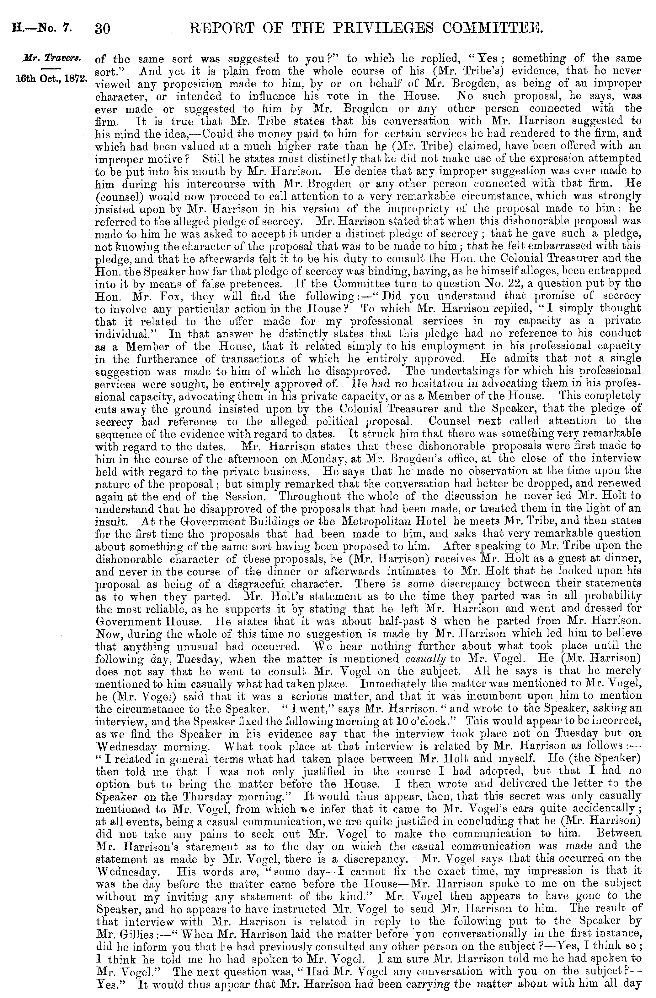 of the same sort was suggested to you?" to which he replied, "Yes ; something of the same sort." And yet it is plain from the whole course of his (Mr. Tribe's) evidence, that he never viewed any proposition made to him, by or on behalf of Mr. Brogden, as being of an improper character, or intended to influence his vote in the House. No such proposal, he says, was ever made or suggested to him by Mr. Brogden or any other person connected with the firm. It is true that Mr. Tribe states that his conversation with Mr. Harrison suggested to his mind the idea, —Could the money paid to him for certain services he had rendered to the firm, and which had been valued at a much higher rate than he (Mr. Tribe) claimed, have been offered with an improper motive? Still he states most distinctly that he did not make use of the expression attempted to be put into his mouth by Mr. Harrison. He denies that any improper suggestion was ever made to him during his intercourse with Mr, Brogden or any other person connected with that firm. He (counsel) would now proceed to call attention to a very remarkable circumstance, which was strongly insisted upon by Mr. Harrison in his version of the impropriety of the proposal made to him; he referred to the alleged pledge of secrecy. Mr. Harrison stated that when this dishonorable proposal was made to him he was asked to accept it under a distinct pledge of secrecy ; that he gave such a pledge, not knowing the character of the proposal that was to be made to him ; that he felt embarrassed with this pledge, and that he afterwards felt it to be his duty to consult the Hon. the Colonial Treasurer and the Hon. the Speaker how far that pledge of secrecy was binding, having, as he himself alleges, been entrapped into it by means of false pretences. If the Committee turn to question No. 22, a question put by the Hon. Mr. Fox, they will find the following:—" Did you understand that promise of secrecy to involve any particular action in the House ? To which Mr. Harrison replied, " I simply thought that it related to the offer made for my professional services in my capacity as a private individual." In that answer he distinctly states that this pledge had no reference to his conduct as a Member of the House, that it related simply to his employment in his professional capacity in the furtherance of transactions of which he entirely approved. He admits that not a single suggestion was made to him of which he disapproved. The undertakings for which his professional services were sought, he entirely approved of. He had no hesitation in advocating them in his professional capacity, advocating them in his private capacity, or as a Member of the House. This completely cuts away the ground insisted upon by the Colonial Treasurer and the Speaker, that the pledge of secrecy had reference to the alleged political proposal. Counsel next called attention to the sequence of the evidence with regard to dates. It struck him that there was something very remarkable with regard to the dates. Mr. Harrison states that these dishonorable proposals were first made to him in the course of the afternoon on Monday, at Mr. Brogden's office, at the close of the interview held with regard to the private business. He says that he made no observation at the time upon the nature of the proposal; but simply remarked that the conversation had better be dropped, and renewed again at the end of the Session. Throughout the whole of the discussion he never led Mr. Holt to understand that he disapproved of the proposals that had been made, or treated them in the light of an insult. At the Government Buildings or the Metropolitan Hotel he meets Mr. Tribe, and then states for the first time the proposals that had been made to him, and asks that very remarkable question about something of the same sort having been proposed to him. After speaking to Mr. Tribe upon the dishonorable character of these proposals, he (Mr. Harrison) receives Mr. Holt as a guest at dinner, and never in the course of the dinner or afterwards intimates to Mr. Holt that he looked upon his proposal as being of a disgraceful character. There is some discrepancy between their statements as to when they parted. Mr. Holt's statement as to the time they parted was in all probability the most reliable, as he supports it by stating that he left Mr. Harrison and went and dressed for Government House. He states that it was about half-past 8 when he parted from Mr. Harrison. Now, during the whole of this time no suggestion is made by Mr. Harrison which led him to believe that anything unusual had occurred. We hear nothing further about what took place until the following day, Tuesday, when the matter is mentioned casually to Mr. Vogel. He (Mr. Harrison) does not say that he went to consult Mr. Vogel on the subject. All he says is that he merely mentioned to him casually what had taken place. Immediately the matter was mentioned to Air. Vogel, he (Mr. Vogel) said that it was a serious matter, and that it was incumbent upon him to mention the circumstance to the Speaker. " I went," says Mr. Harrison, " and wrote to the Speaker, asking an interview, and the Speaker fixed the following morning at 10 o'clock." This would appear to be incorrect, as we find the Speaker in his evidence say that the interview took place not on Tuesday but on Wednesday morning. What took place at that interview is related by Mr. Harrison as follows : — " I related in general terms what had taken place between Mr. Holt and myself. He (the Speaker) then told me that I was not only justified in the course I had adopted, but that I had no option but to bring the matter before the House. I then wrote and delivered the letter to the Speaker on the Thursday morning." It would thus appear, then, that this secret was only casually mentioned to Mr. Vogel, from which we infer that it came to Mr. Vogel's ears quite accidentally ; at all events, being a casual communication, we are qui