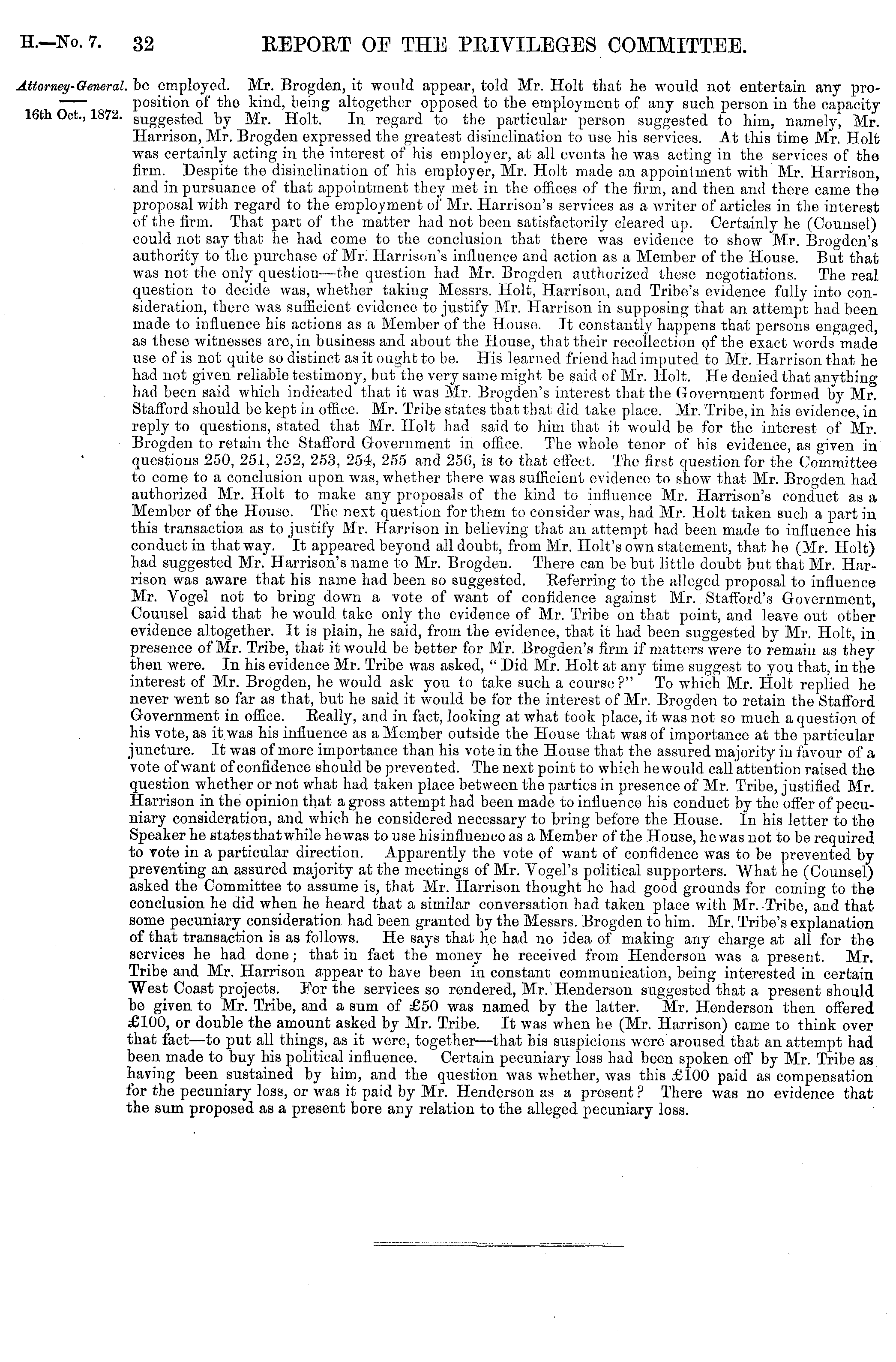 .be employed. Mr. Brogden, it would appear, told Mr. Holt that he would not entertain any proposition of the kind, being altogether opposed to the employment of any such person in the capacity suggested by Mr. Holt. In regard to the particular person suggested to him, namely, Mr. Harrison, Mr. Brogden expressed the greatest disinclination to use his services. At this time Mr. Holt was certainly acting in the interest of his employer, at all events he was acting in the services of the firm. Despite the disinclination of his employer, Mr. Holt made an appointment with Mr. Harrison, and in pursuance of that appointment they met in the offices of the firm, and then and there came the proposal with regard to the employment of Mr. Harrison's services as a writer of articles in the interest of the firm. That part of the matter had not been satisfactorily cleared up. Certainly he (Counsel) could not say that he had come to the conclusion that there was evidence to show Mr. Brogden's authority to the purchase of Mr. Harrison's influence and action as a Member of the House. But that was not the only question—the question had Mr. Brogden authorized these negotiations. The real question to decide was, whether taking Messrs. Holt, Harrison, and Tribe's evidence fully into consideration, there was sufficient evidence to justify Mr. Harrison in supposing that an attempt had been made to influence his actions as a Member of the House. It constantly happens that persons engaged, as these witnesses are, in business and about the House, that their recollection of the exact words made use of is not quite so distinct as it ought to be. His learned friend had imputed to Mr. Harrison that he had not given reliable testimony, but the very same might be said of Mr. Holt. He denied that anything bad been said which indicated that it was Mr. Brogden's interest that the Government formed by Mr. Stafford should be kept in office. Mr. Tribe states that that did take place. Mr. Tribe, in his evidence, in reply to questions, stated that Mr. Holt had said to him that it would be for the interest of Mr. Brogden to retain the Stafford Government in office. The whole tenor of his evidence, as given in questions 250, 251, 252, 253, 254, 255 and 256, is to that effect. The first question for the Committee to come to a conclusion upon was, whether there was sufficient evidence to show that Mr. Brogden had authorized Mr. Holt to make any proposals of the kind to influence Mr. Harrison's conduct as a Member of the House. The next question for them to consider was, had Mr. Holt taken such a part in this transaction as to justify Mr. Harrison in believing that an attempt had been made to influence his conduct in that way. It appeared beyond all doubt, from Mr. Holt's own statement, that he (Mr. Holt) had suggested Mr. Harrison's name to Mr. Brogden. There can be but little doubt but that Mr. Harrison was aware that his name had been so suggested. Referring to the alleged proposal to influence Mr. Vogel not to bring down a vote of want of confidence against Mr. Stafford's Government, Counsel said that he would take only the evidence of Mr. Tribe on that point, and leave out other evidence altogether. It is plain, he said, from the evidence, that it had been suggested by Mr. Holt, in presence of Mr. Tribe, that it would be better for Mr. Brogden's firm if matters were to remain as they then were. In his evidence Mr. Tribe was asked, " Did Mr. Holt at any time suggest to you that, in the interest of Mr. Brogden, he would ask you to take such a course ?" To which Mr. Holt replied he never went so far as that, but he said it would be for the interest of Mr. Brogden to retain the Stafford Government in office. Really, and in fact, looking at what took place, it was not so much a question of his vote, as it was his influence as a Member outside the House that was of importance at the particular juncture. It was of more importance than his vote in the House that the assured majority in favour of a vote of want of confidence should be prevented. The next point to which he would call attention raised the question whether or not what had taken place between the parties in presence of Mr. Tribe, justified Mr. Harrison in the opinion that a gross attempt had been made to influence his conduct by the offer of pecuniary consideration, and which he considered necessary to bring before the House. In his letter to the Speaker he states that while hewas to use hisinfluence as a Member of the House, he was not to be required to vote in a particular direction. Apparently the vote of want of confidence was to be prevented by preventing an assured majority at the meetings of Mr. Vogel's political supporters. What he (Counsel) asked the Committee to assume is, that Mr. Harrison thought he had good grounds for coming to the conclusion he did when he heard that a similar conversation had taken place with Mr. Tribe, and that some pecuniary consideration had been granted by the Messrs. Brogden to him. Mr. Tribe's explanation of that transaction is as follows. He says that he had no idea of making any charge at all for the services he had done; that in fact the money he received from Henderson was a present. Mr. Tribe and Mr. Harrison appear to have been in constant communication, being interested in certain West Coast projects. For the services so rendered, Mr. Henderson suggested that a present should be given to Mr. Tribe, and a sum of £50 was named by the latter. Mr. Henderson then offered £100, or double the amount asked by Mr. Tribe. It was when he (Mr. Harrison) came to think over that fact—to put all things, as it were, together —that his suspicions were aroused that an attempt had been made to buy his political influence. Certain pecuniary loss had been spoken off by Mr. Tribe as having been sustained by him, and the question was whether, was this £100 paid as compensation for the pecuniary loss, or was it paid by Mr. Henderson as a present