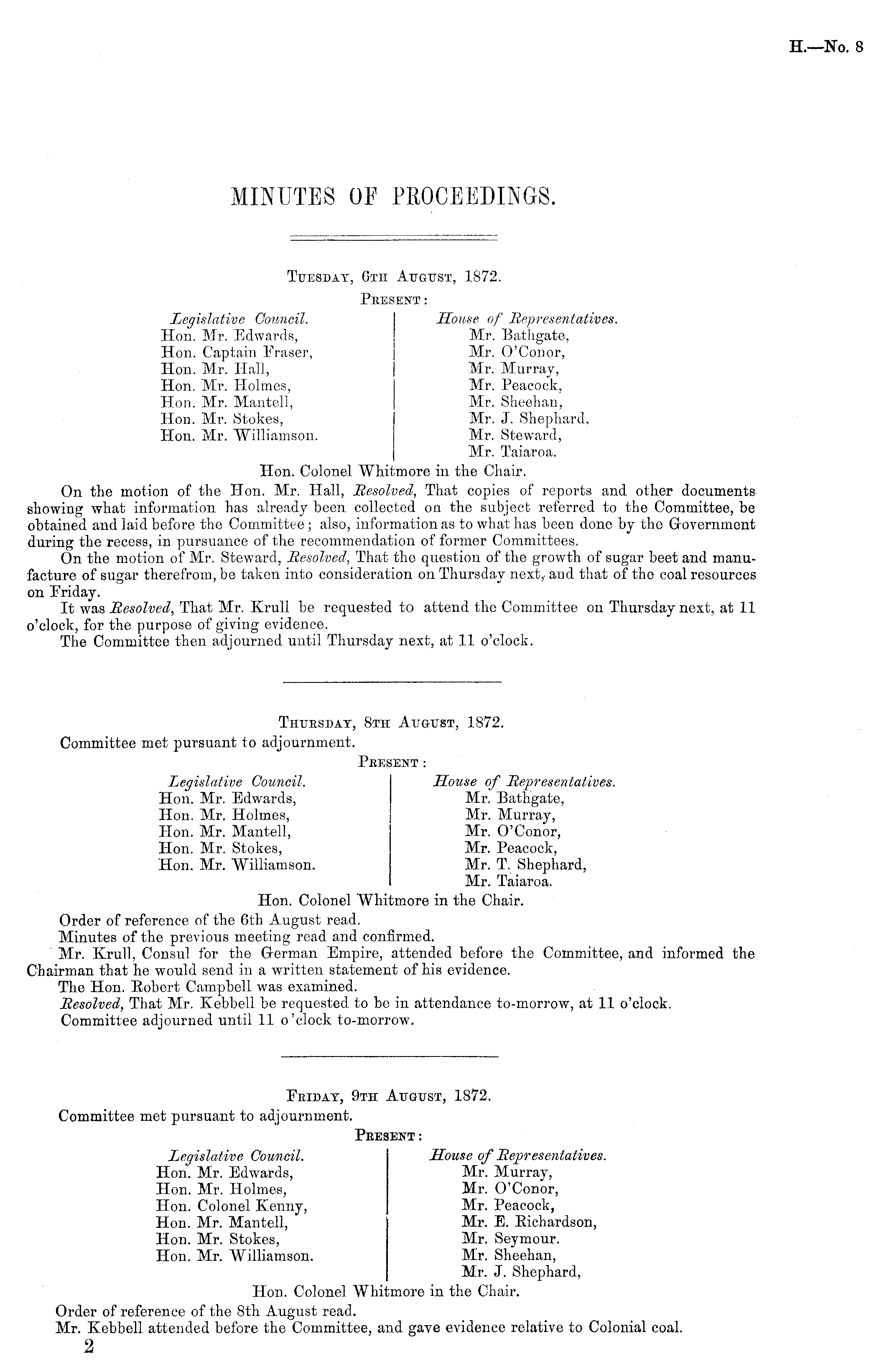 Tuesday, 6th August, 1872. Peesent: Legislative Council. House of Representatives. Hon. Mr. Edwards, Mr. Bathgate, Hon. Captain Fraser, Mr. O'Conor, Hon. Mr. Hall, Mr. Murray, Hon. Mr. Holmes, Mr. Peacock, Hon. Mr. Mantell, Mr. Sheehan', Hon. Mr. Stokes, Mr. J. Shephard. Hon. Mr. Williamson. Mr. Steward, Mr. Taiaroa. Hon. Colonel Whitmore in the Chair. On the motion of the Hon. Mr. Hall, Resolved, That copies of reports and other documents showing what information has already been collected on the subject referred to the Committee, be obtained and laid before the Committee ; also, information as to what has been done by the Government during the recess, in pursuance of the recommendation of former Committees. On the motion of Mr. Steward, Resolved, That the question of the growth of sugar beet and manufacture of sugar therefrom, be taken into consideration on Thursday next/ and that of the coal resources on Friday. It was Resolved, That Mr. Krull be requested to attend the Committee on Thursday next, at 11 o'clock, for the purpose of giving evidence. The Committee then adjourned until Thursday next, at 11 o'clock.