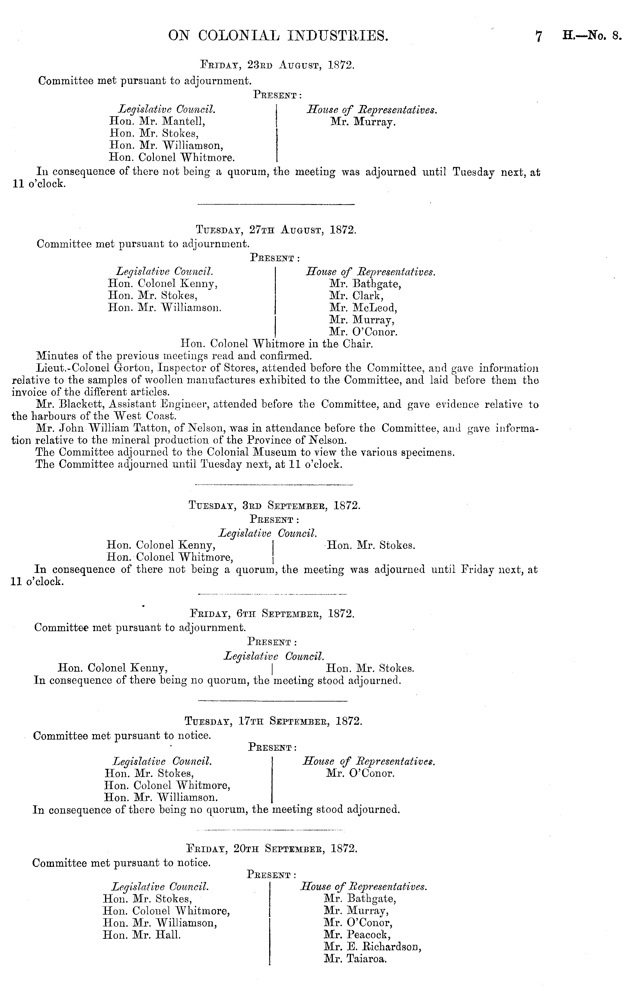 Tuesday, 27th August, 1872. Committee met pursuant to adjournment. Present : Legislative Council. House of Representatives. Hon. Colonel Kenny, Mr. Bathgate, Hon. Mr. Stokes, ' Mr. Clark, Hon. Mr. Williamson. Mr. McLeod, Mr. Murray, Mr. O'Conor. Hon. Colonel Whitmore in the Chair. Minutes of the previous meetings read and confirmed. Lieut.-Colonel Gorton, Inspector of Stores, attended before the Committee, and gave information relative to the samples of woollen manufactures exhibited to the Committee, and laid before them the invoice of the different articles. Mr. Blackett, Assistant Engineer, attended before the Committee, and gave evidence relative to the harbours of the West Coast. Mr. John William Tatton, of Nelson, was in attendance before the Committee, and gave information relative to the mineral production of the Province of Nelson. The Committee adjourned to the Colonial Museum to view the various specimens. The Committee adjourned until Tuesday next, at 11 o'clock.