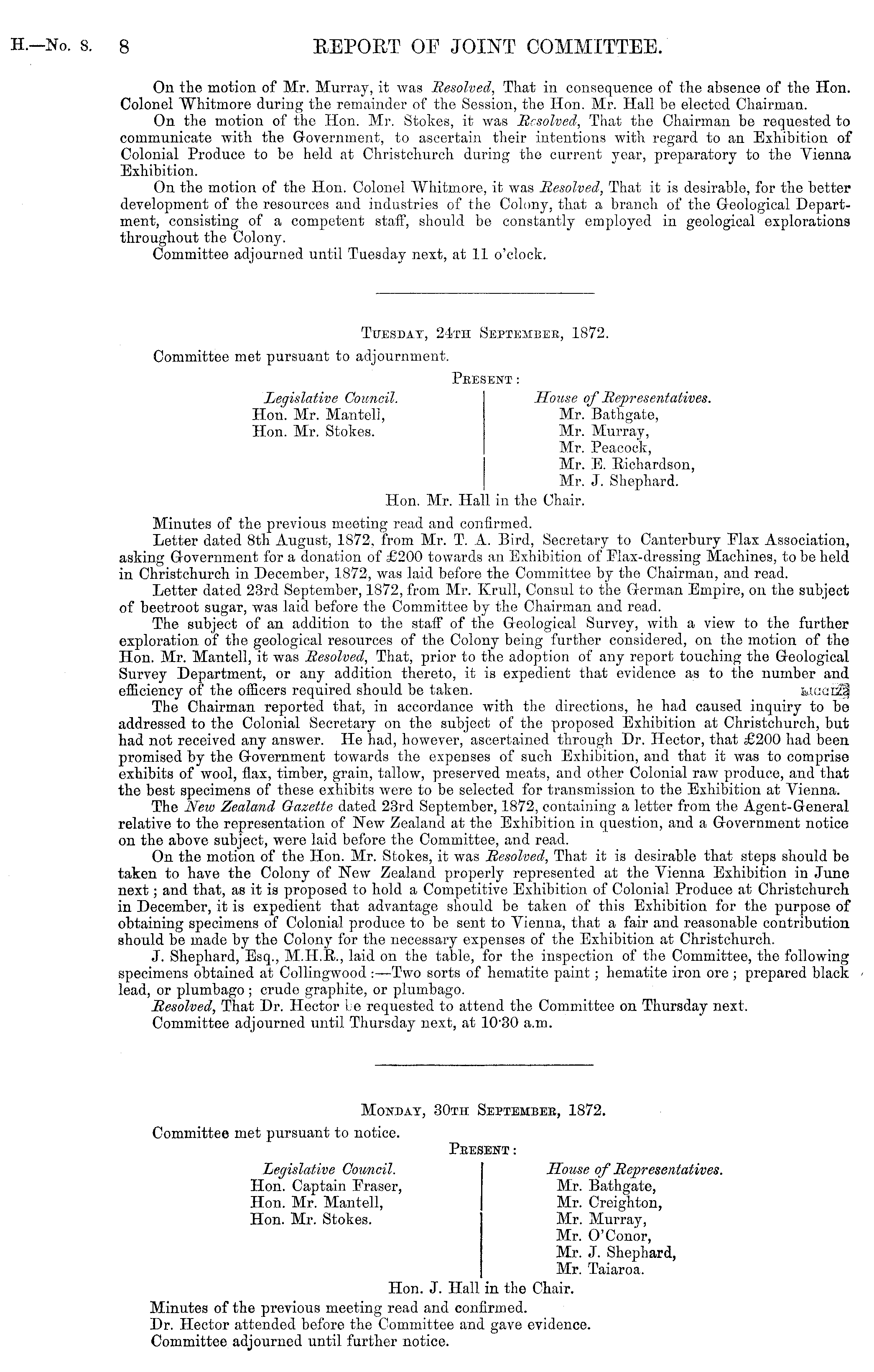 Monday, 30th September, 1872. Committee met pursuant to notice. Present: Legislative Council. House of Representatives. Hon. Captain Fraser, Mr. Bathgate, Hon. Mr. Mantell, Mr. Creighton, Hon. Mr. Stokes. Mr. Murray, Mr. O'Conor, Mr. J. Shephard, Mr. Taiaroa. Hon. J. Hall in the Chair. Minutes of the previous meeting read and confirmed. Dr. Hector attended before the Committee and gave evidence. Committee adjourned until further notice.