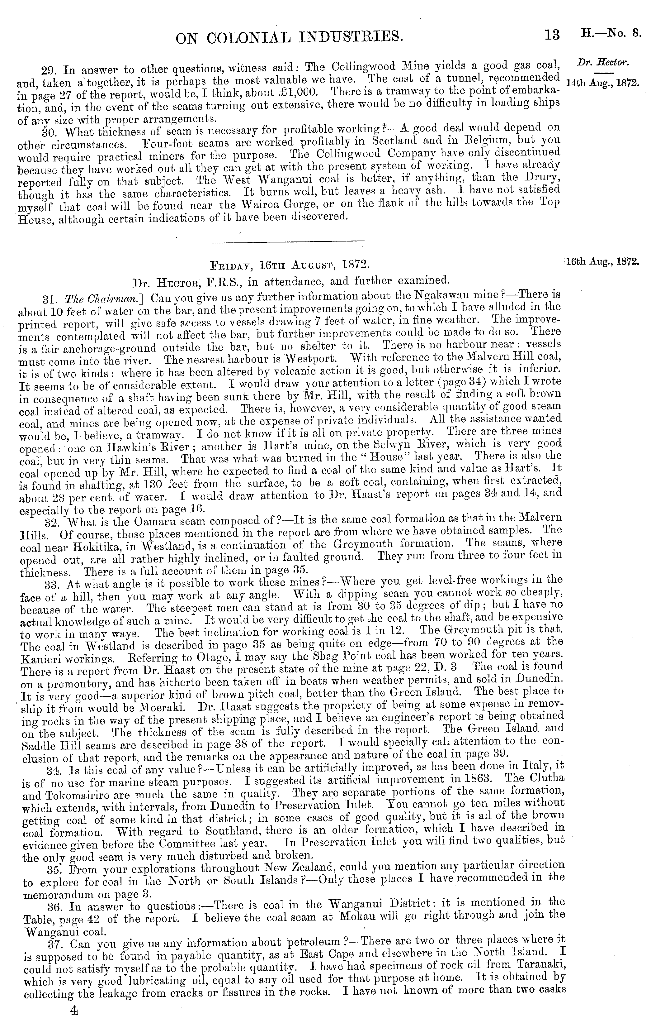 Friday, 16th August, 1872. !l Dr. Hector, F.E.S., in attendance, and further examined. 31. The Chairman.] Can you give us any further information about the Ngakawau mine ?—There is about 10 feet of water on the bar, and the present improvements going on, to which I have alluded in the printed report, will give safe access to vessels drawing 7 feet of water, in fine weather. The improvements contemplated will not affect the bar, but further improvements could be made to do so. Ihere is a fair anchorage-ground outside the bar, but no shelter to it. There is no harbour near: vessels must come into the river. The nearest harbour is West/port. With reference to the Malvern Hill coal, it is of two kinds : where it has been altered by volcanic action it is good, but otherwise it is inferior. It seems to be of considerable extent. I would draw your attention to a letter (page 34) which I wrote in consequence of a shaft having been sunk there by Mr. Hill, with the result of finding a soft brown coal instead of altered coal, as expected. There is, however, a very considerable quantity of good steam coal and mines are being opened now, at the expense of private individuals. All the assistance wanted would be, I believe, a tramway. Ido not know if it is all on private property. There are three mines opened: one on Hawkin's Biver ; another is Hart's mine, on the Selwyn Biver, which is very good coal but in very thin seams. That was what was burned in the " House" last year. There is also the coal'opened up by Mr. Hill, where he expected to find a coal of the same kind and value as Hart's. It is found in shafting, at 130 feet from the surface, to be a soft coal, containing, when first extracted about 2S per cent, of water. I would draw attention to Dr. Haast's report on pages 34 and 14, and especially to the report on page 10. . 32. "What is the Oamaru seam composed of ?—lt is the same coal formation as that in the Malvern Hills Of course those places mentioned in the report are from where we have obtained samples. The coal near Hokitika, in Westland, is a continuation of the Greymouth formation. The seams, where opened out, are all rather highly inclined, or in faulted ground. They run from three to four feet m thickness. There is a full account of them in page 35. . • . 33 At what angle is it possible to work these mines ?—Where you get level-free workings m the face of a hill, then you may work at any angle. With a dipping seam you cannot work so cheaply, because of the water. The steepest men can stand at is from 30 to 35 degrees of dip ; but 1 have no actual knowledge of such a mine. It would be very difficult to get the coal to the shaft, and be expensive to work in many ways. The best inclination for working coal is lin 12, The Greymouth pit is that. The coal in Westland is described in page 35 as being quite on edge—from 70 to 90 degrees at the Kanieri workings. Eeferring to Otago, 1 may say the Shag Point coal has been worked for ten years There is a report from Dr. Haast on the present state of the mine at page 22, D. 3 The coal is found on a promontory, and has hitherto been taken off in boats when weather permits, and sold m Dunedin. It is very o-ood—a superior kind of brown pitch coal, better than the Green Island. The best place to ship it from would be Moeraki. Dr. Haast suggests the propriety of being at some expense m removing rocks in the way of the present shipping place, and I believe an engineer's report is being obtained on the subject. The thickness of the seam is fully described in the report. The Green Island and Saddle Hill seams are described in page 38 of the report. I would specially call attention to the conclusion of that report, and the remarks on the appearance and nature of the coal m page 39.^ . 34. Is this coal of any value ?—Unless it can be artificially improved, as has been done m Italy, it is of no use for marine steam purposes. I suggested its artificial improvement ia 1863. The Clutha and Tokomairiro are much the same in quality. They are separate portions of the same formation, which extends, with intervals, from Dunedin to Preservation Inlet. Tou cannot go ten miles without getting coal of some kind in that district; in some cases of good quality, but it is all of the brown coal formation. With regard to Southland, there is an older formation, which I have described in evidence given before the Committee last year. In Preservation Inlet you will find two qualities, but the only good seam is very much disturbed and broken. 35 From your explorations throughout New Zealand, could you mention any particular direction to explore for coal in the North or South Islands ?—Only those places I have recommended in the memorandum on page 3. .—.... ~ • .• y ■ ix. 36 In answer to questions:—There is coal in the Wanganui District: it is mentioned in the Table, page 42 of the report. I believe tho coal seam at Mokau will go right through and join the Wanganui coal. ' . , ~ 37. Can you give us any information about petroleum ?—There are two or three places where it is supposed to be found in payable quantity, as at East Cape and elsewhere in the North Island. I could not satisfy myself as to the probable quantity. I have had specimens of rock oil from taranaki, which is very good lubricating oil, equal to any oil used for that purpose at home. It is obtained by collecting the leakage from cracks or fissures in the rocks. I have not known of more than two casks 4