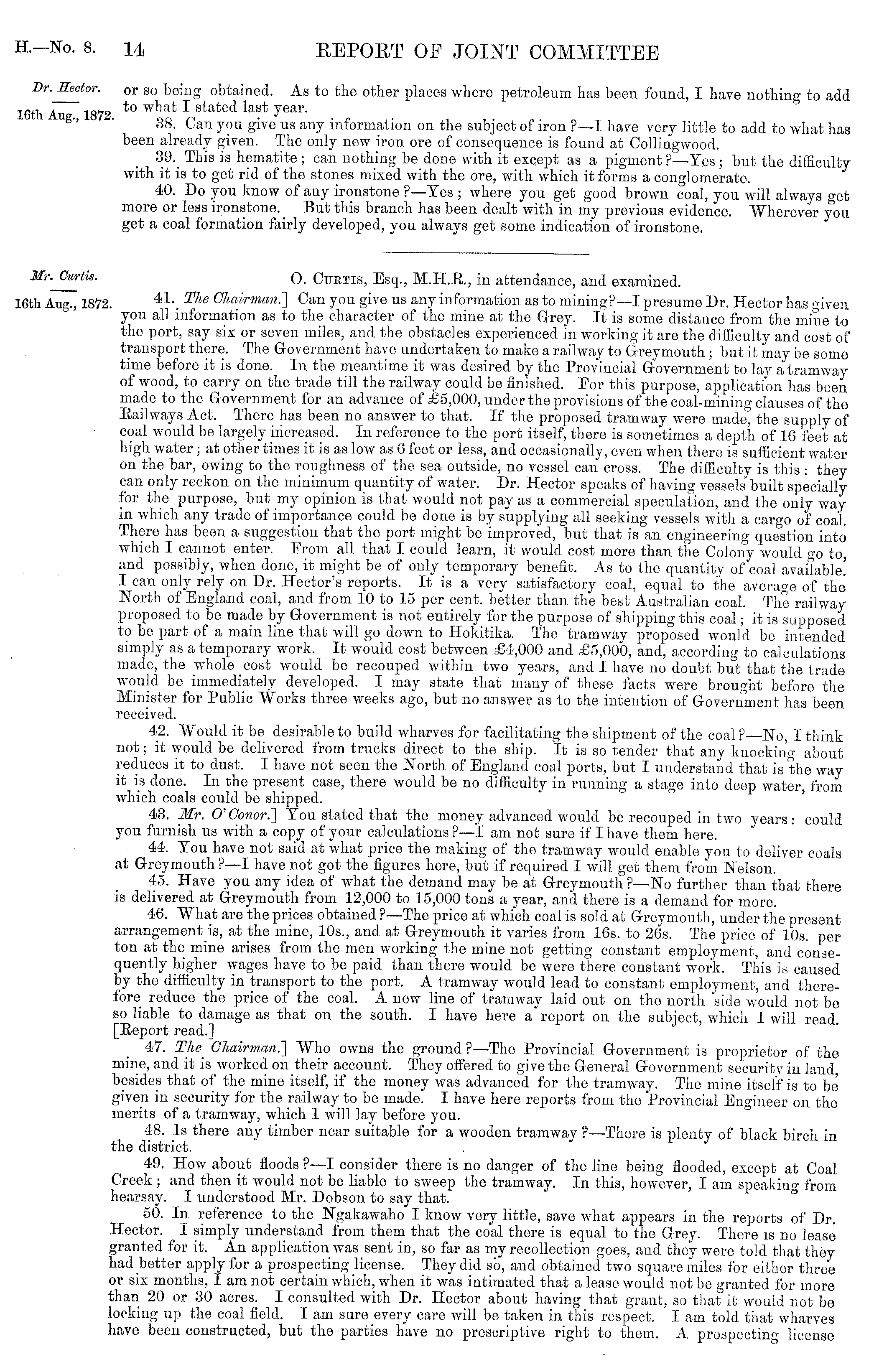 0. Curtis, Esq., M.H.E., in attendance, and examined. 41._ The Chairman.] Can you give us any information as to mining?—l presume Dr. Hector has given you all information as to the character of the mine at the Grey. It is some distance from the mine to the port, say six or seven miles, and the obstacles experienced in working it are the difficulty and cost of transport there. The Government have undertaken to make a railway to Greymouth ; but it may be some time before it is done. In the meantime it was desired by the Provincial Government to lay a tramway of wood, to carry on the trade till the railway could be finished. For this purpose, application has been made to the Government for an advance of £5,000, under the provisions of the coal-mining clauses of the Eailways Act. There has been no answer to that. If the proposed tramway were made* the supply of coal would be largely increased. In reference to the port itself, there is sometimes a depth of 16 feet at high water ; at other times it is as low as 6 feet or less, and occasionally, even when there is sufficient water on the bar, owing to the roughness of the sea outside, no vessel can cross. The difficulty is this : they can only reckon on the minimum quantity of water. Dr. Hector speaks of having vessels" built specially for the purpose, but my opinion is that would not pay as a commercial speculation, and the only way in which any trade of importance could be done is by supplying all seeking vessels with a car°-o of coal. There has been a suggestion that the port might be improved, but that is an engineering question into which I cannot enter. From all that I could learn, it would cost more than the Colony would go to, and possibly, when done, it might be of only temporary benefit. As to the quantity of coal available! I can only rely on Dr. Hector's reports. It is a very satisfactory coal, equal to the average of the North of England coal, and from 10 to 15 per cent, better than the best Australian coal. The railway proposed to be made by Government is not entirely for the purpose of shipping this coal; it is supposed to be part of a main line that will go down to Hokitika. Tho tramway proposed would bo intended simply as a temporary work. It would cost between £4,000 and £5,000, and, according to calculations made, the whole cost would be recouped within two years, and I have no doubt but that the trade would be immediately developed. I may state that many of these facts were brought before the Minister for Public Works three weeks ago, but no answer as to the intention of Government has been received. 42. Would it be desirable to build wharves for facilitating the shipment of the coal ?—No, I think not; it would be delivered from trucks direct to the ship. It is so tender that any knocking about reduces it to dust. I have not seen the North of England coal ports, but I understand that is the way it is done. In the present case, there would be no difficulty in running a stage into deep water, from which coals could be shipped. 43. Mr. O'Conor.] Tou stated that the money advanced would be recouped in two years: could you furnish us with a copy of your calculations ? —I am not sure if I have them here. 44. Tou have not said at what price the making of the tramway would enable you to deliver coals at Greymouth ?—I have not got the figures hero, but if required I will get them from Nelson. 45. Have you any idea of what the demand may be at Greymouth ?—-No further than that there is delivered at Greymouth from 12,000 to 15,000 tons a year, and there is a demand for more. 46. What are the prices obtained ? —Tho price at which coal is sold at Greymouth, under the present arrangement is, at the mine, 10s., and at Greymouth it varies from 16s. to 265. The price of 10s. per ton at the mine arises from the men working the mine not getting constant employment, and consequently higher wages have to be paid than there would be were there constant work. This is caused by the difficulty in transport to the port. A tramway would lead to constant employment, and therefore reduce the price of tho coal. A new line of tramway laid out on the north side would not be so liable to damage as that on the south. I have here a"report on the subject, which I will read. [Eeport read.] 47. The Chairman.] Who owns the ground ?—The Provincial Government is proprietor of the mine, and it is worked on their account. They offered to give the General Government security in land besides that of the mine itself, if the money was advanced for the tramway. The mine itself is to be given in security for the railway to be made. I have here reports from the Provincial Engineer on the merits of a tramway, which I will lay before you. 48. Is there any timber near suitable for a wooden tramway ? —There is plenty of black birch in the district. 49. How about floods ?—I consider there is no danger of the line being flooded, except at Coal Creek ; and then it would not be liable to sweep the tramway. In this, however, lam speaking from hearsay. I understood Mr. Dobson to say that. 50. In reference to the Ngakawaho I know very little, save what appears in the reports of Dr. Hector. I simply understand from them that the coal there is equal to the Grey. There is no lease granted for it. An application was sent in, so far as my recollection goes, and they were told that they had better apply for a prospecting license. They did so, and obtained two square miles for either three or six months, I am not certain which, when it was intimated that a lease would not be granted for more than 20 or 30 acres. I consulted with Dr. Hector about having that grant, so that it would not be locking up the coal field. lam sure every care will be taken in this respect. lam told that wharves have been constructed, but the parties have no prescriptive right to them. A prospecting license