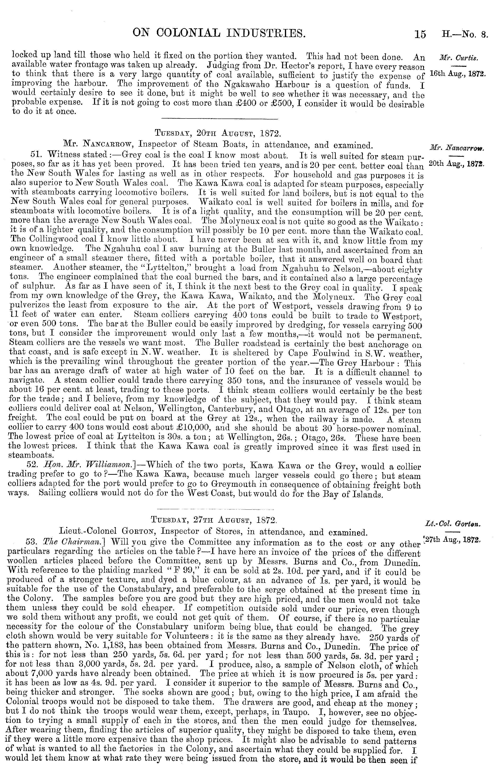 Tuesday, 20th August, 1872. Mr. Nancarrow, Inspector of Steam Boats, in attendance, and examined. 51. Witness stated : —Grey coal is the coal I know most about. It is well suited for steam purposes, so far as it has yet been proved. It has been tried ten years, and is 20 per cent, better coal than the New South Wales for lasting as well as in other respects. For household and gas purposes it is also superior to New South Wales coal. The Kawa Kawa coal is adapted for steam purposes, especially with steamboats carrying locomotive boilers. It "is well suited for land boilers, but is not equal to the New South Wales coal for general purposes. Waikato coal is well suited for boilers in mills, and for steamboats with locomotive boilers. It is of a light quality, and the consumption will be 20 per cent, more than the average New South Wales coal. The Molyneux coal is not quite so good as the Waikato ■ it is of a lighter quality, and the consumption will possibly be 10 per cent, more than the Waikato coal" The Collingwood coal I know little about. I have never been at sea with it, and know little from my own knowledge. The Ngahuhu coal I saw burning at the Buller last month, and ascertained from an engineer of a small steamer there, fitted with a portable boiler, that it answered well on board that steamer. Another steamer, tho "Lyttelton," brought a load from Ngahuhu to Nelson, —about eighty tons. The engineer complained that the coal burned the bars, and it contained also a large percentage of sulphur. As far as I have seen of it, I think it the next best to the Grey coal in quality. I speak from my own knowledge of the Grey, the Kawa Kawa, Waikato, and the Molyneux. The Grey coal pulverizes the least from exposure to the air. At the port of Westport, vessels drawing from 9to 11 feet of water can enter. Steam colliers carrying 400 tons could be built to trade to Westport, or even 500 tons. The bar at the Buller could be easily improved by dredging, for vessels carrying 500 tons, but I consider the improvement would only last a few months, —it would not be permanent. Steam colliers are the vessels we want most. The Buller roadstead is certainly the best anchorage on that coast, and is safe except in N.W. weather. It is sheltered by Cape Foulwind in S.W. weather, which is the prevailing wind throughout the greater portion of the year.—The Grey Harbour : This bar has an average draft of water at high water of 10 feet on the bar. It is a difficult channel to navigate. A steam collier could trade there carrying 350 tons, and the insurance of vessels would be about 16 per cent, at least, trading to these ports. I think steam colliers would certainly be the best for the trade; and I believe, from my knowledge of the subject, that they would pay. I think steam colliers could deliver coal at Nelson, Wellington, Canterbury j and Otago, at an average of 12s. per ton freight. The coal could be put on board at the Grey at 125., when the railway is made. A steam collier to carry 400 tons would cost about £10,000, and she should be about 30 horse-power nominal. The lowest price of coal at Lyttelton is 30s. a ton; at Wellington, 265.; Otago, 265. These have been the lowest prices. I think that the Kawa Kawa coal is greatly improved since it was first used in steamboats. 52. Hon. Mr. Williamson.'] —Which of the two ports, Kawa Kawa or the Grey, would a collier trading prefer to go to ? —The Kawa Kawa, because much larger vessels could go there; but steam colliers adapted for the port would prefer to go to Greymouth in consequence of obtaining freight both w-ays. Sailing colliers would not do for the West Coast, but would do for the Bay of Islands.