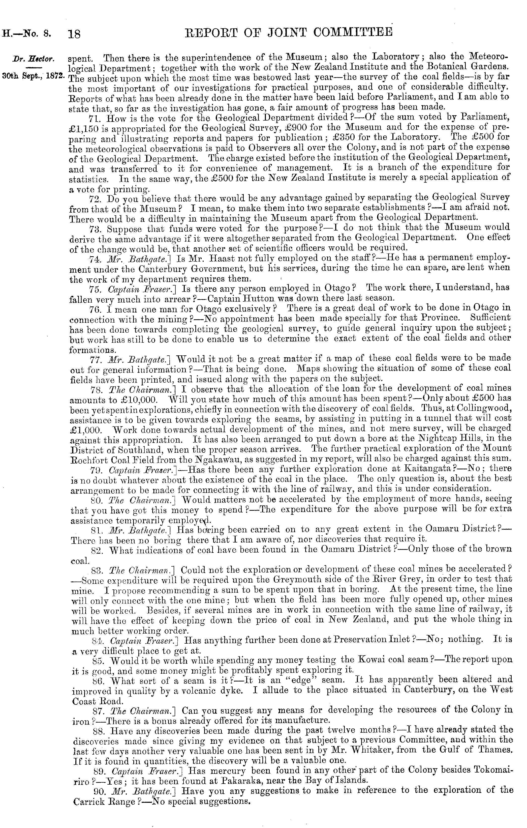 spent. Then there is the superintendence of the Museum; also the Laboratory; also the Meteorological Department; together with the work of the New Zealand Institute and the Botanical Gardens. The subject upon which the most time was bestowed last year—the survey of the coal fields—is by far tho most important of our investigations for practical purposes, and one of considerable difficulty. Eeports of what has been already done in the matter have been laid before Parliament, and I am able to state that, so far as the investigation has gone, a fair amount of progress has been made. 71. How is the vote for the Geological Department divided ?—Of the sum voted by Parliament, £1,150 is appropriated for the Geological Survey, £900 for the Museum and for the expense of preparing and illustrating reports and papers for publication; £350 for the Laboratory. The £500 for the meteorological observations is paid to Observers all over the Colony, and is not part of the expense of the Geological Department. The charge existed before the institution of the Geological Department, and was transferred to it for convenience of management. It is a branch of the _ expenditure for statistics. In the same way, the £500 for the New Zealand Institute is merely a special application of a vote for printing. 72. Do you believe that there would be any advantage gained by separating the Geological Survey from that of the Museum ? I mean, to make them into two separate establishments ?—I am afraid not. There would be a difficulty in maintaining the Museum apart from the Geological Department. 73. Suppose that funds were voted for the purpose ?—I do not think that the Museum would derive the same advantage if it were altogether separated from the Geological Department. One effect of the change would be, that another set of scientific officers would be required. 74. Mr. Bathgate.] Is Mr. Haast not fully employed on the staff?—He has a permanent employment under the Canterbury Government, but his services, during the time he can spare, are lent when the work of my department requires them. 75. Captain Fraser.] Is there any person employed in Otago ? The work there, I understand, has fallen very much into arrear ? —Captain Hutton was down there last season. 76. I mean one man for Otago exclusively ? There is a great deal of work to be done in Otago in connection with the mining ?—No appointment has been made specially for that Province. Sufficient has been done towards completing the geological survey, to guide general inquiry upon the subject; but work has still to be done to enable us to determine the exact extent of the coal fields and other formations. 77. Mr. Bathgate^] Would it not be a great matter if a map of these coal fields were to be made out for general information? —That is being done. Maps showing the situation of some of these coal fields have been printed, and issued along with the papers on the subject. 78. The Chairman.] I observe that the allocation of the loan for the development of coal mines amounts to £10,000. Will you state how much of this amount has been spent ?—Only about £500 has been yet spentin explorations, chiefly in connection with the discovery of coal fields. Thus, at Collingwood, assistance is to be given towards exploring the seams, by assisting in putting in a tunnel that will cost £1,000. Work done towards actual development of the mines, and not mere survey, will be charged against this appropriation. It has also been arranged to put down a bore at the Nightcap Hills, in the District of Southland, when the proper season arrives. The further practical exploration of the Mount Bochfort Coal Field from the Ngakawau, as suggested in my report, will also be charged against this sum. 79. Captain Fraser.] —Has"there been any further exploration done at Kaitangata?—No; there is no doubt whatever about the existence of the coal in the place. The only question is, about the best arrangement to be made for connecting it with the line of railway, and this is under consideration. 80. The Chairman.] Would matters not be accelerated by the employment of more hands, seeing that you have got this money to spend ? —The expenditure for the above purpose will be for extra assistance temporarily employ&d. 81. Mr. Bathgate.] Has betting been carried on to any great extent in the Oamaru District ?— There has been no boring there that I am aware of, nor discoveries that require it. 82. What indications of coal have been found in the Oamaru District ? —Only those of the brown coal. 83. The Chairman.] Could not the exploration or development of these coal mines be accelerated? .—Some expenditure will be required upon the Greymouth side of the Eiver Grey, in order to test that mine. I propose recommending a sum to be spent upon that in boring. At the present time, the line will only connect with the one mine; but when the field has been more fully opened up, other mines will be worked. Besides, if several mines are in work in connection with the same line of railway, it will have tho effect of keeping down the price of coal in New Zealand, and put the whole thing in much better working order. 84. Captain Fraser.] Has anything further been done at Preservation Inlet ? —No; nothing. It is a very difficult place to get at. 85. Would it be worth while spending any money testing the Kowai coal seam ?—The report upon it is good, and some money might be profitably spent exploring it. 86. What sort of a seam is it:—lt is an "edge" seam. It has apparently been altered and improved in quality by a volcanic dyke. I allude to the place situated in Canterbury, on the West Coast Eoad. 87. The Chairman.] Can you suggest any means for developing the resources of the Colony in j ron p—There is a bonus already offered for its manufacture. 88. Have any discoveries been made during the past twelve months ? —I have already stated the discoveries made since giving my evidence on th