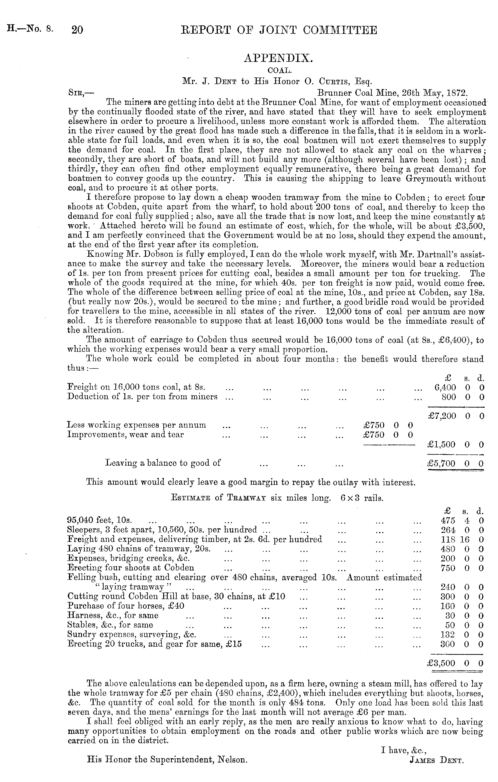 APPENDIX. COAL. Mr. J. Dent to His Honor O. Curtis, Esq. Sie ,— Brunner Coal Mine, 26th May, 1872. The miners are getting into debt at the Brunner Coal Mine, for want of employment occasioned by the continually flooded state of the river, and have stated that they will have to seek employment elsewhere in order to procure a livelihood, unless more constant work is afforded them. The alteration in the river caused by the great flood has made such a difference in the falls, that it is seldom in a workable state for full loads, and even when it is so, the coal boatmen will not exert themselves to supply the demand for coal. In the first place, they are not allowed to stack any coal on the wharves ; secondly, they are short of boats, and will not build any more (although several have been lost) ; and thirdly, they can often find other employment equally remunerative, there being a great demand for boatmen to convey goods up the country. This is causing the shipping to leave Greymouth without coal, and to procure it at other ports. I therefore propose to lay down a cheap wooden tramway from the mine to Cobden; to erect four shoots at Cobden, quite apart from the wharf, to hold about 200 tons of coal, and thereby to keep the demand for coal fully supplied ; also, save all the trade that is now lost, and keep the mine constantly at work. ' Attached hereto will be found an estimate of cost, which, for the whole, will be about £3,500, and I am perfectly convinced that the Government would be at no loss, should they expend the amount, at the end of the first year after its completion. Knowing Mr. Dobson is fully employed, I can do the whole work myself, with Mr. DartnaU's assistance to make the survey and take the necessary levels. Moreover, the miners would bear a reduction of Is. per ton from present prices for cutting coal, besides a small amount per ton for trucking. The whole of the goods required at the mine, for which 40s. per ton freight is now paid, would come free. The whole of the difference between selling price of coal at the mine, 10s., and price at Cobden, say 18s. (but really now 205.), would be secured to the mine; and further, a good bridle road would be provided for travellers to the mine, accessible in all states of the river. 12,000 tons of coal per annum are now sold. It is therefore reasonable to suppose that at least 16,000 tons would be the immediate result of the alteration. The amount of carriage to Cobden thus secured would be 16,000 tons of coal (at Bs., £6,400), to which the working expenses would bear a very small proportion. The whole work could be completed in about four months: the benefit would therefore stand thus :— £ s. d. Freight on 16,000 tons coal, at Bs. ... ... ... ... ... ... 6,400 0 0 Deduction of Is. per ton from miners ... ... ... ... ... ... 800 0 0 £7,200 0 0 Less working expenses per annum ... ... ... ... £750 0 0 Improvements, wear and tear ... ... ... ... £750 0 0 —■ —■ ■ £1,500 0 0 Leaving a balance to good of ... ... ... £5,700 0 0 This amount would clearly leave a good margin to repay the outlay with interest. Estimate of Tramway six miles long. 6x3 rails. £ s. d. 95,040 feet, 10s. ... ... ... ... ... ... ... ... 475 4 0 Sleepers, 3 feet apart, 10,560, 50s. per hundred ... ... ... ... ... 264 0 0 Freight and expenses, delivering timber, at 2s. 6d. per hundred ... ... ... 118 16 0 Laying 480 chains of tramway, 20s. ... ... ... ... ... ... 480 0 0 Expenses, bridging creeks, &c. ... ... ... ' ... ... ... 200 0 0 Erecting four shoots at Cobden ... ... ... ... ... ... 750 0 0 Felling bush, cutting and clearing over 480 chains, averaged 10s. Amount estimated " laying tramway" ... ... ... ... ... ... ... 24.0 0 0 Cutting round Cobden Hill at base, 30 chains, at £10 ... ... ... ... 300 0 0 Purchase of four horses, £40 ... ... ... ... ... ... 160 0 0 Harness, &o, for same ... ... ... ... ... ... ... 30 0 0 Stables, &c, for same ... ... ... ... ... ... ... 50 0 0 Sundry expenses, surveying, &c. ... ... ... ... ... ... 132 0 0 Erecting 20 trucks, and gear for same, £15 ... ... ... ... ... 300 0 0 £3,500 0 0 The above calculations can be depended upon, as a firm here, owning a steam mill, has offered to lay the whole tramway for £5 per chain (480 chains, £2,400), which includes everything but shoots, horses, &c. The quantity of coal sold for the month is only 484 tons. Only one load has been sold this last seven days, and tho mens' earnings for the last month will not average £6 per man. I shall feel obliged with an early reply, as the men are really anxious to know what to do, having many opportunities to obtain employment on the roads and other public works which are now being carried on in the district. I have, &c., His Honor the Superintendent, Nelson. James Dent.