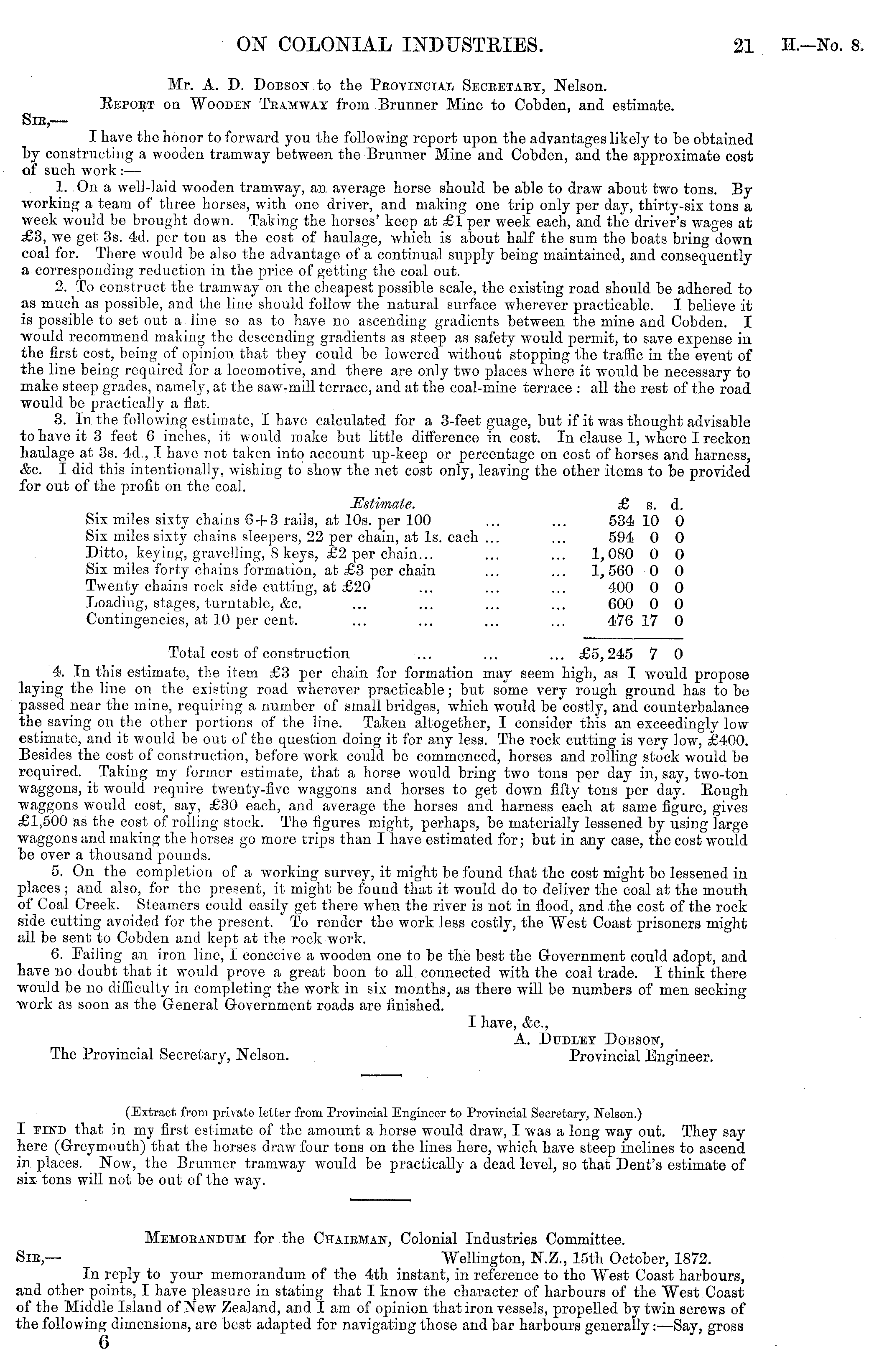 Mr. A. D. DoBSON.to the Provincial Secretary, Nelson. Eepoet on Wooden Tramway from Brunner Mine to Cobden, and estimate. Sic, — I have the honor to forward you the following report upon the advantages likely to be obtained by constructing a wooden tramway between the Brunner Mine and Cobden, and the approximate cost of such work :— 1. On a well-laid wooden tramway, an average horse should be able to draw about two tons. By working a team of three horses, with one driver, and making one trip only per day, thirty-six tons a week would be brought down. Taking the horses' keep at £1 per week each, and the driver's wages at £3, we get 3s. 4d. per ton as the cost of haulage, which is about half the sum the boats bring down coal for. There would be also the advantage of a continual supply being maintained, and consequently a corresponding reduction in the price of getting the coal out. 2. To construct the tramway on the cheapest possible scale, the existing road should be adhered to as much as possible, and the line should follow the natural surface wherever practicable. I believe it is possible to set out a line so as to have no ascending gradients between the mine and Cobden. I would recommend making the descending gradients as steep as safety would permit, to save expense in the first cost, being of opinion that they could be lowered without stopping the traffic in the event of the line being required for a locomotive, and there are only two places where it would be necessary to make steep grades, namely, at the saw-mill terrace, and at the coal-mine terrace : all the rest of the road would be practically a flat, 3. In the following estimate, I have calculated for a 3-feet guage, but if it was thought advisable to have it 3 feet 6 inches, it would make but little difference in cost. In clause 1, where I reckon haulage at 3s. 4d., I have not taken into account up-keep or percentage on cost of horses and harness, &c. I did this intentionally, wishing to show the net cost only, leaving the other items to be provided for out of the profit on the coal. Estimate. £ s. d. Six miles sixty chains 6+ 3 rails, at 10s. per 100 ... ... 534 10 0 Six miles sixty chains sleepers, 22 per chain, at Is. each ... ... 594 0 0 Ditto, keying, gravelling, 8 keys, £2 per chain... ... ... 1,080 0 0 Six miles forty chains formation, at £3 per chain ... ... 1,560 0 0 Twenty chains rock side cutting, at £20 ... ... ... 400 0 0 Loading, stages, turntable, &c. ... ... ... ... 600 0 0 Contingencies, at 10 per cent. ... ... ... ... 476 17 0 Total cost of construction ... ... ... £5,245 7 0 4. In this estimate, the item £3 per chain for formation may seem high, as I would propose laying the line on the existing road wherever practicable; but some very rough ground has to be passed near the mine, requiring a number of small bridges, which would be costly, and counterbalance the saving on the other portions of the line. Taken altogether, I consider this an exceedingly low estimate, and it would be out of the question doing it for any less. The rock cutting is very low, £400. Besides the cost of construction, before work could, be commenced, horses and rolling stock would be required. Taking my former estimate, that a horse would bring two tons per day in, say, two-ton waggons, it would require twenty-five waggons and horses to get down fifty tons per day. Bough waggons would cost, say, £30 each, and average the horses and harness each at same figure, gives £1,500 as the cost of rolling stock. The figures might, perhaps, be materially lessened by using large waggons and making the horses go more trips than I have estimated for; but in any case, the cost would be over a thousand pounds. 5. On the completion of a working survey, it might be found that the cost might be lessened in places ; and also, for the present, it might be found that it would do to deliver the coal at the mouth of Coal Creek. Steamers could easily get there when the river is not in flood, and the cost of the rock side cutting avoided for the present. To render the work less costly, the West Coast prisoners might all be sent to Cobden and kept at the rock work. 6. Failing an iron line, I conceive a wooden one to be the best the Government could adopt, and have no doubt that it would prove a great boon to all connected with the coal trade. I think there would be no difficulty in completing the work in six months, as there will be numbers of men seeking work as soon as the General Government roads are finished. I have, &c, A. Dudley Dobson, The Provincial Secretary, Nelson. Provincial Engineer.