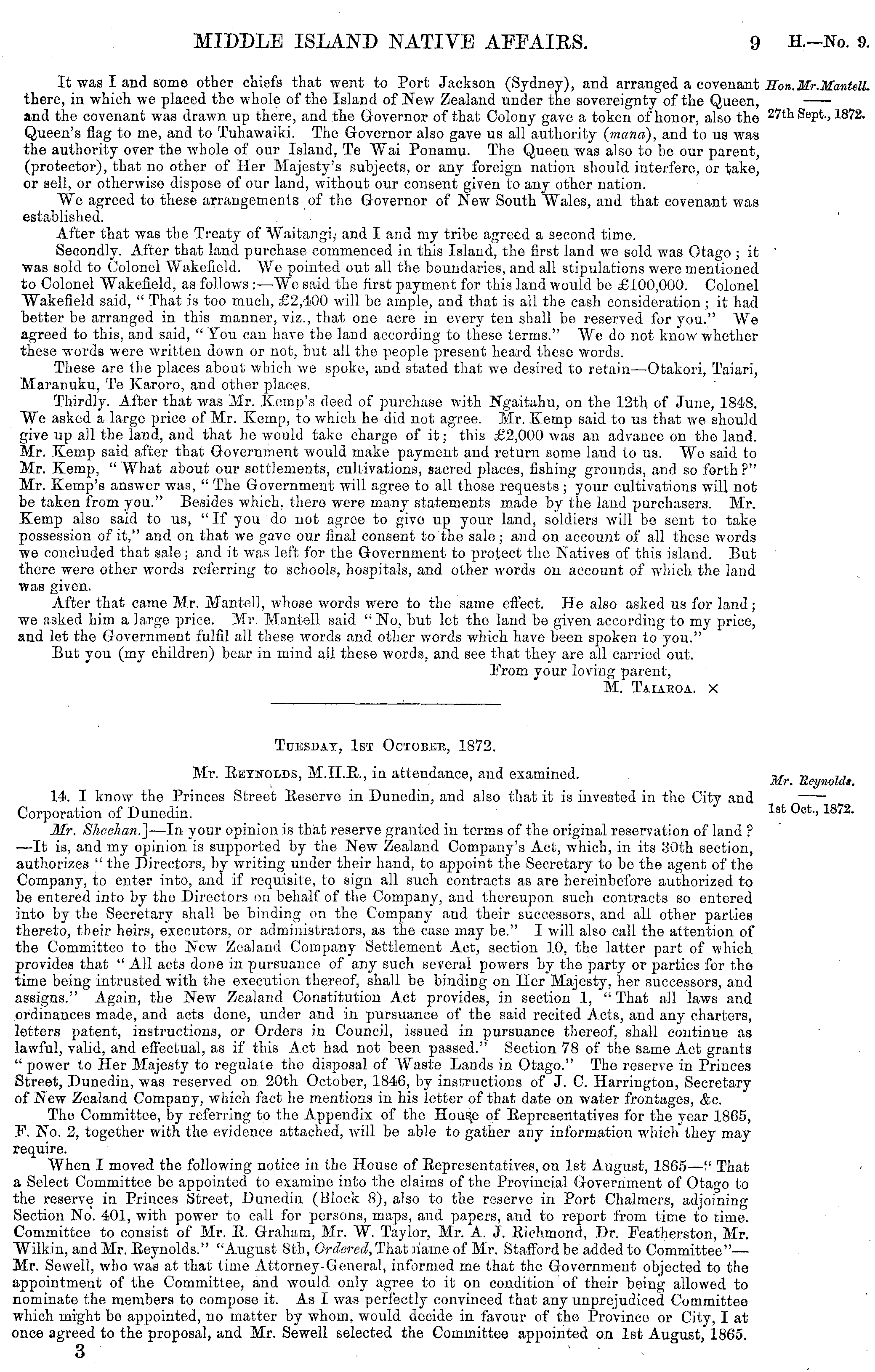 Tuesday, Ist October, 1872. Mr. Reynolds, M.H.R., in attendance, and examined. 14. I know the Princes Street Reserve in Dunedin, and also that it is invested in tho City and Corporation of Dunedin. Mr. Sheehan.] —In your opinion is that reserve granted in terms of the original reservation of land ? —It is, and my opinion is supported by the New Zealand Company's Act, which, in its 30th section, authorizes " the Directors, by writing under their hand, to appoint the Secretary to be the agent of the Company, to enter into, and if requisite, to sign ali such contracts as are hereinbefore authorized to be entered into by the Directors on behalf of the Company, and thereupon such contracts so entered into by the Secretary shall bo binding on the Company and their successors, and all other parties thereto, their heirs, executors, or administrators, as the case may be." I will also call the attention of the Committee to tho New Zealand Company Settlement Act, section 10, tho latter part of which provides that " All acts done in pursuance of any such several powers by the party or parties for the time being intrusted with the execution thereof, shall be binding on Her Majesty, her successors, and assigns." Again, the New Zealand Constitution Act provides, in section 1, " That all laws and ordinances made, and acts done, under and in pursuance of the said recited Acts, and any charters, letters patent, instructions, or Orders in Council, issued in pursuance thereof, shall continue as lawful, valid, and effectual, as if this Act had not been passed." Section 78 of the same Act grants " power to Her Majesty to regulate the disposal of Waste Lands in Otago." The reserve in Princes Street, Dunedin, was reserved on 20th October, 1846, by instructions of J. C. Harrington, Secretary of New Zealand Company, which fact he mentions in his letter of that date on water frontages, &c. The Committee, by referring to tho Appendix of the House of Representatives for the year 1865, E. No. 2, together with the evidence attached, will be able to gather any information which they may require. When I moved the following notice in tho House of Representatives, on Ist August, 1865—" That a Select Committee be appointed to examine into the claims of tho Provincial Government of Otago to the reserve in Princes Street, Dunedin (Block 8), also to the reserve in Port Chalmers, adjoining Section No. 401, with power to call for persons, maps, and papers, and to report from time to time. Committee to consist of Mr. R. Graham, Mr. W. Taylor, Mr. A. J. Richmond, Dr. Featherston, Mr. Wilkin, and Mr. Reynolds." "August Bth, Ordered, That name of Mr. Stafford be added to Committee"— Mr. Sewell, who was at that time Attorney-General, informed me that the Government objected to the appointment of the Committee, and would only agree to it on condition of their being allowed to nominate the members to compose it. As I was perfectly convinced that any unprejudiced Committee which might be appointed, no matter by whom, would decide in favour of the Province or City, I at once agreed to the proposal, and Mr. Sewell selected the Committee appointed on Ist August, 1865. 3