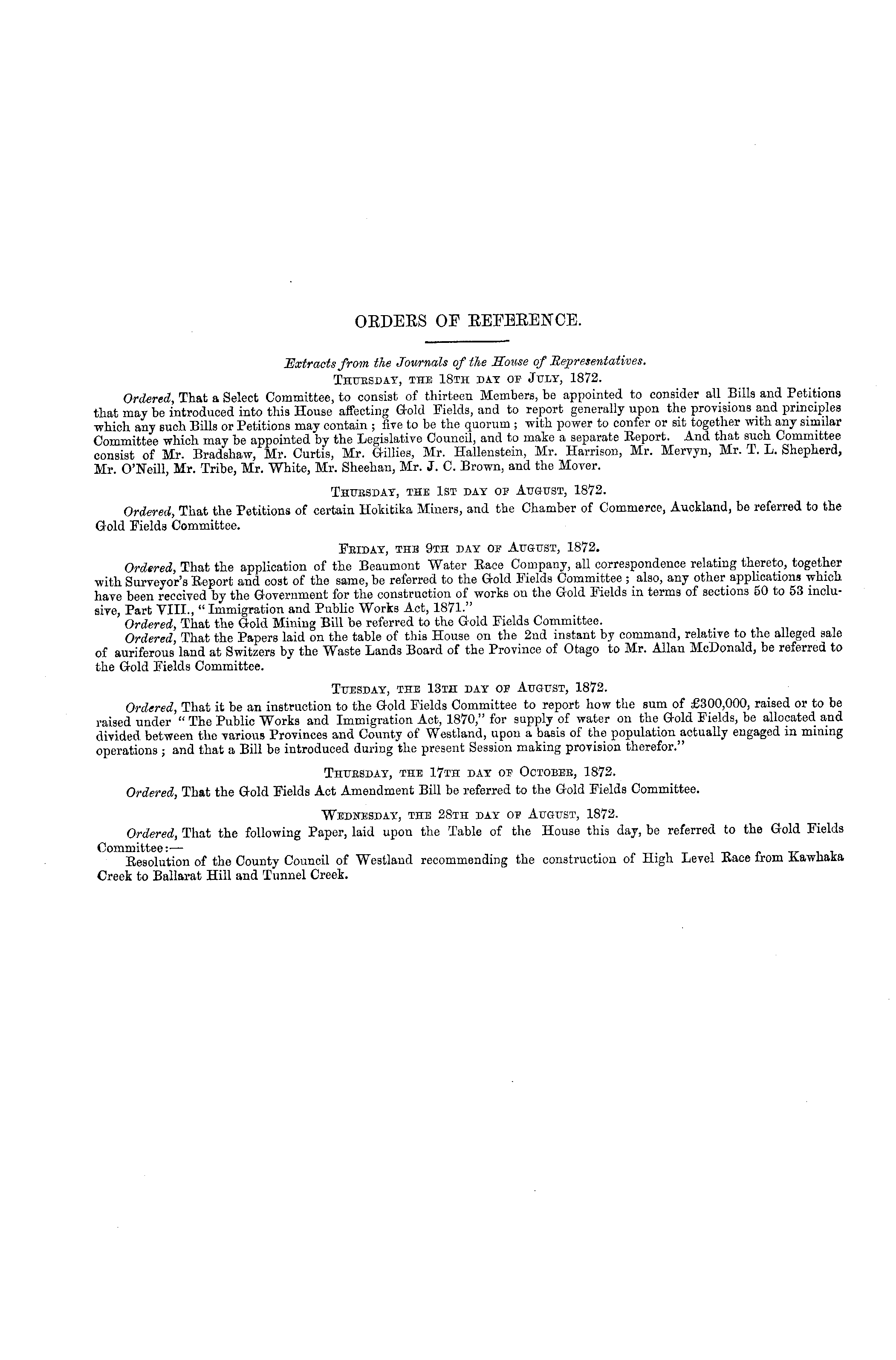 Extracts from the Journals of the Souse of Representatives. Thuesday, the 18th day or July, 1872. Ordered, That a Select Committee, to consist of thirteen Members, be appointed to consider all Bills and Petitions that may be introduced into this House affecting G-old Fields, and to report generally upon the provisions and principles which any such Bills or Petitions may contain ; five to be the quorum ; with power to confer or sit together with any similar Committee which may be appointed by the Legislative Council, and to make a separate Report. And that such Committee consist of Mr. Bradshaw, Mr. Curtis, Mr. Gillies, Mr. Hallenstein, Mr. Harrison, Mr. Mervyn, Mr. T. L. Shepherd, Mr. O'Neill, Mr. Tribe, Mr. White, Mr. Sheehan, Mr. J. C. Brown, and the Mover. Thursday, the Ist day or August, 1872. Ordered, That the Petitions of certain Hokitika Miners, and the Chamber of Commerce, Auckland, be referred to the Gold Fields Committee. Feiday, thb 9th day or August, 1872. Ordered, That the application of the Beaumont Water Bace Company, all correspondence relating thereto, together with Surveyor's Report and cost of the same, be referred to the Gold Fields Committee ; also, any other applications which have been received by the Government for the construction of works on the Gold Fields in terms of sections 50 to 53 inclusive, Part VIII., " Immigration and Public Works Act, 1871." Ordered, That the Gold Mining Bill be referred to the Gold Fields Committee. Ordered, That the Papers laid on the table of this House on the 2nd instant by command, relative to the alleged sale of auriferous land at Switzers by the Waste Lands Board of the Province of Otago to Mr. Allan McDonald, be referred to the Gold Fields Committee. Tuesday, the 13th day or August, 1872. Ordered, That it be an instruction to the Gold Fields Committee to report how the sum of £300,000, raised or to be raised under " The Public Works and Immigration Act, 1870," for supply of water on the Gold Fields, be allocated and divided between the various Provinces and County of Westland, upon a basis of the population actually engaged in mining operations ; and that a Bill be introduced during the present Session making provision therefor." Thuesday, the 17th day or October, 1872. Ordered, That the Gold Fields Act Amendment Bill be referred to the Gold Fields Committee. Wednesday, the 28th day or August, 1872. Ordered, That the following Paper, laid upon the Table of the House this day, be referred to the Gold Fields Committee: — Resolution of the County Council of Westland recommending the construction of High Level Race from Rawhaka Creek to Ballarat Hill and Tunnel Creek.