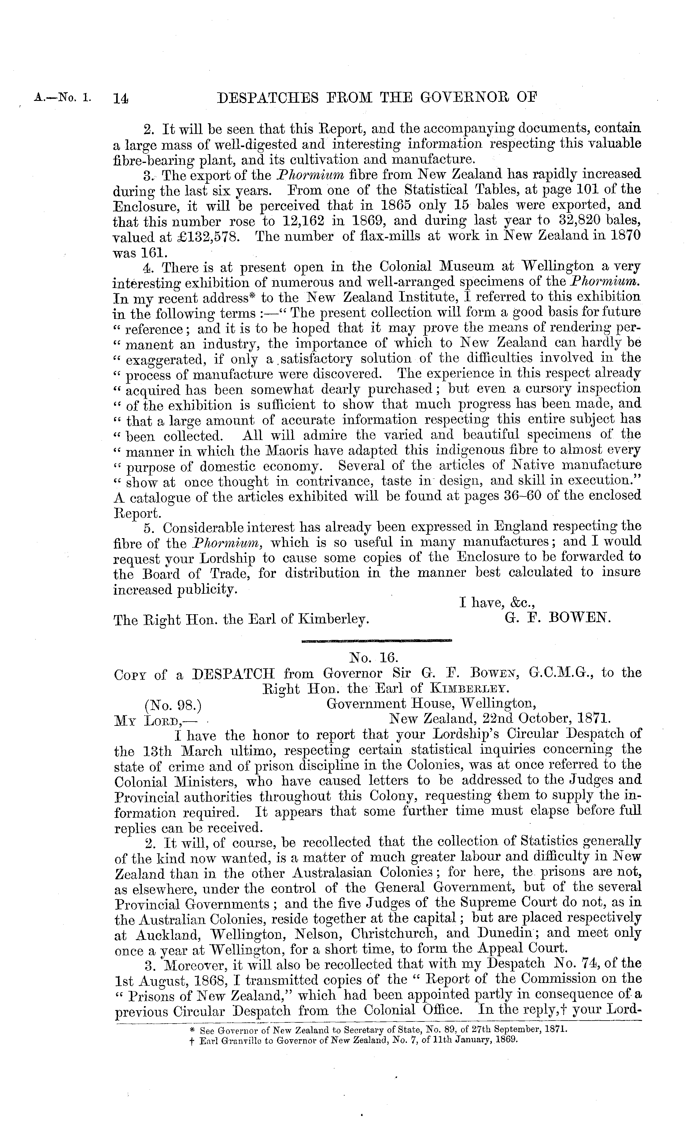 No. 16. Copy of a DESPATCH from Governor Sir G. E. Bowen, G.C.M.G., to the Right Hon. the Earl of Kimbeuley. (No. 98.) Government House, Wellington, My Lord, New Zealand, 22nd October, 1871. I have the honor to report that your Lordship's Circular Despatch of the 13th March ultimo, respecting certain statistical inquiries concerning the state of crime and of prison discipline in the Colonies, was at once referred to the Colonial Ministers, who have caused letters to be addressed to the Judges and Provincial authorities throughout this Colony, requesting them to supply the information required. It appears that some further time must elapse before full replies can be received. 2. It will, of course, be recollected that the collection of Statistics generally of the kind now wanted, is a matter of much greater labour and difficulty in NewZealand than in the other Australasian Colonies; for here, the prisons are not, as elsewhere, under the control of the General Government, but of the several Provincial Governments ; and the five Judges of the Supreme Court do not, as in the Australian Colonies, reside together at the capital; but are placed respectively at Auckland, Wellington, Nelson, Christchurch, and Dunedin; and meet only once a year at Wellington, for a short time, to form the Appeal Court. 3. 'Moreover, it will also be recollected that with my Despatch No. 74 of the Ist August, 1868, I transmitted copies of the " Report of the Commission on the " Prisons of New Zealand," which had been appointed partly in consequence of a previous Circular Despatch from the Colonial Office. In the reply,t your Lord- * See Governor of New Zealand to Secretary of State, No. 89, of 27th September, 1871. t Earl G-rarmllo to Governor of New Zealand, No. 7, of 11th January, 1869.