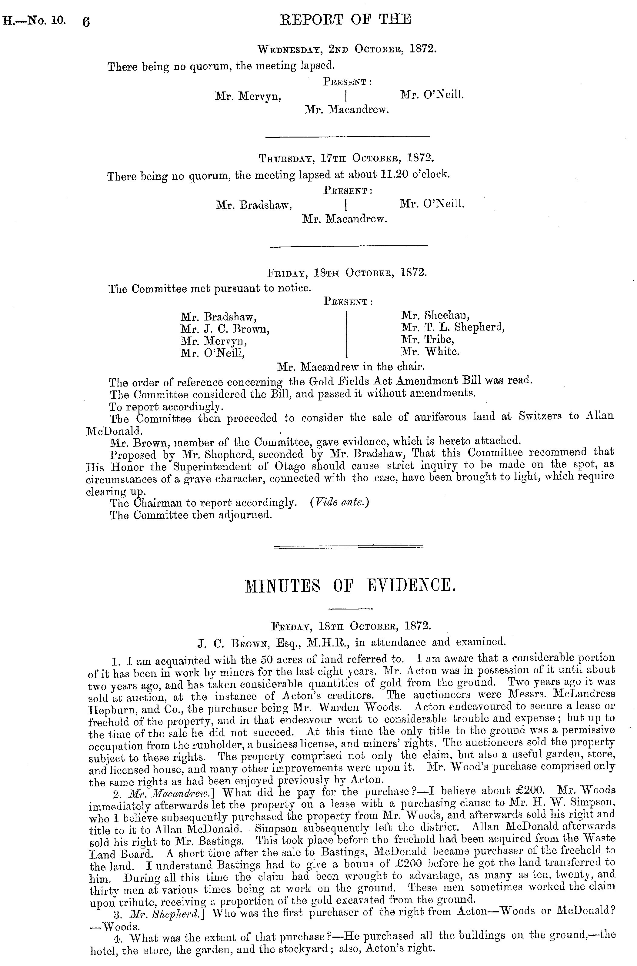 MINUTES OF EVIDENCE. Friday, 18th October, 1872. J. C. Brown, Esq., M.H.E., in attendance and examined. 1. lam acquainted with the 50 acres of land referred to. lam aware that a considerable portion of it has been in work by miners for the last eight years. Mr. Acton was in possession of it until about two years ago, and has taken considerable quantities of gold from the ground. Two years ago it was sold at auction, at the instance of Acton's creditors. The auctioneers were Messrs. McLandress Hepburn, and Co., the purchaser being Mr. Warden Woods. Acton endeavoured to secure a lease or freehold of the property, and in that endeavour went to considerable trouble and expense; but up to the time of the sale he did not succeed. At this time the only title to the ground was a permissive occupation from the runholder, a business license, and miners' rights. The auctioneers sold the property subject to these rights. The property comprised not only the claim, but also a useful garden, store, and' licensed house, and many other improvements were upon it. Mr. Wood's purchase comprised only the same rights as had been enjoyed previously by Acton. 2. Mr. Macandrew.] What did he pay for the purchase?—l believe about £200. Mr. Woods immediately afterwards let the property on a lease with a purchasing clause to Mr. H. W. Simpson, who I believe subsequently purchased the property from Mr. Woods, and afterwards sold his right and title to it to Allan McDonald. Simpson subsequently left the district. Allan McDonald afterwards sold his right to Mr. Bastings. This took place before the freehold had been acquired from the Waste Land Board. A short time after the sale to Bastings, McDonald became purchaser of the freehold to the land. I understand Bastings had to give a bonus of £200 before he got the land transferred to him. During all this time the claim had been wrought to advantage, as many as ten, twenty, and thirty men at various times being at work on the ground. These men sometimes worked the claim upon tribute, receiving a proportion of the gold excavated from the ground. 3. Mr. Shepherd.] Who was the first purchaser of the right from Acton—Woods or McDonald? —Woods. 4. What was the extent of that purchase ?—He purchased all the buildings on the ground,—the hotel, the store, the garden, and the stockyard; also, Acton's right.