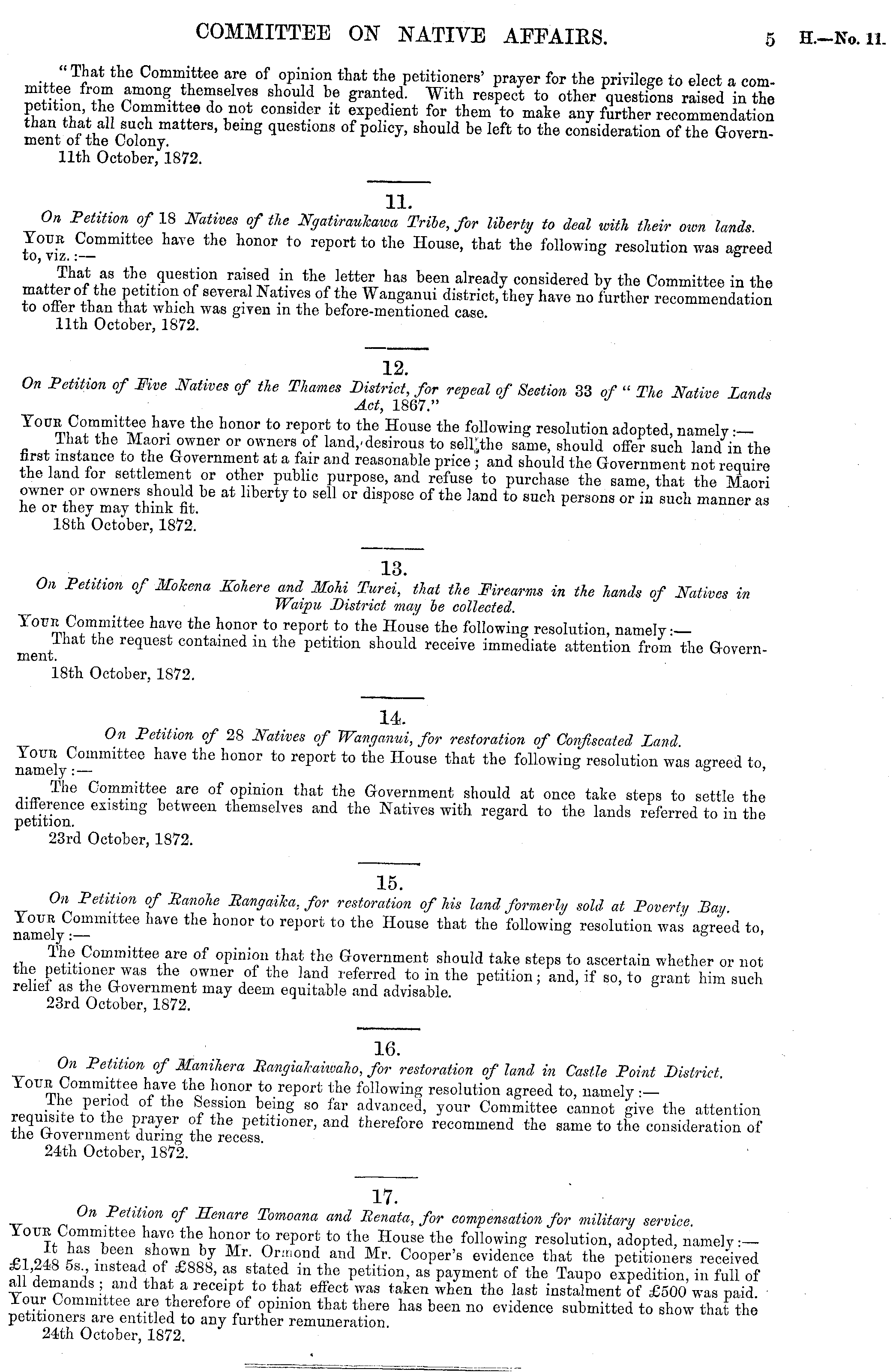 11. On Petition of 18 Natives of the Ngatiraukawa Tribe, for liberty to deal with their own lands Toue Committee have the honor to report to the House, that the following resolution was agreed That as the question raised in the letter has been already considered by the Committee in the matter of the petition of several Natives of the Wanganui district, they have no further recommendation to otter than that which was given in tho before-mentioned case 11th October, 1872.