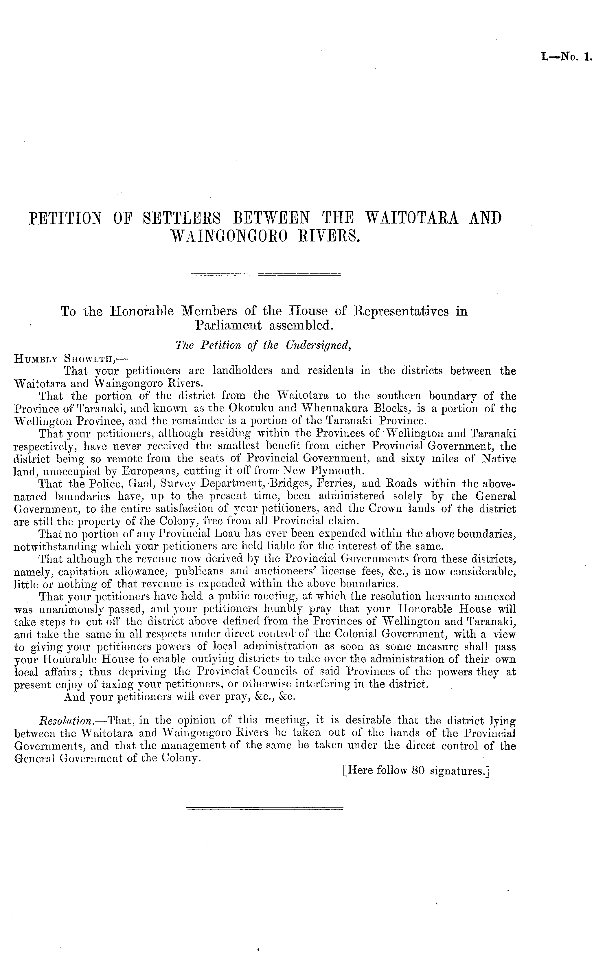 To the Honorable Members of the House of Representatives in Parliament assembled. The Petition of the Undersigned, Humbly Siioweth, — That your petitioners are landholders and residents in the districts between the Waitotara and Waingongoro Rivers. That the portion of the district from the Waitotara to the southern boundary of the Province of Taranaki, and known as the Okotuku and Whenuakura Blocks, is a portion of the Wellington Province, and the remainder is a portion of the Taranaki Province. That your petitioners, although residing within the Provinces of Wellington and Taranaki respectively, have never received the smallest benefit from either Provincial Government, the district being so remote from the seats of Provincial Government, and sixty miles of Native land, unoccupied by Europeans, cutting it off from- New Plymouth. That the Police, Gaol, Survey Department, Bridges, Perries, and Roads within the abovenamed boundaries have, up to the present time, been administered solely by the General Government, to the entire satisfaction of your petitioners, and the Crown lands of the district are still the property of the Colony, free from all Provincial claim. That no portion of any Provincial Loan has ever been expended within the above boundaries, notwithstanding which your petitioners are held liable for the interest of the same. That although the revenue now derived by the Provincial Governments from these districts, namely, capitation allowance, publicans and auctioneers'" license fees, &c, is now considerable, little or nothing of that revenue is expended within the above boundaries. That your petitioners have held a public meeting, at which the resolution hereunto annexed was unanimously passed, and your petitioners humbly pray that your Honorable House will take steps to cut off the district above defined from the Provinces of Wellington and Taranaki, and take the same in all respects under direct control of the Colonial Government, with a view to giving your petitioners powers of local administration as soon as some measure shall pass your Honorable House to enable outlying districts to take over the administration of their own local affairs; thus depriving the Provincial Councils of said Provinces of the powers they at present enjoy of taxing your petitioners, or otherwise interfering in the district. And your petitioners will ever pray, &c, &c. Resolution. —That, in the opinion of this meeting, it is desirable that the district lying between the Waitotara and Waingongoro Rivers be taken out of the hands of the Provincial Governments, and that the management of the same be taken under the direct control of the General Government of the Colony. [Here follow 80 signatures.]